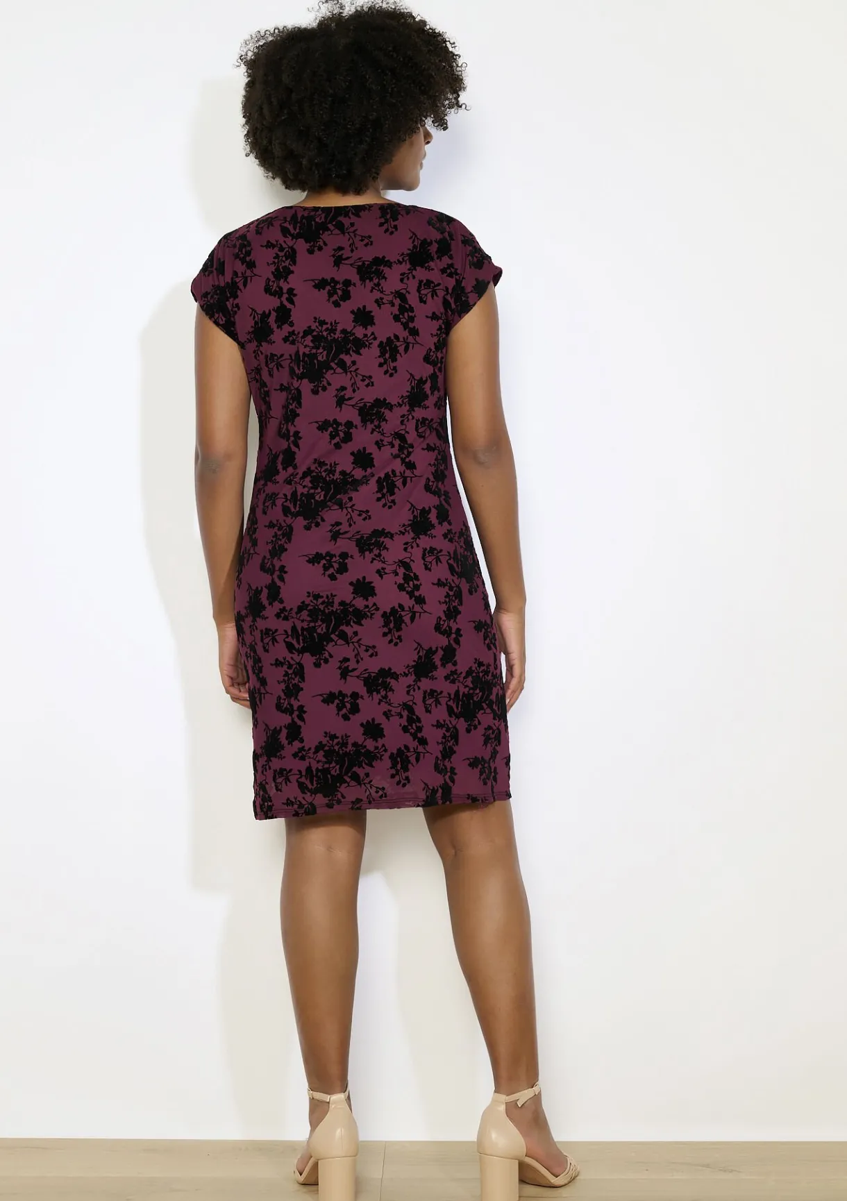 Fluweel en bloemenprint komen samen in deze aansluitende jurk. Een flatterend silhouet met een vrouwelijke flair.