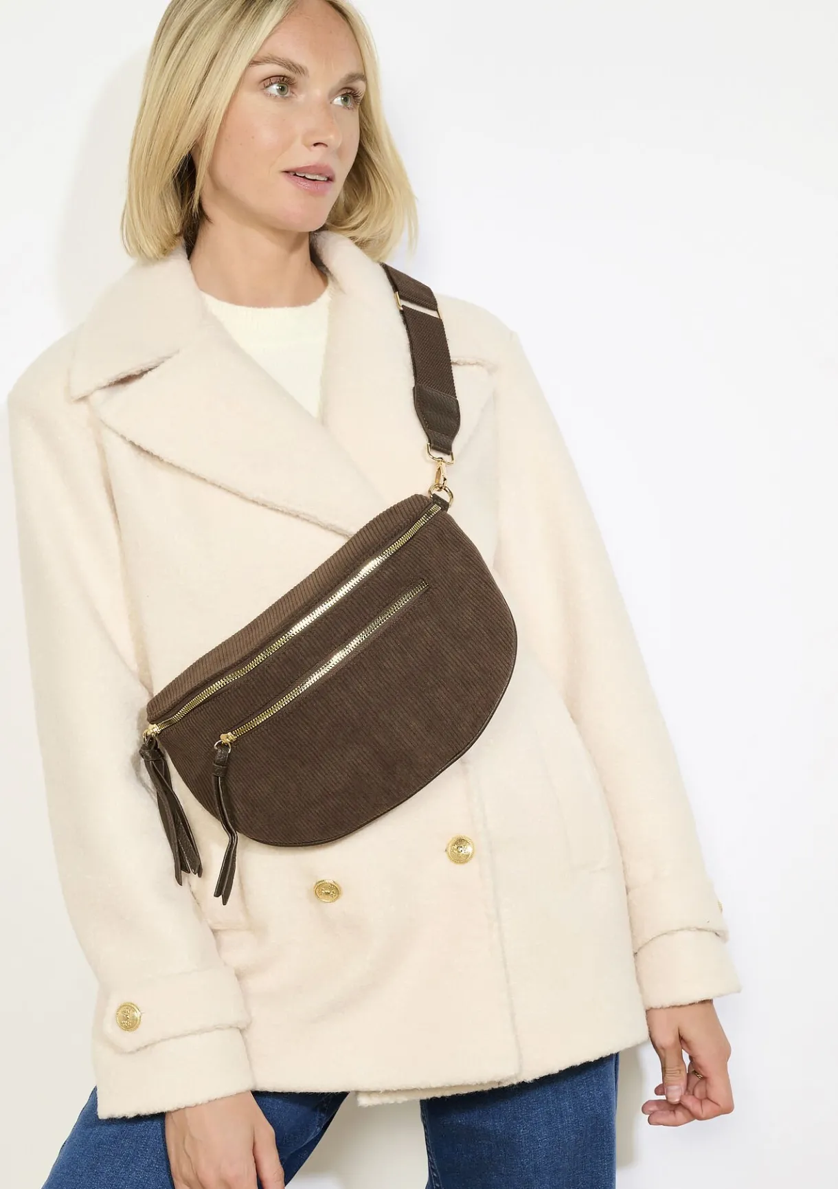 Ribfluweel met twee ritsen: casual én praktisch. Afneembare schouderband.