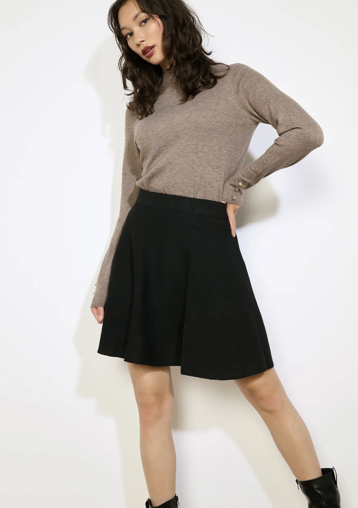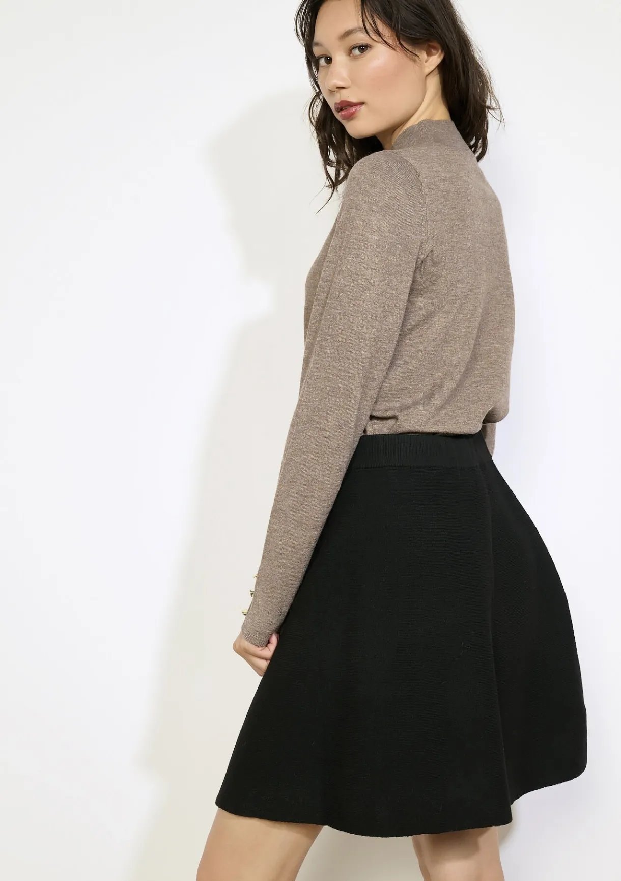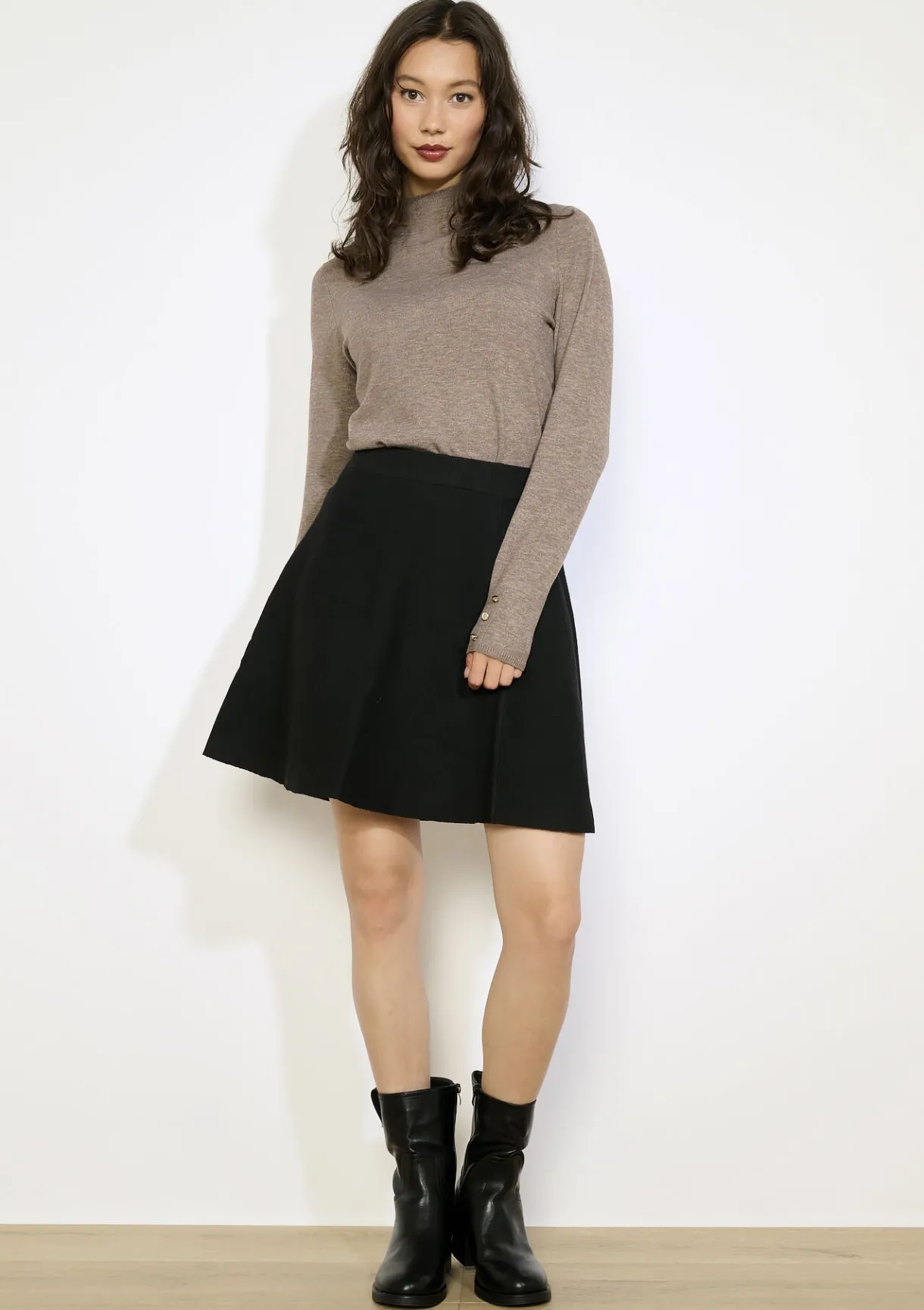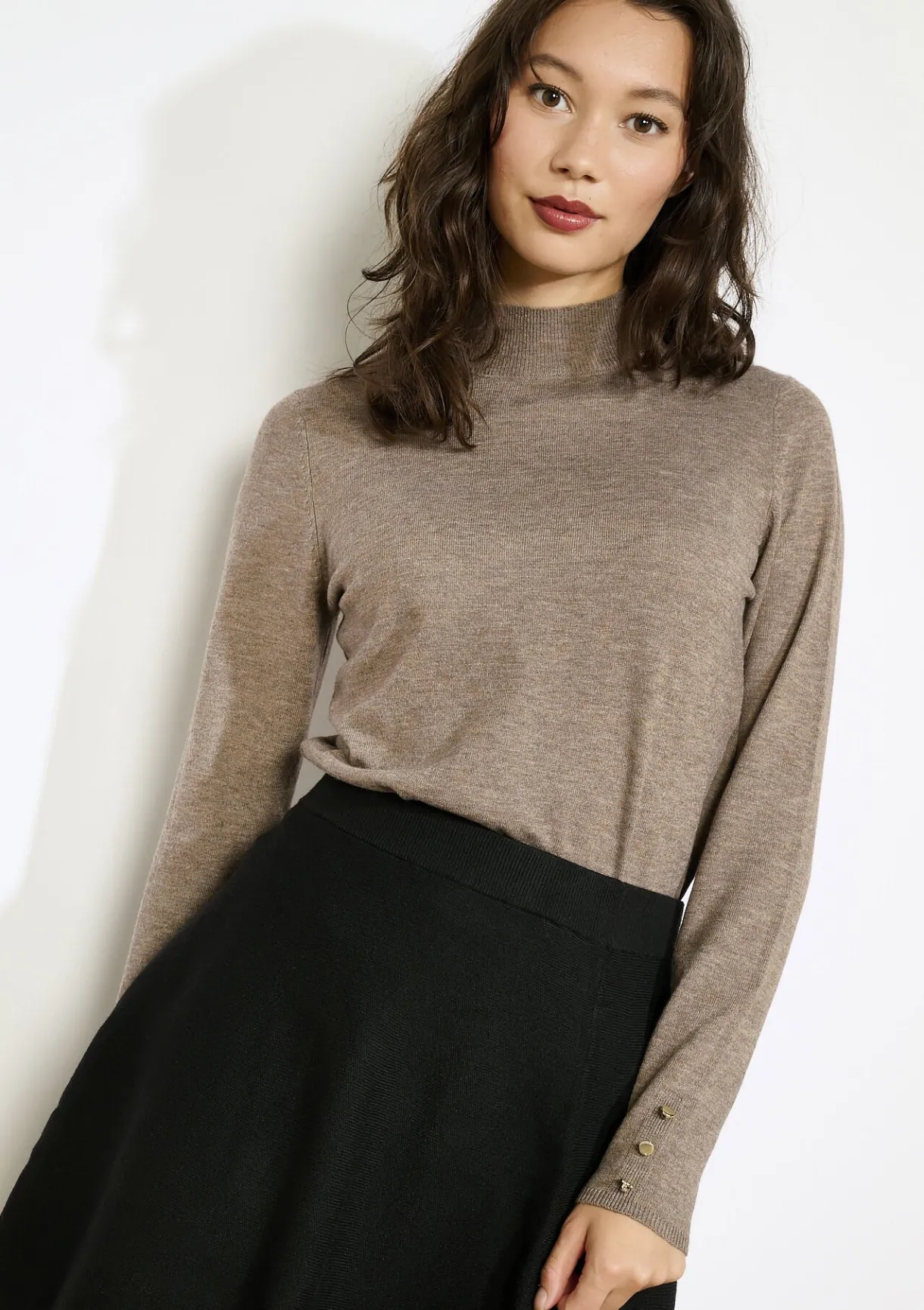 Een zachte coltrui met verfijnde gouden knopen aan de mouw, subtiel en stijlvol.