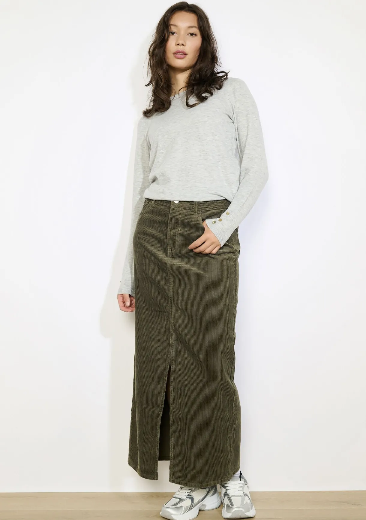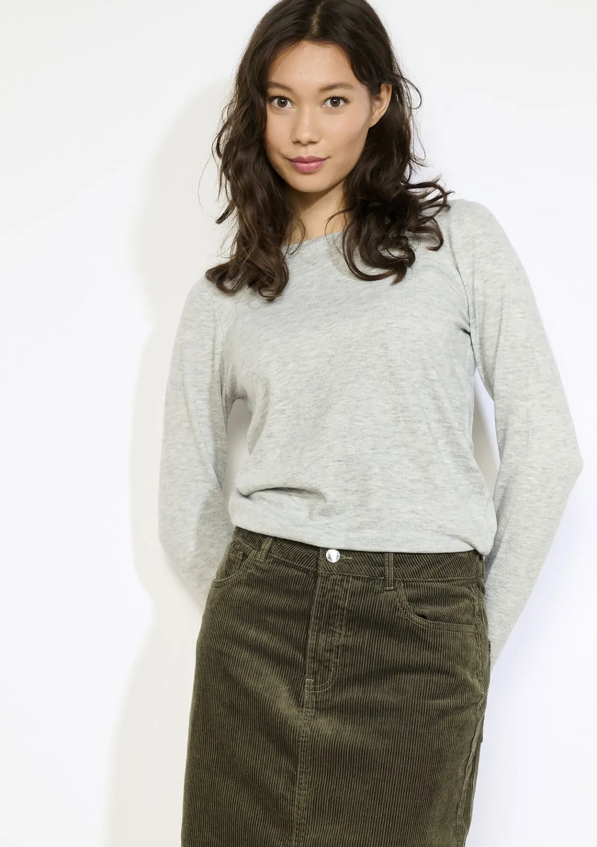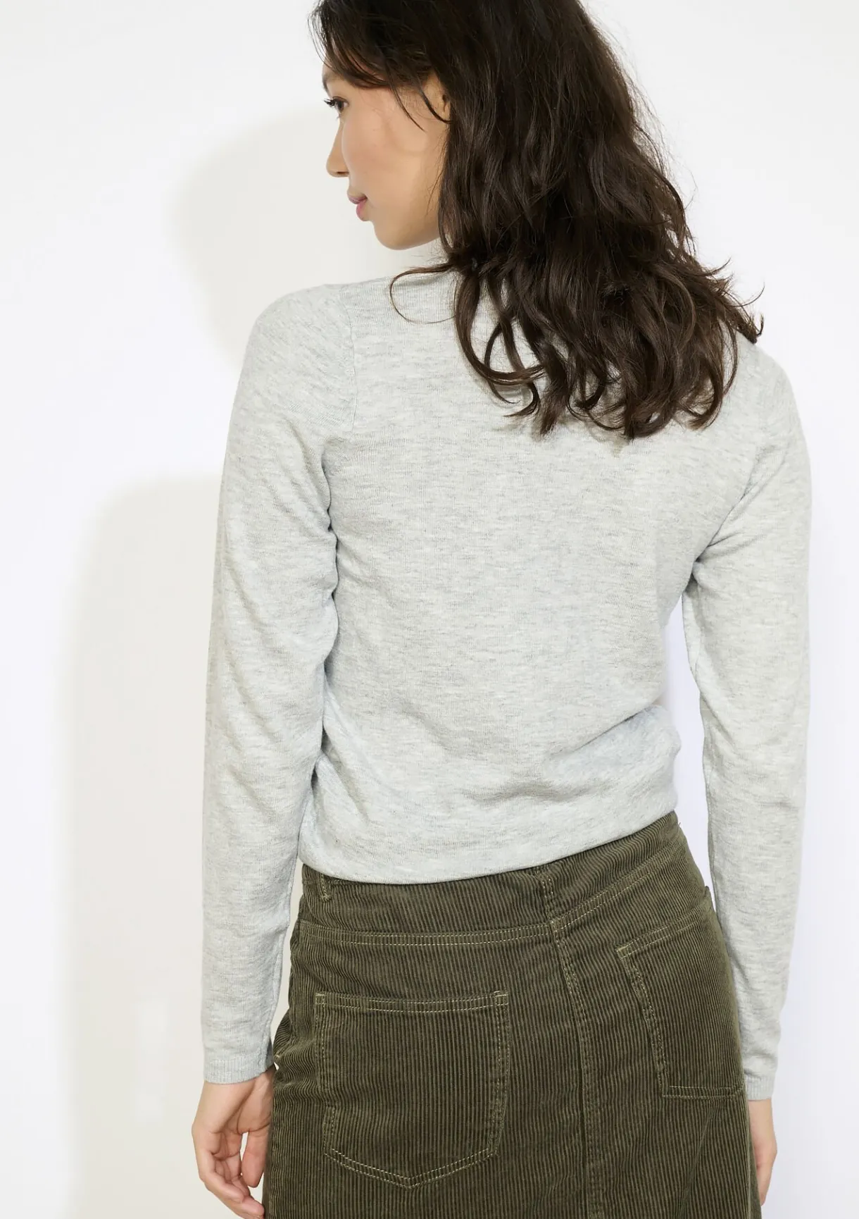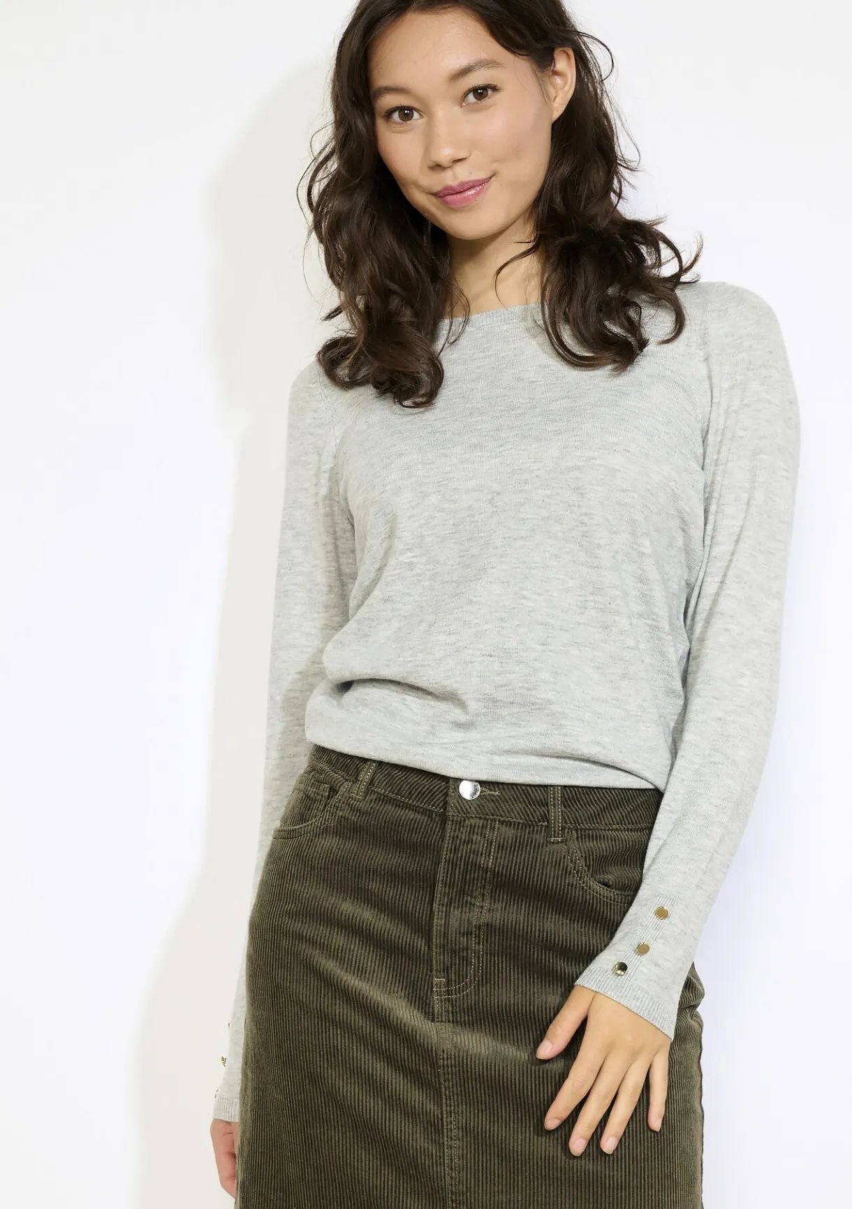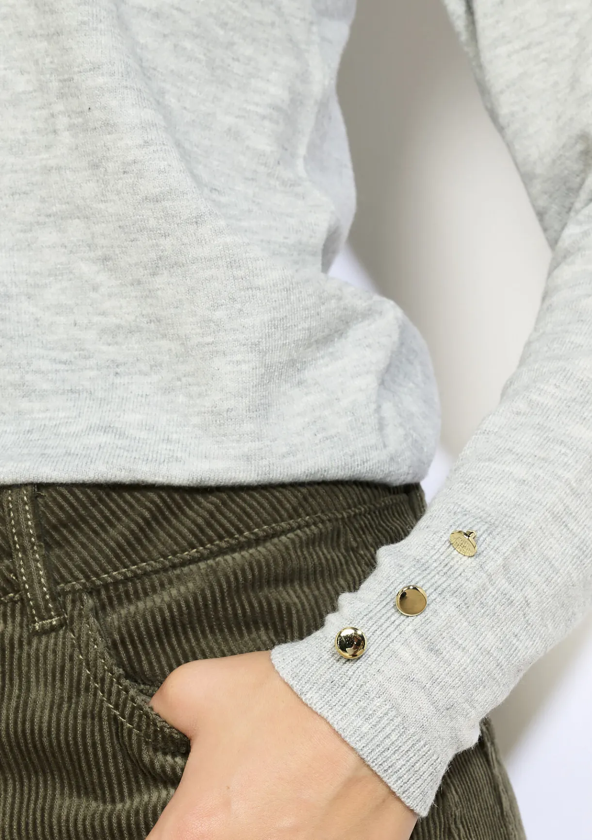 Een zachte, verfijnde trui met gouden knopen aan de mouw voor een subtiele touch.