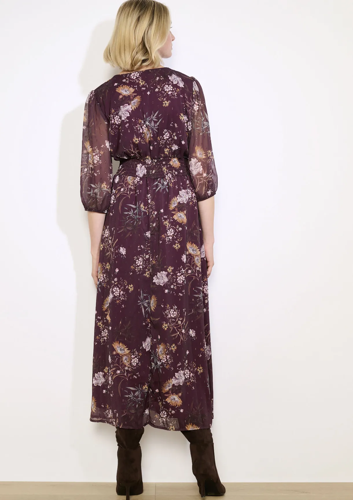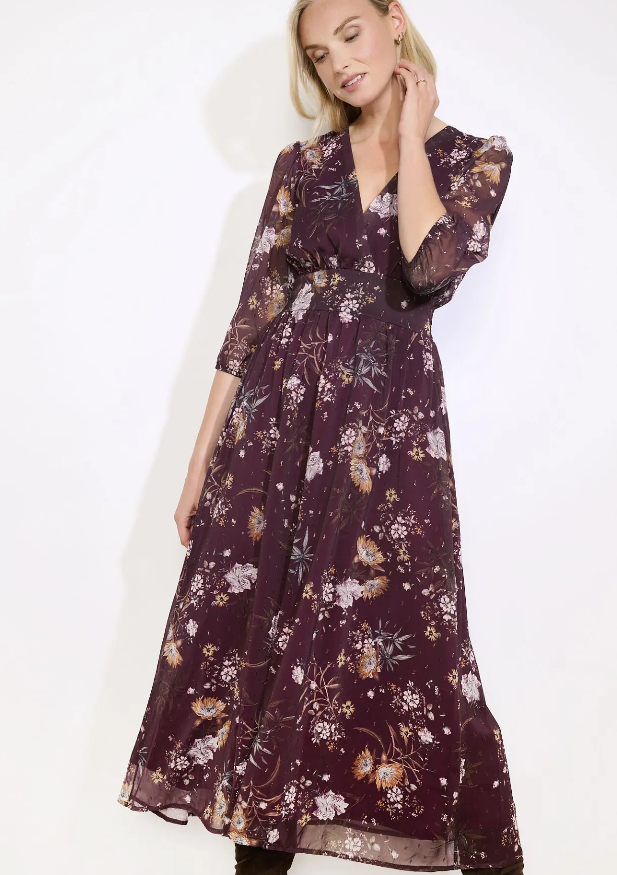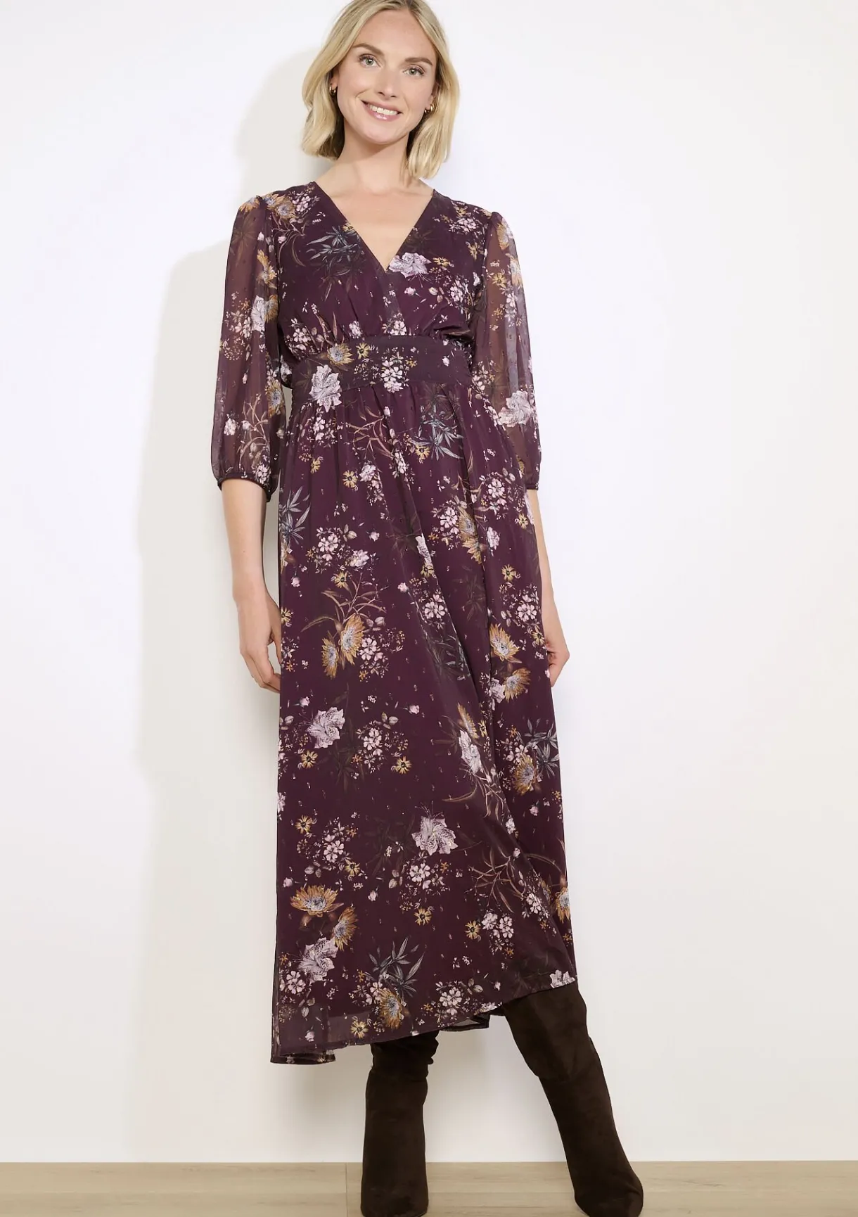 Een jurk vol bloemenpracht die soepel meebeweegt. Overslaghals, korte mouwen en een tailleband voor een romantisch accent.