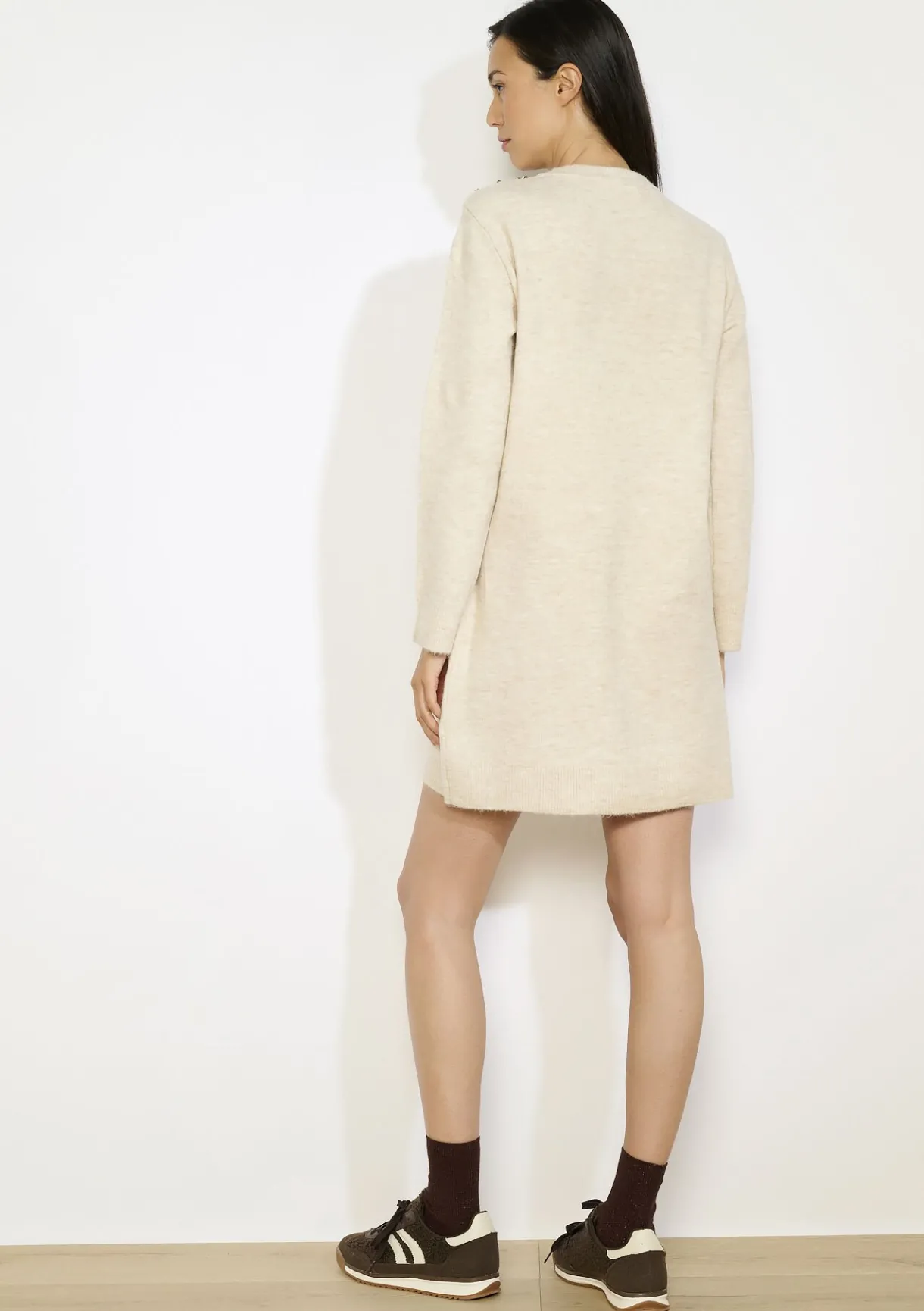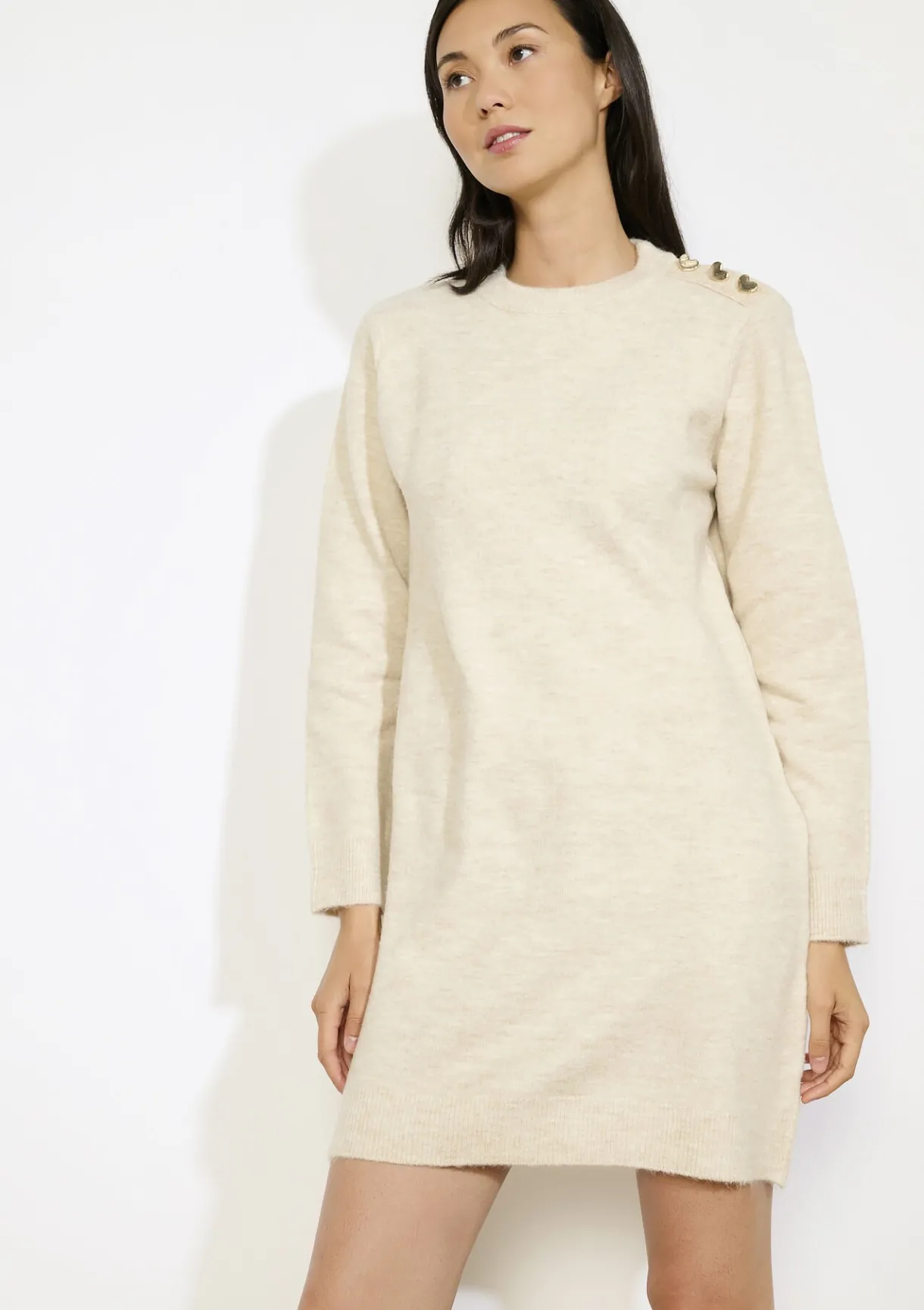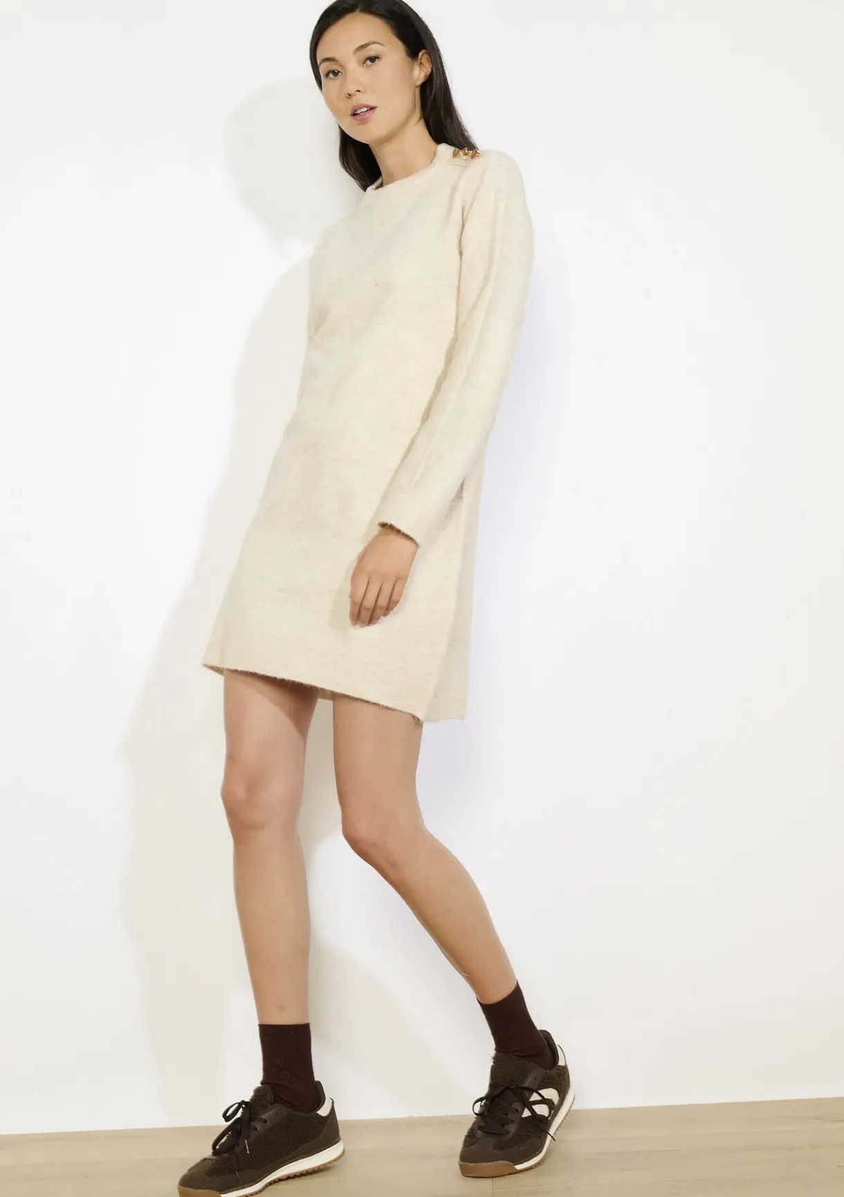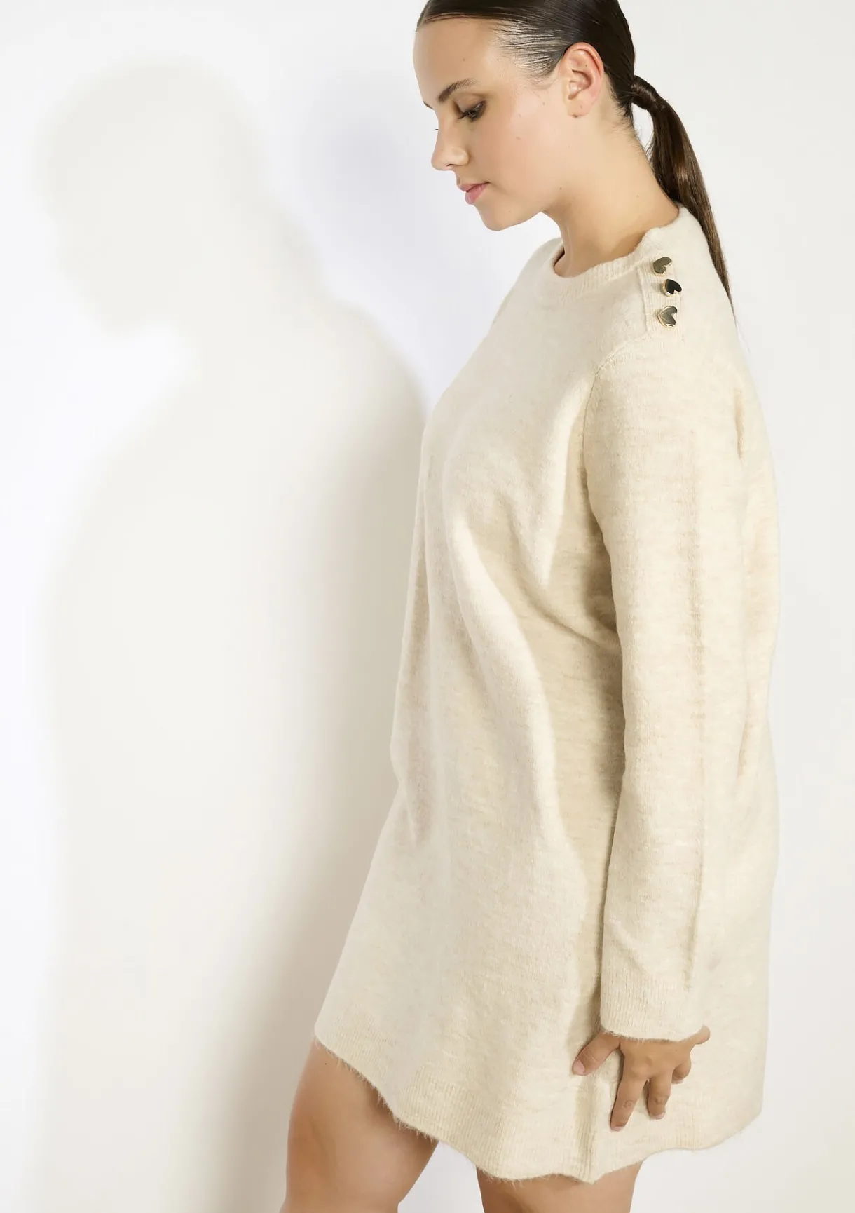 Zachte gebreide jurk met hartvormige knopen op de schouders. Eenvoud met een vleugje romantiek.