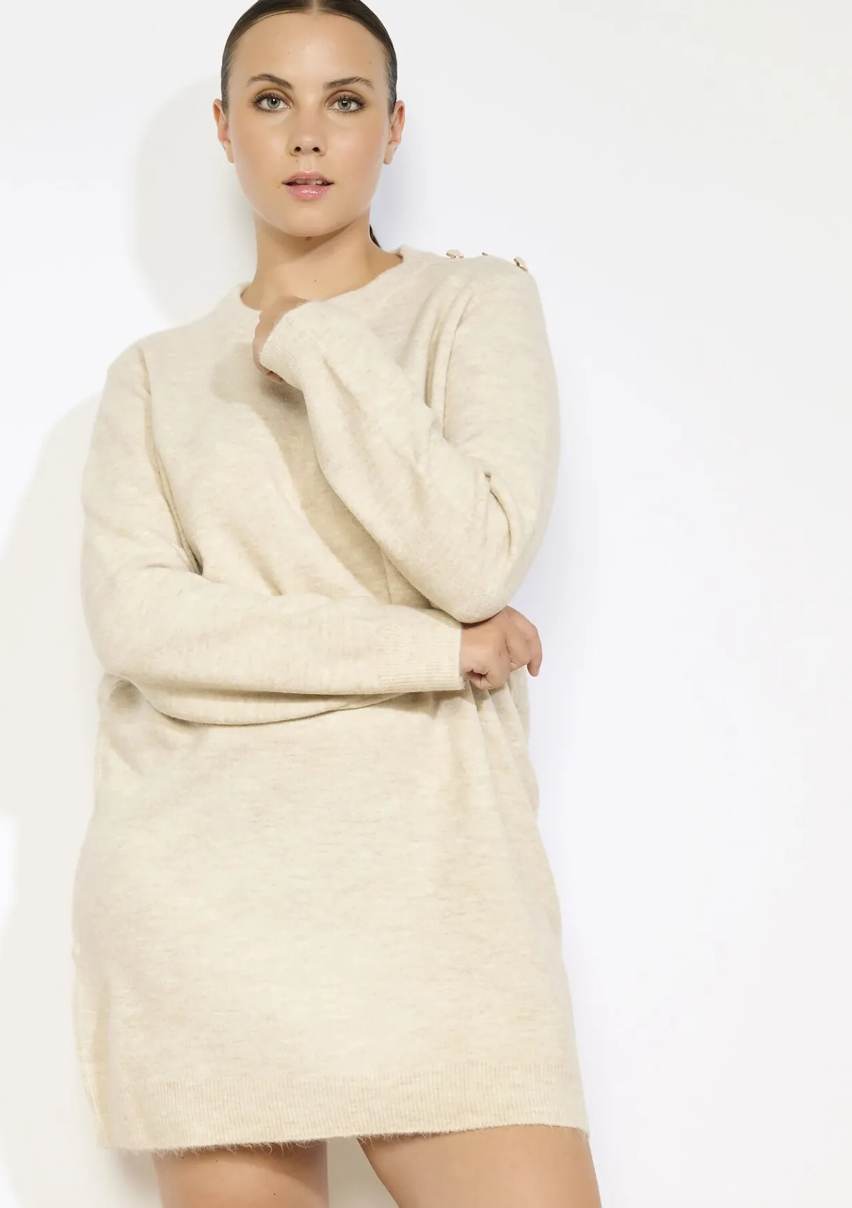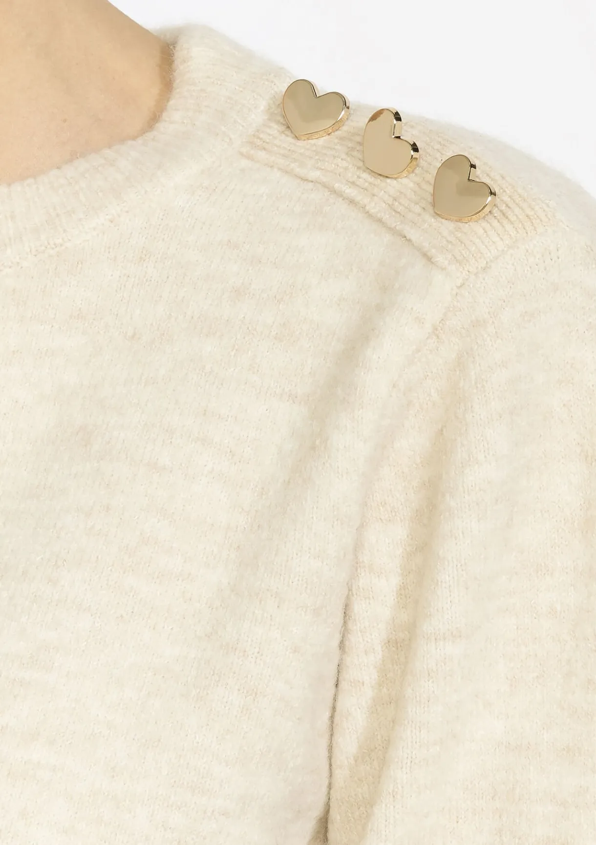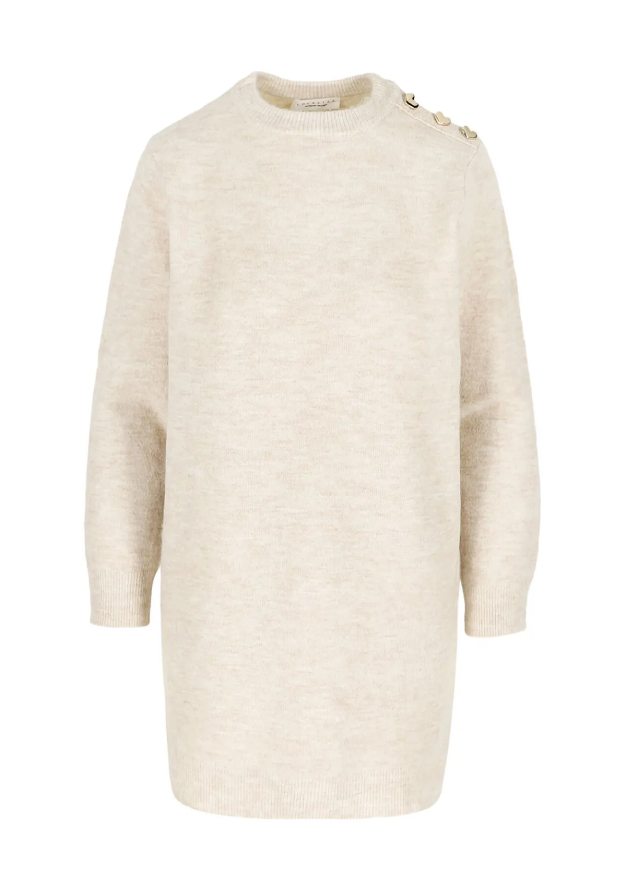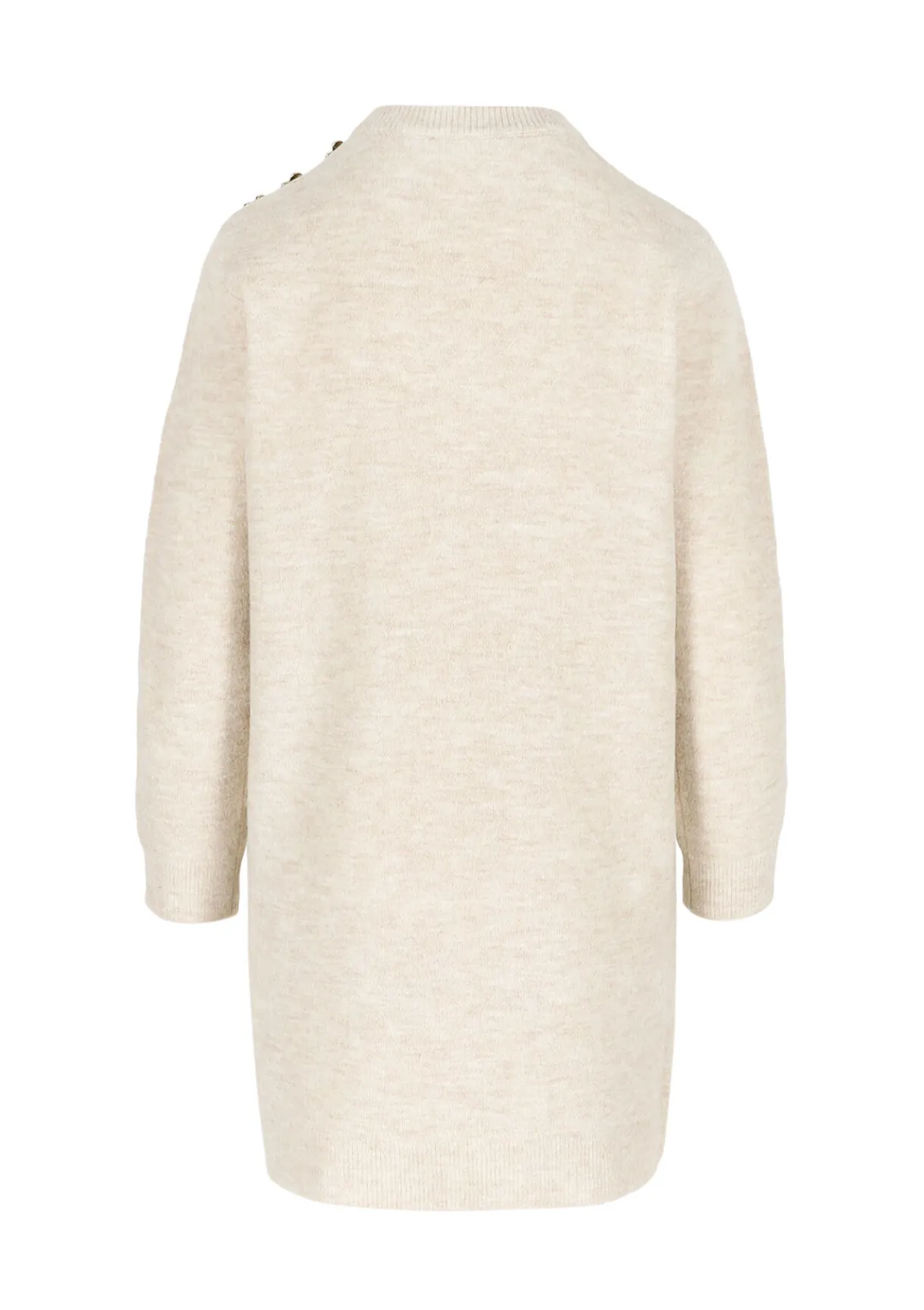 Zachte gebreide jurk met hartvormige knopen op de schouders. Eenvoud met een vleugje romantiek.