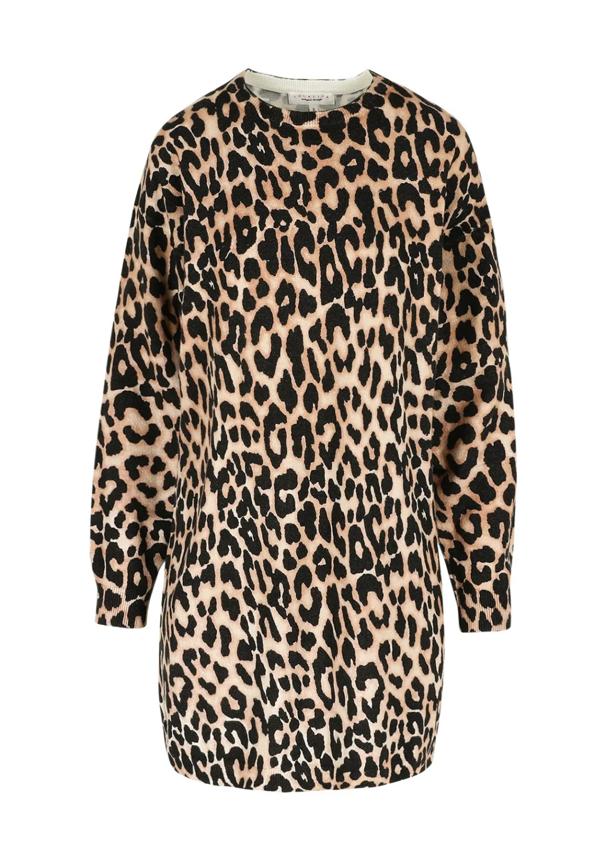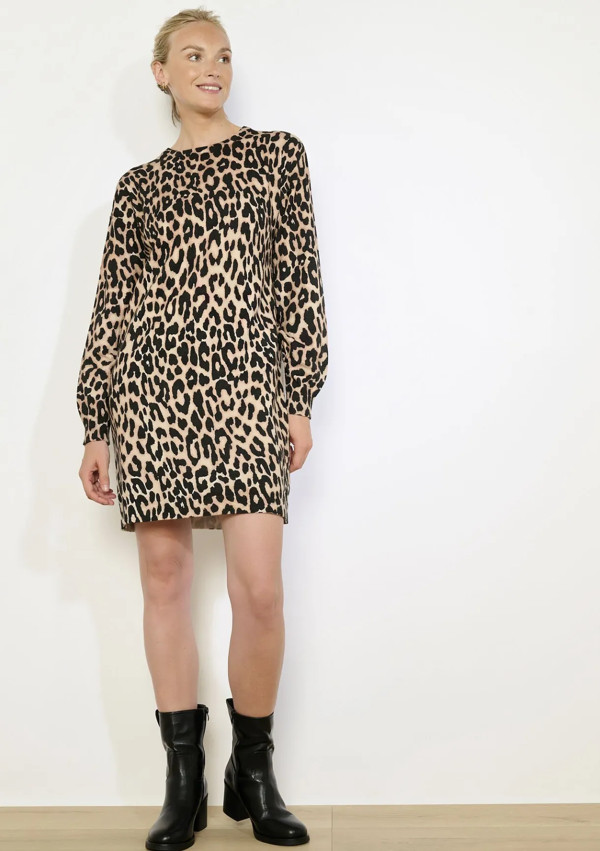 Een comfortabele sweaterjurk met een opvallende leopardprint voor elke dag.