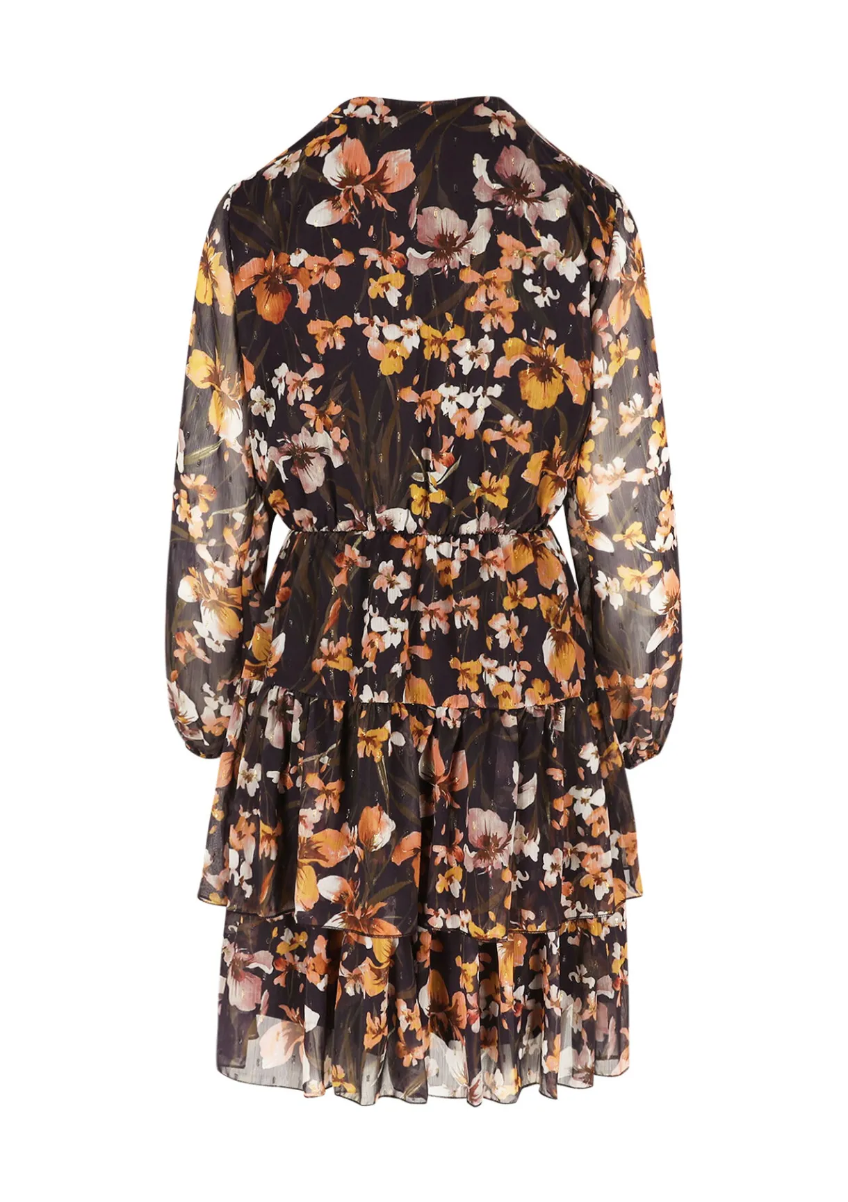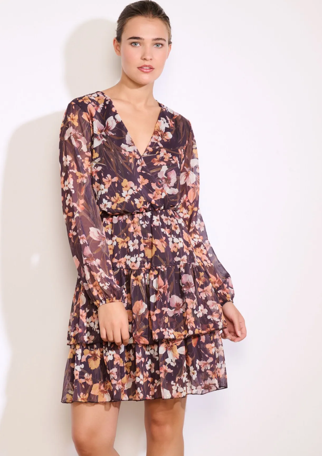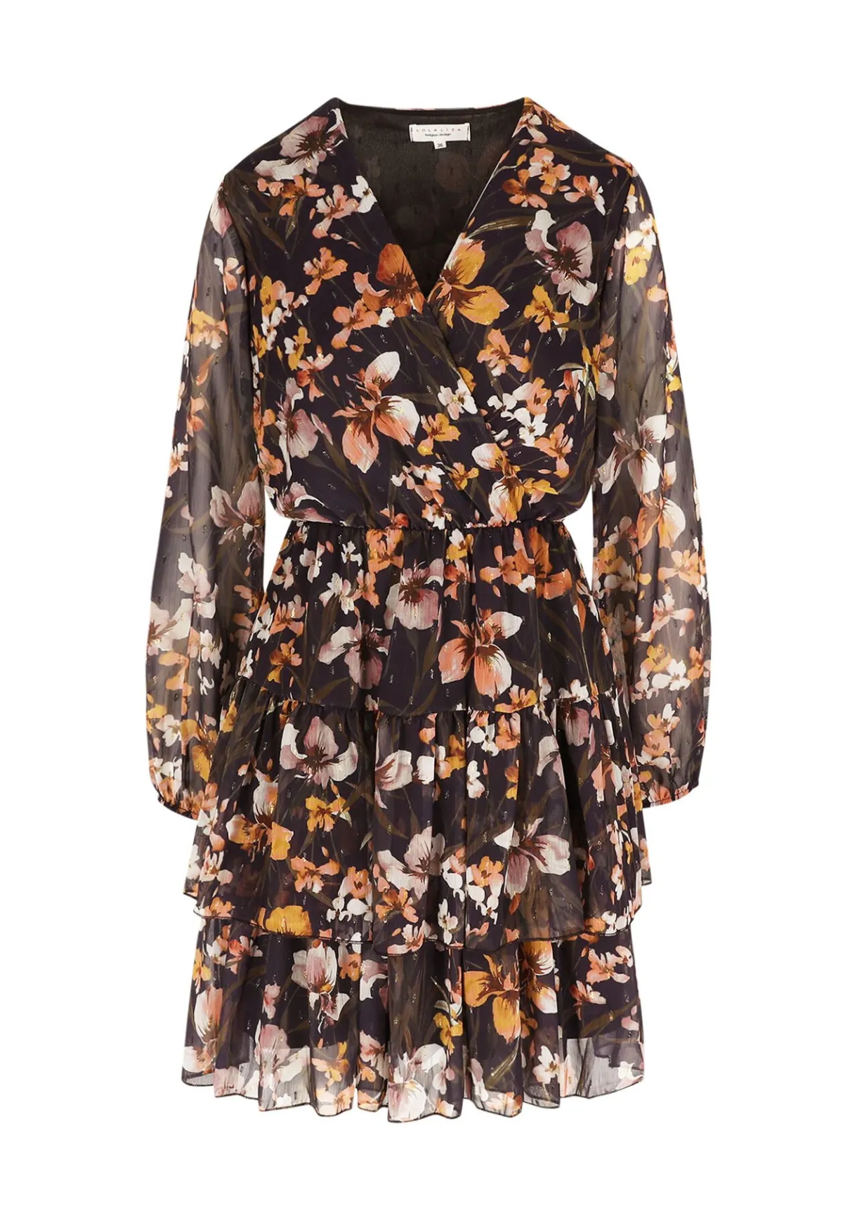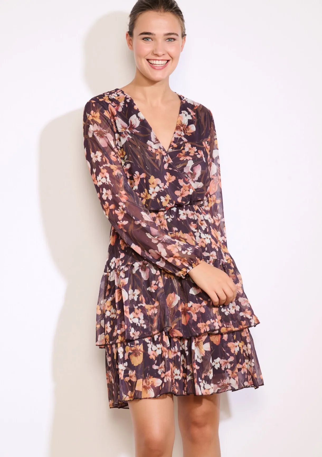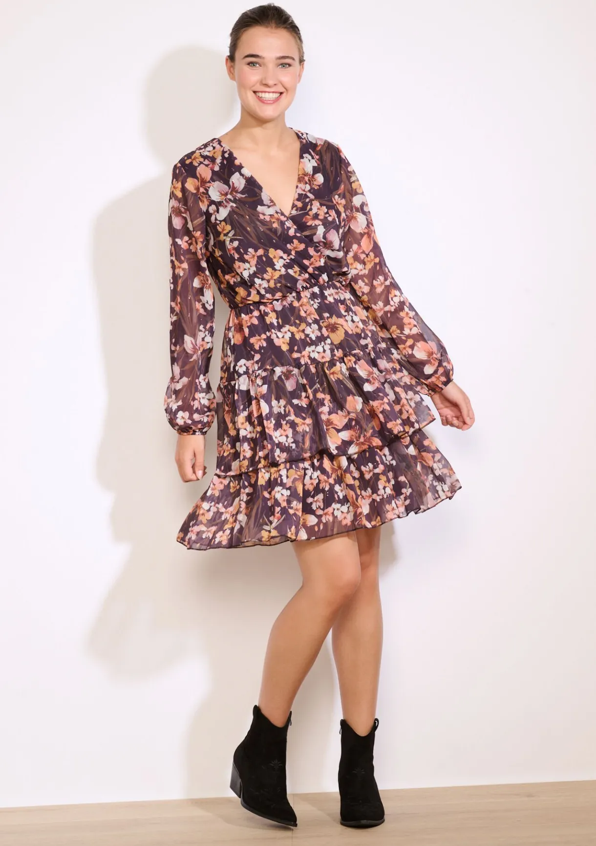 Een speelse korte jurk met luchtige ruches en een levendige bloemenprint. De wikkelhalslijn en transparante mouwen zorgen voor een romantisch accent.