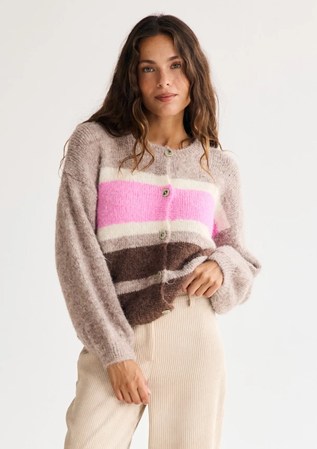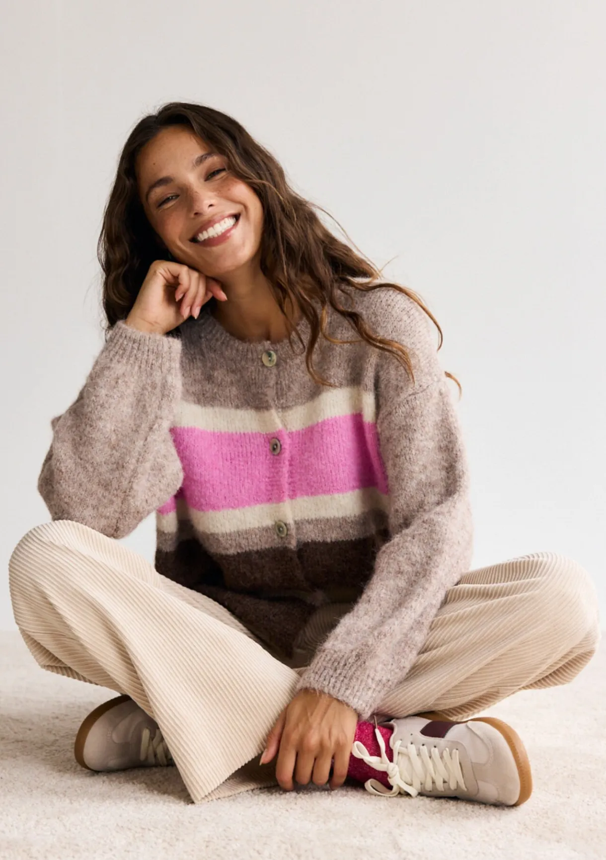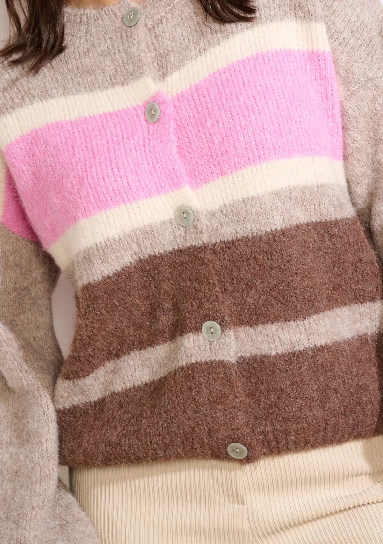 Zacht vest met brede strepen en parelmoerknopen. Een vrolijke toevoeging voor frisse dagen.