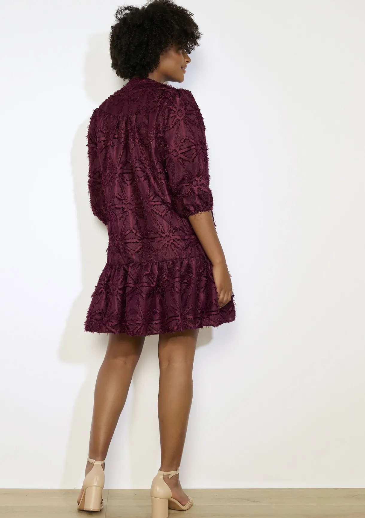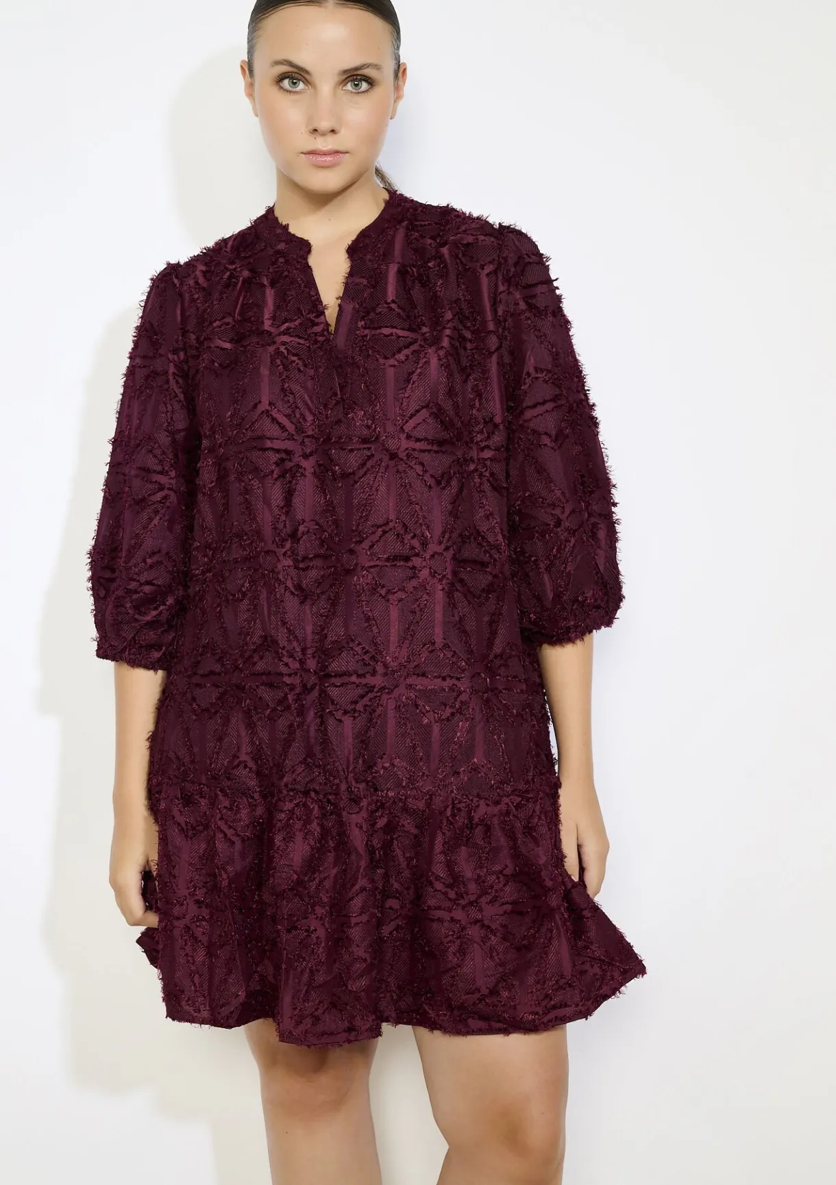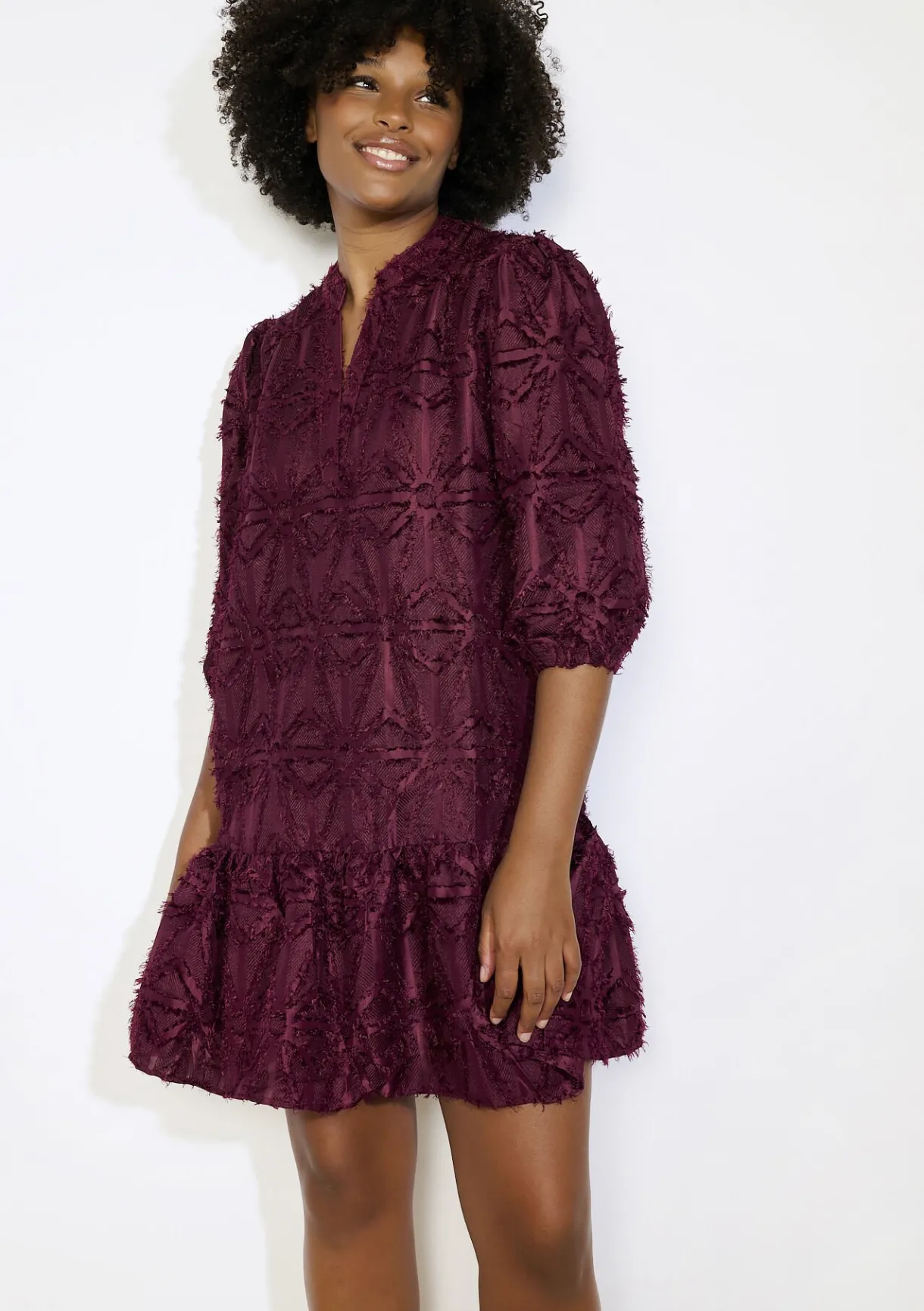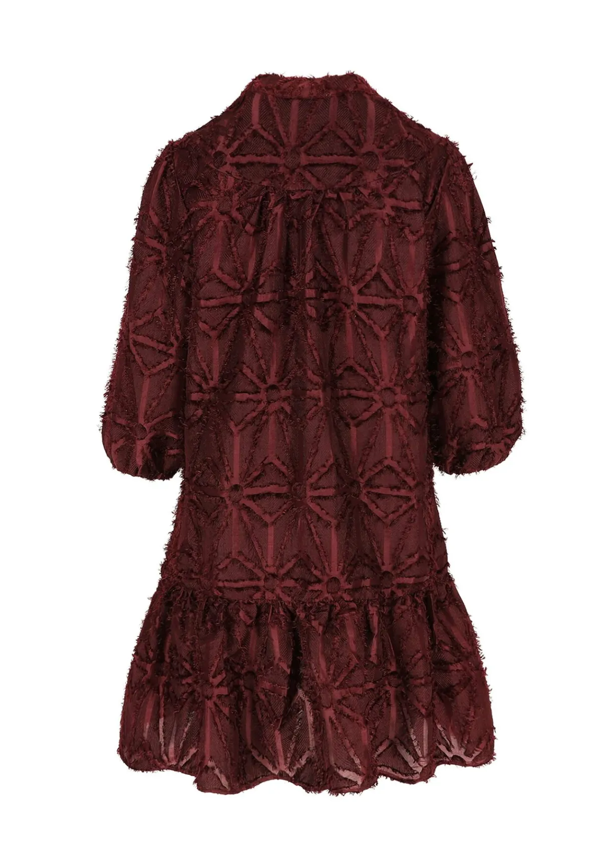 Luchtige elegantie ontmoet structuur: de jacquard stof en pofmouwen geven deze jurk een verfijnde, vrouwelijke uitstraling.