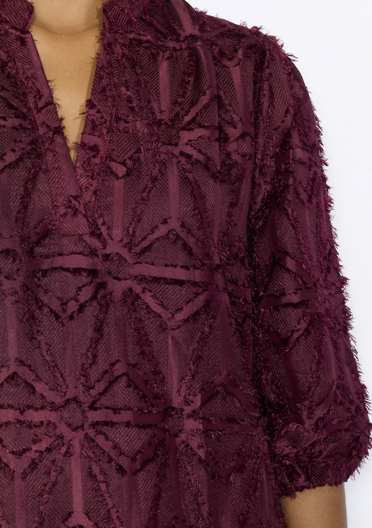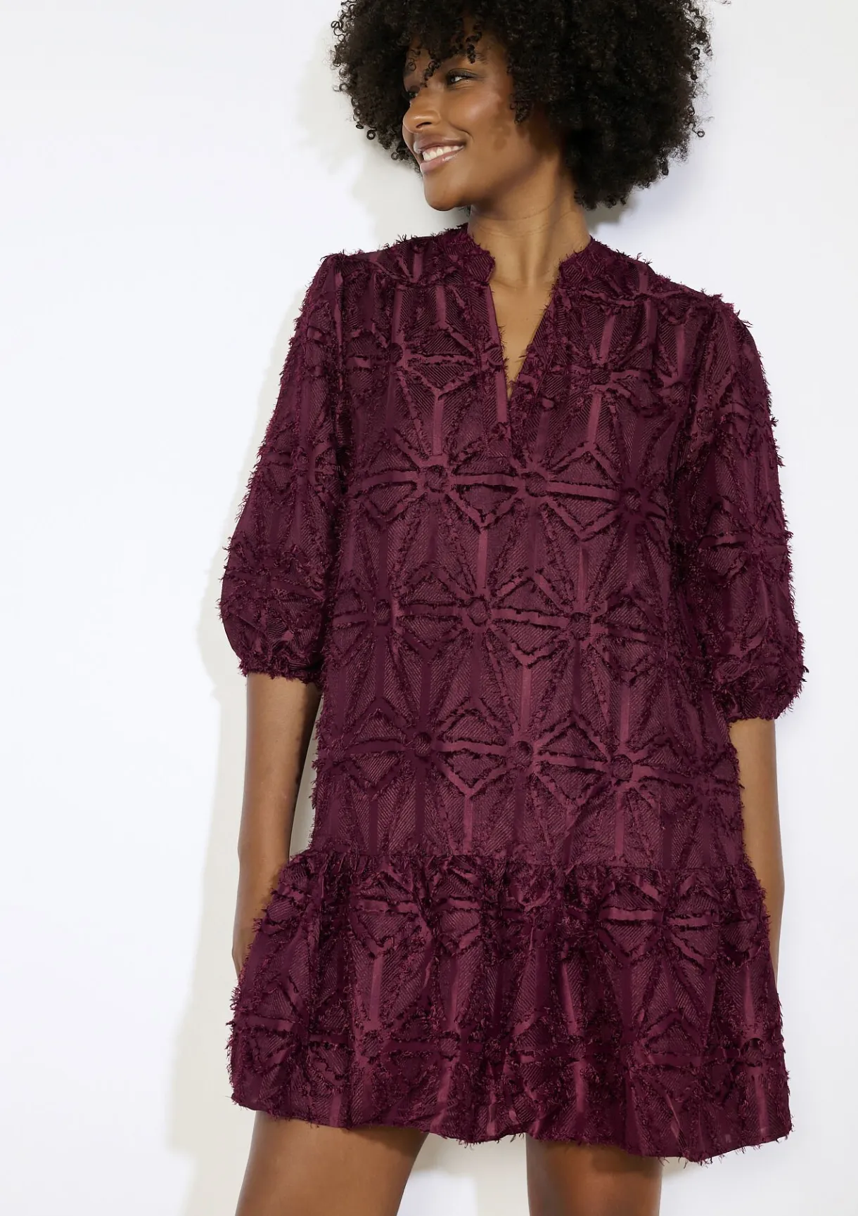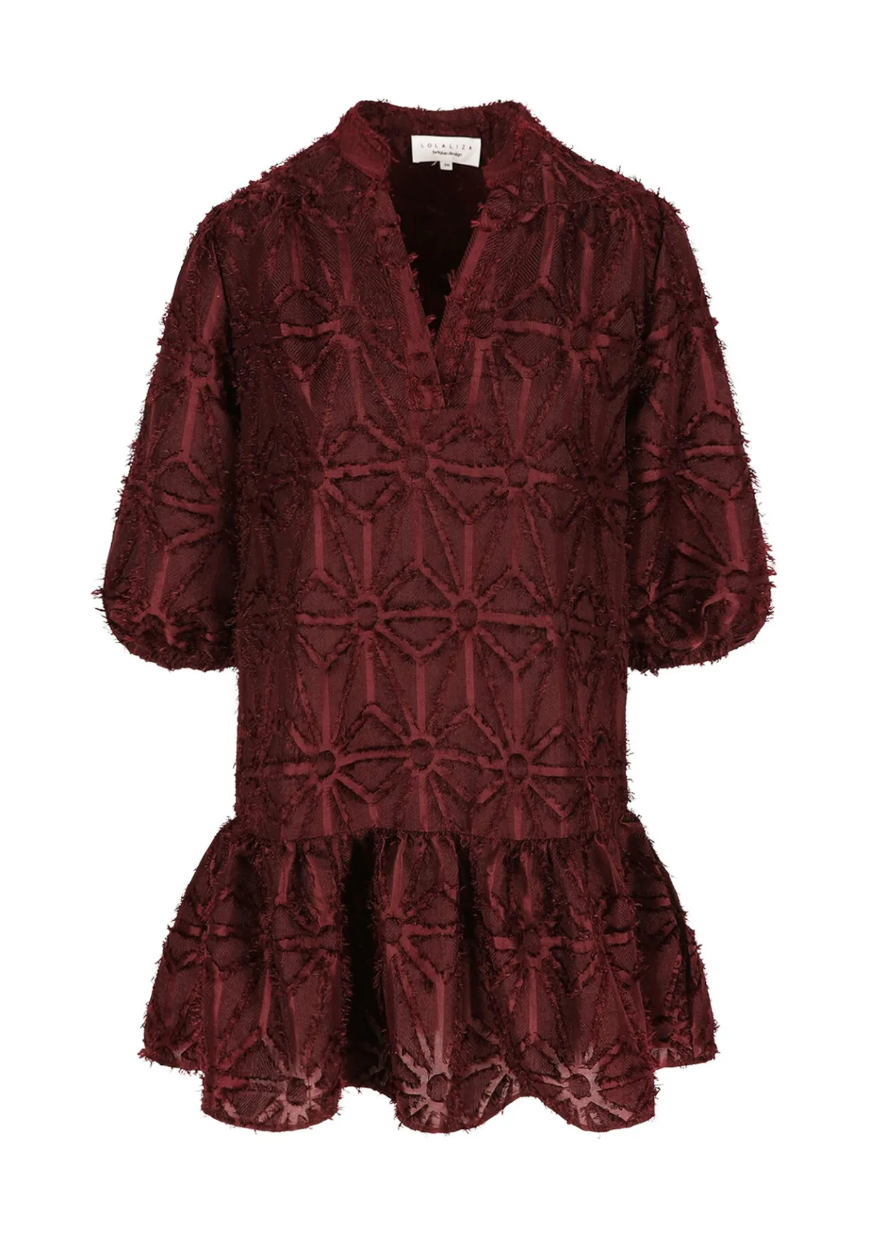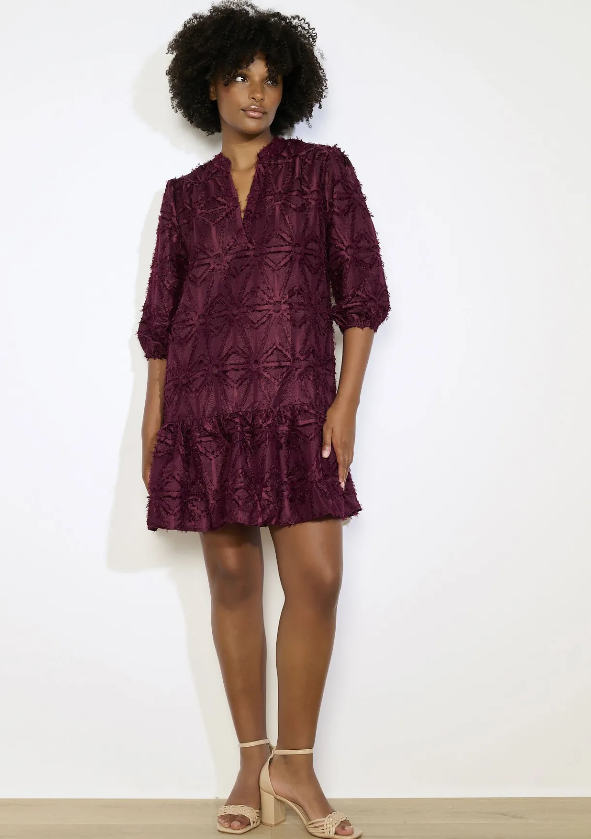 Luchtige elegantie ontmoet structuur: de jacquard stof en pofmouwen geven deze jurk een verfijnde, vrouwelijke uitstraling.