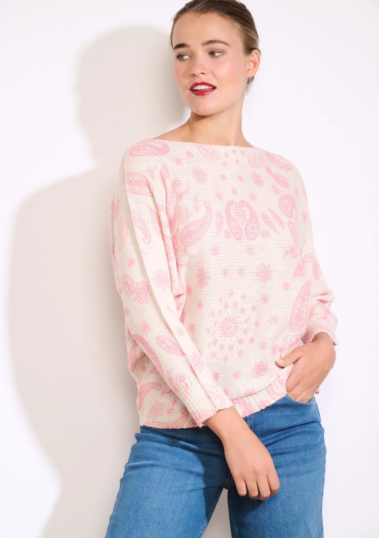 Trui met boothals en jacquard paisleymotief. Een moderne interpretatie van bohemien finesse.