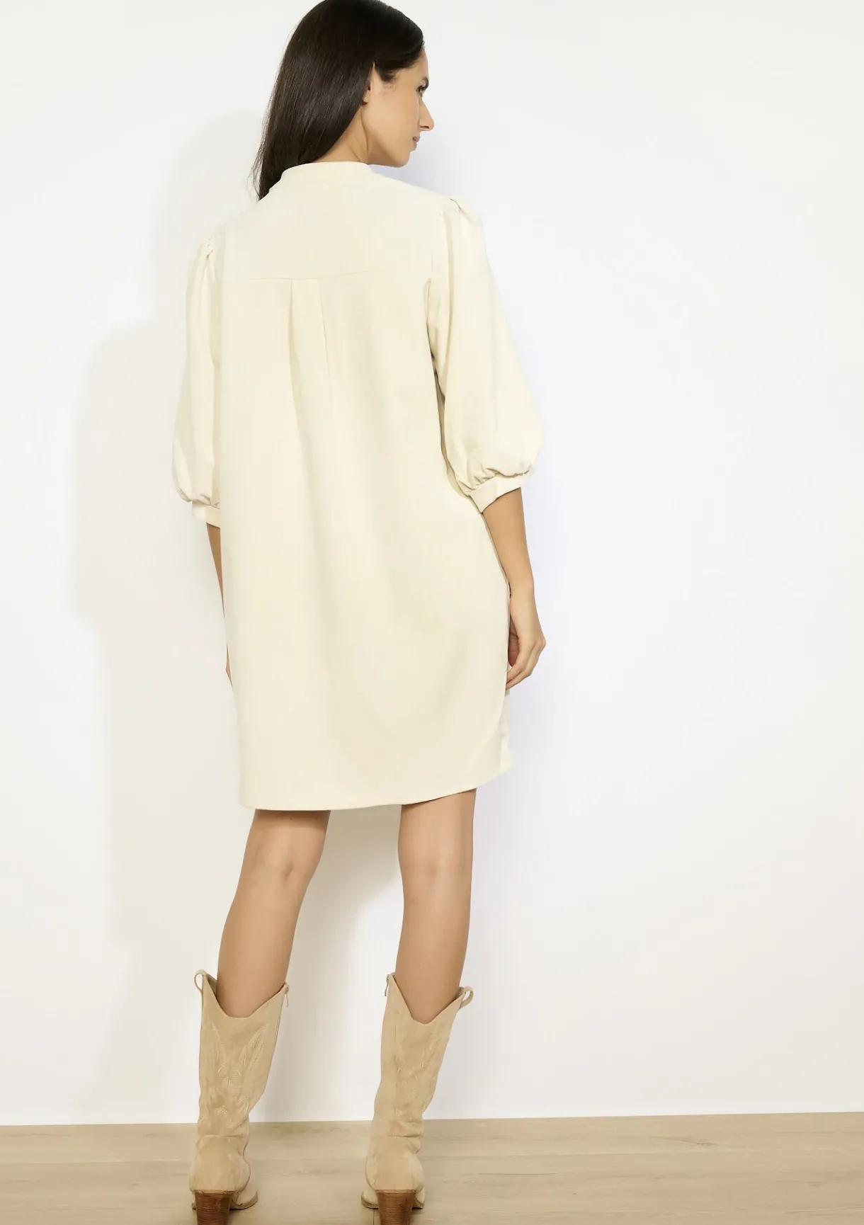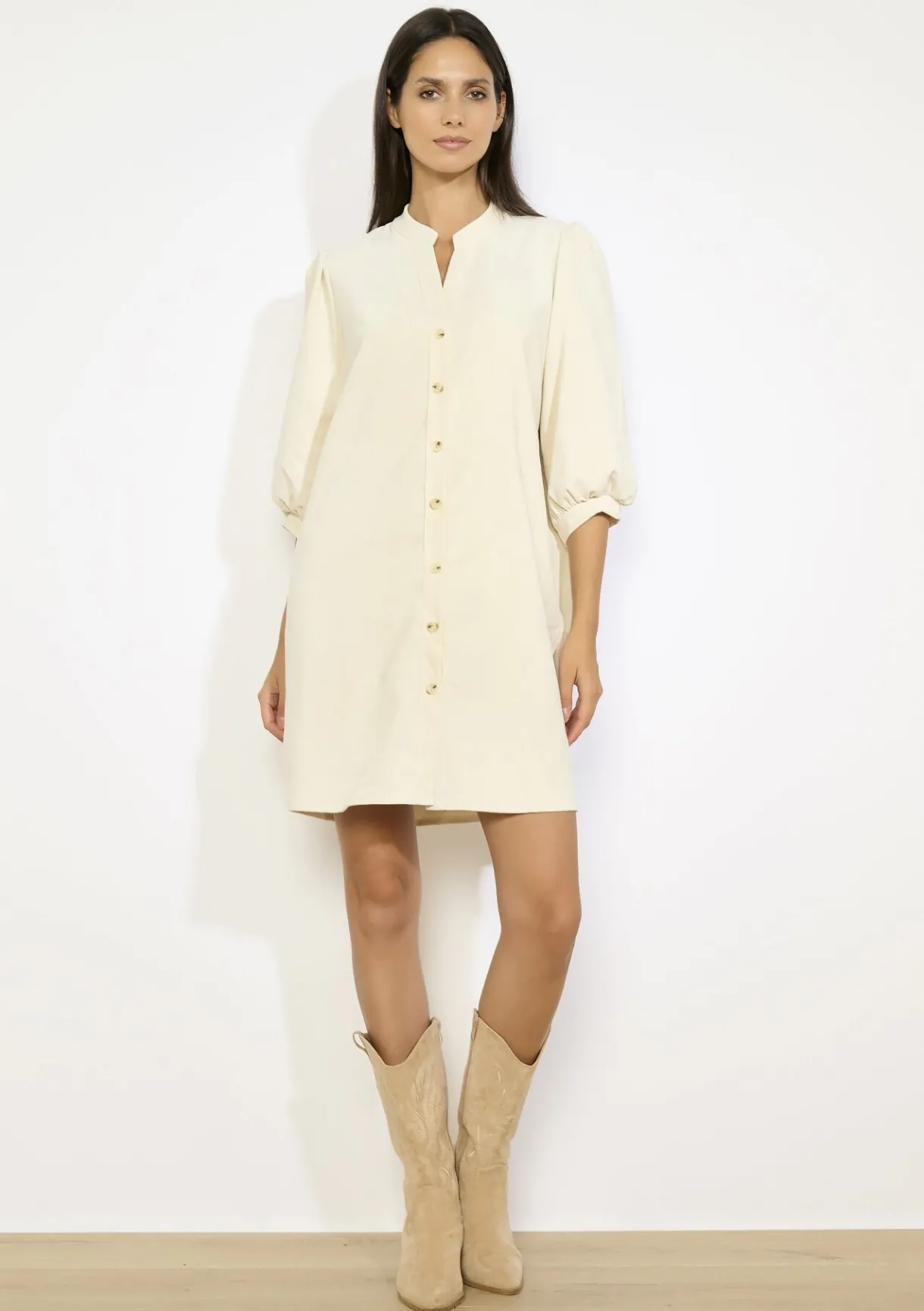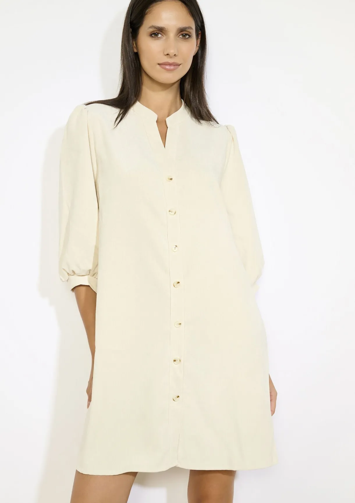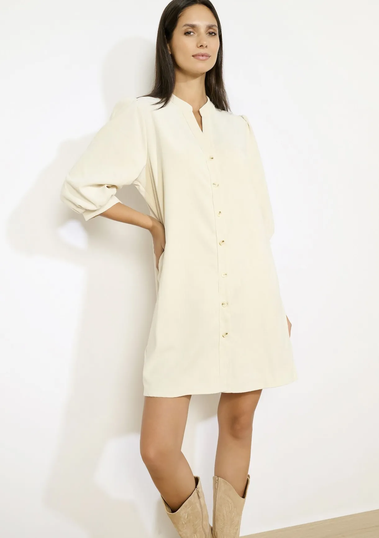 Deze ribfluwelen jurk met Tunesische kraag straalt subtiele elegantie uit.