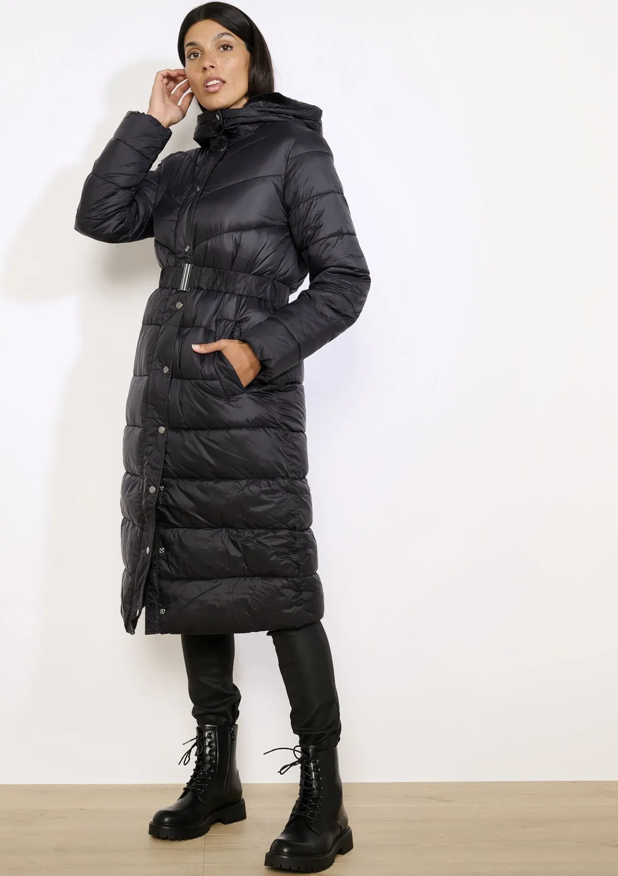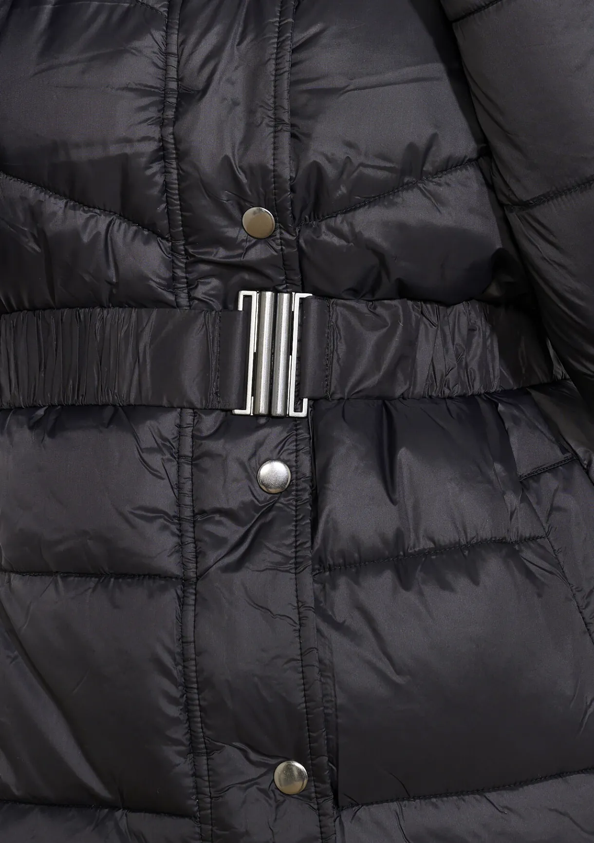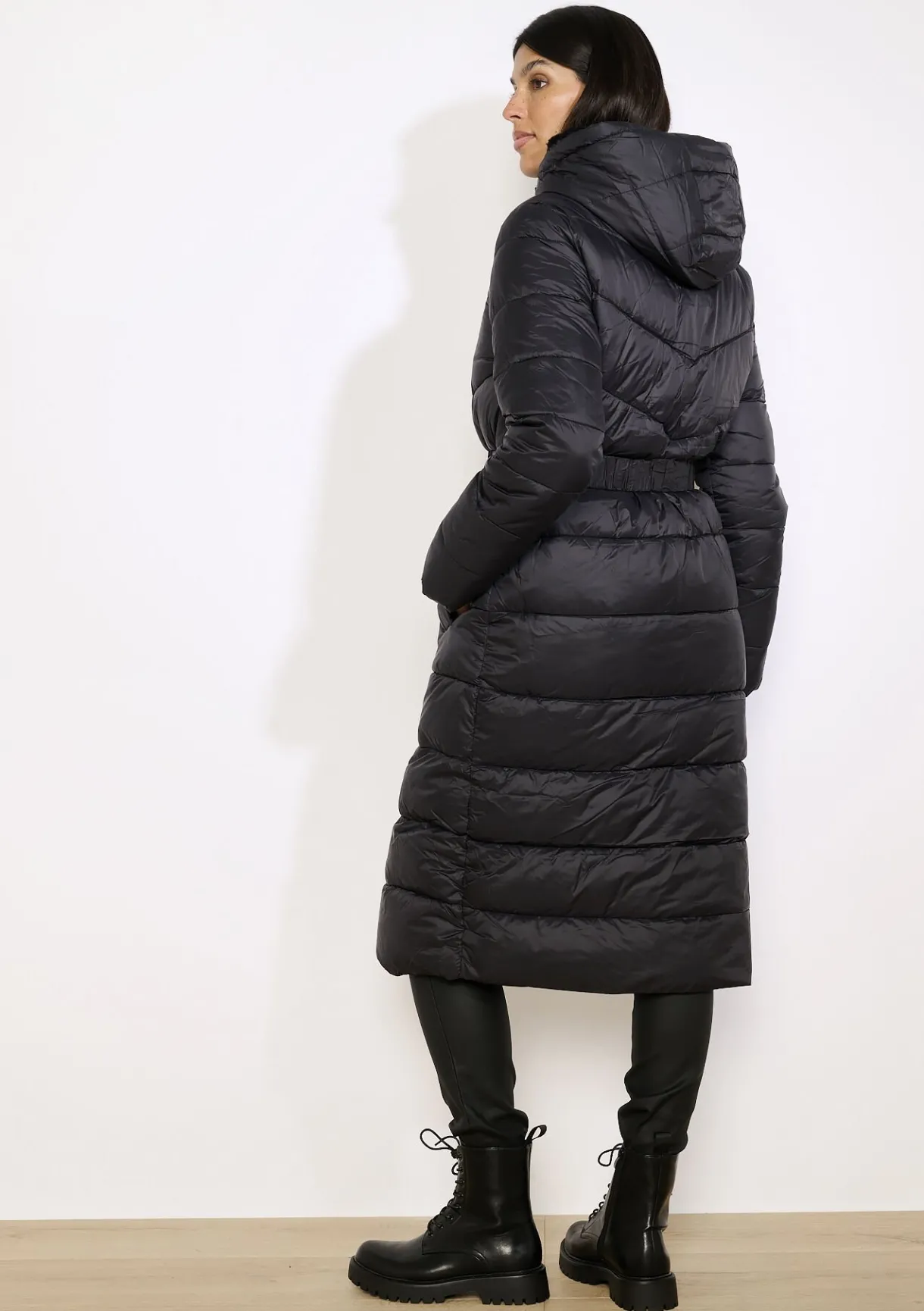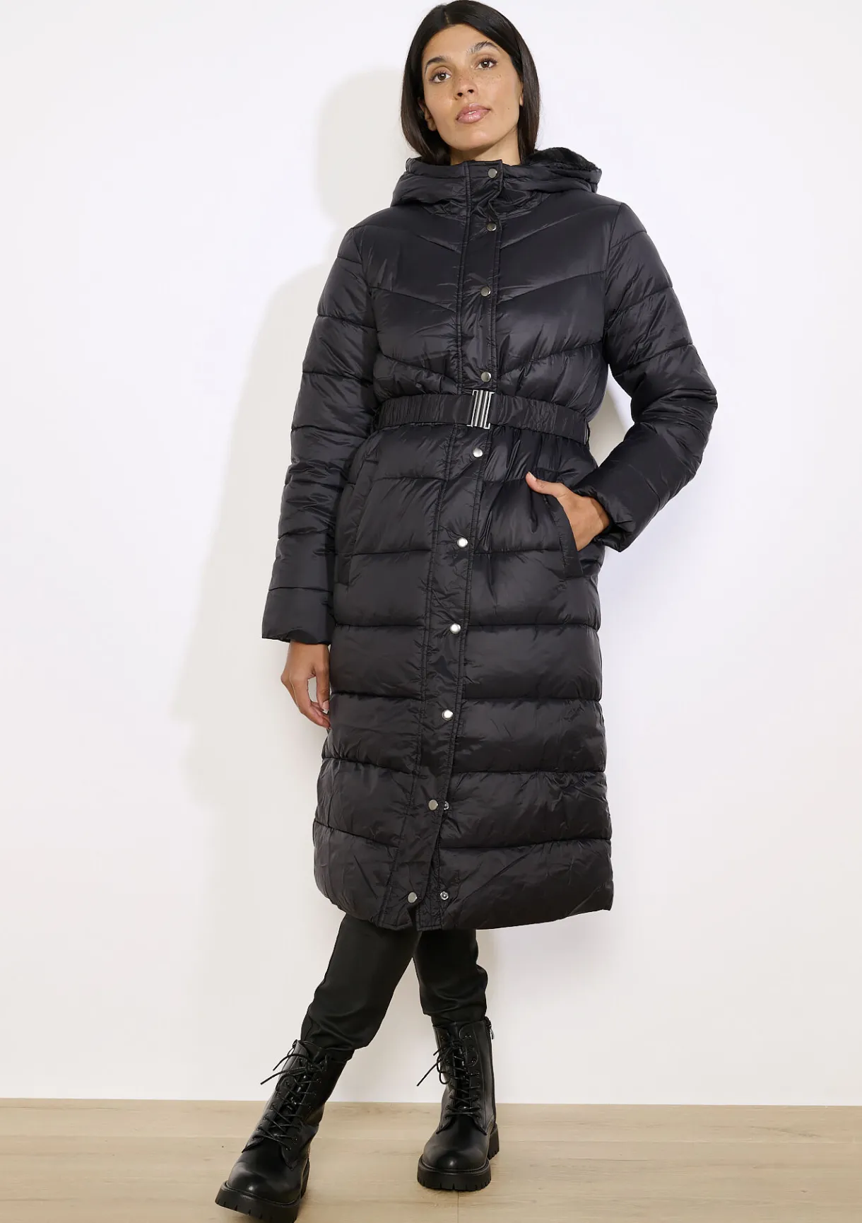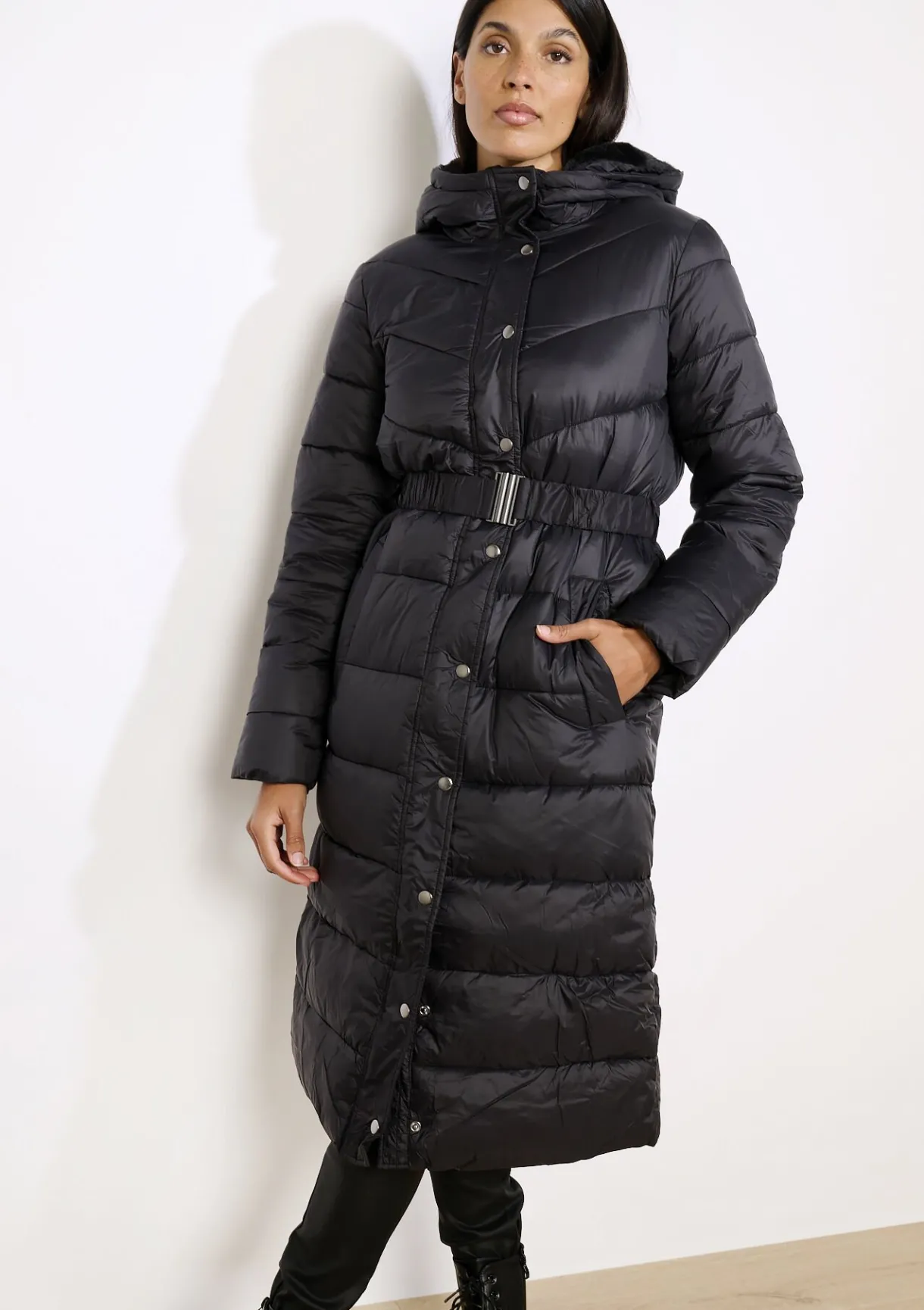 Deze gewatteerde jas biedt warmte en stijl met een flatterende ceintuur, comfortabele capuchon en doordachte details voor de koude dagen.