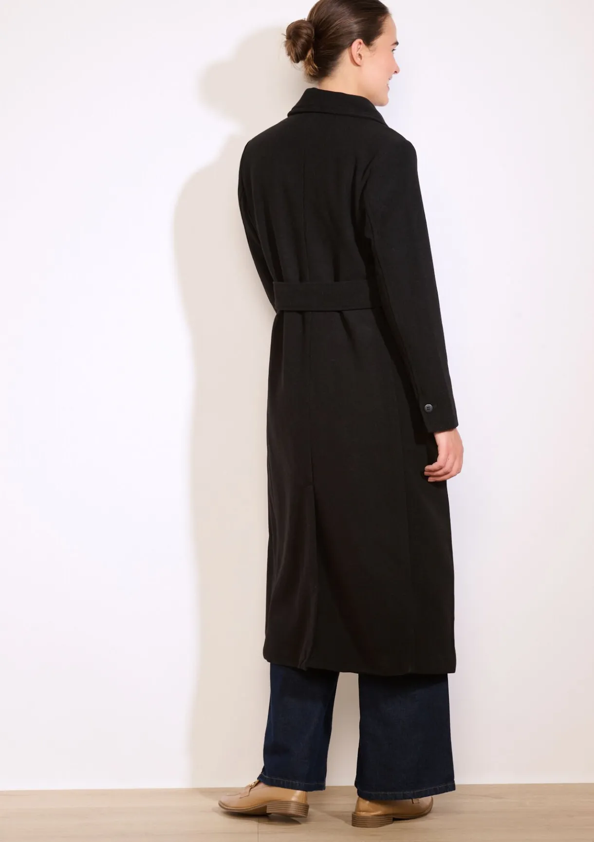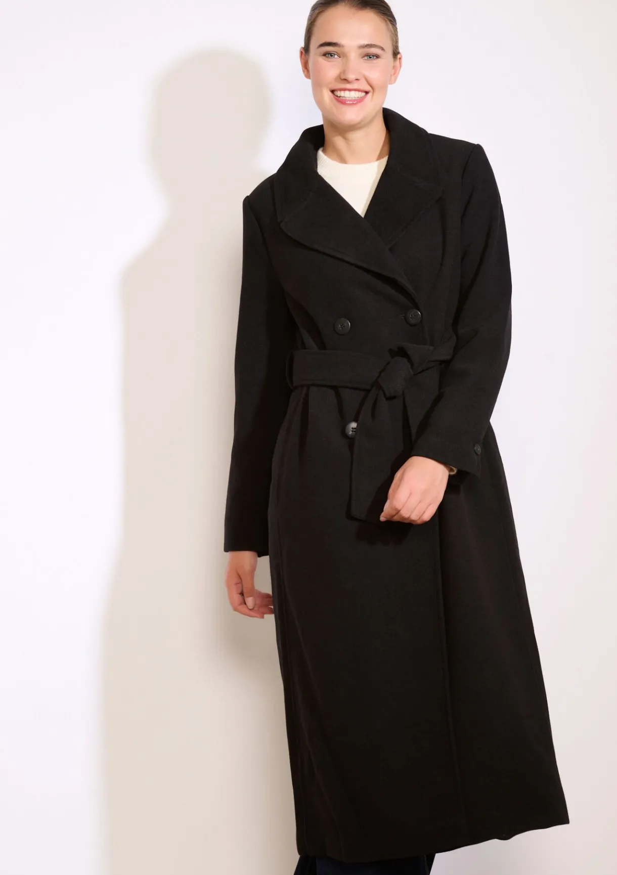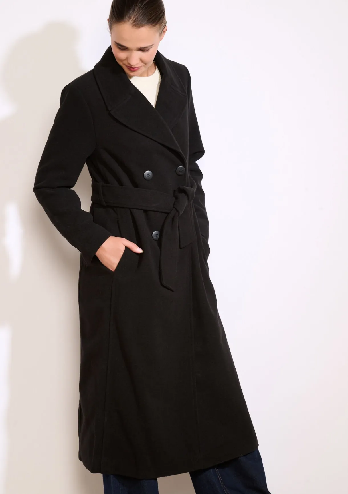 Deze lange mantel met strikceintuur combineert eenvoud met klasse. De ruime kraag en zachte vorm geven elke outfit allure.