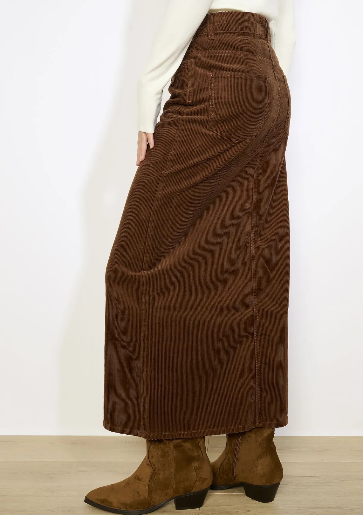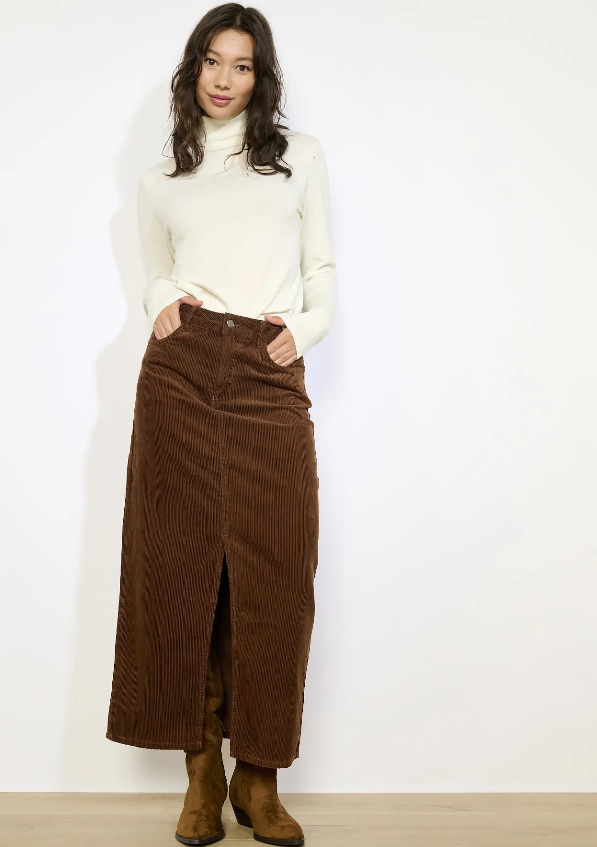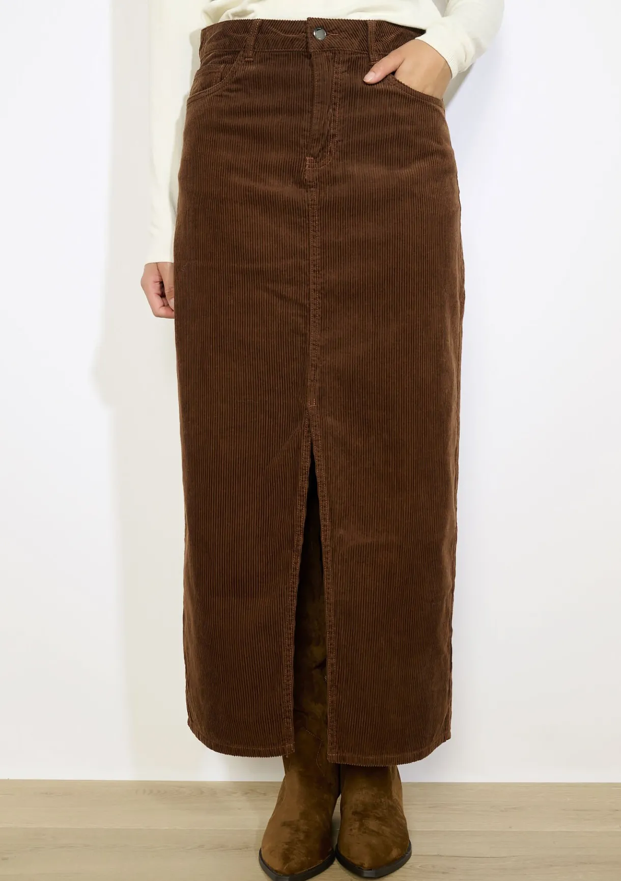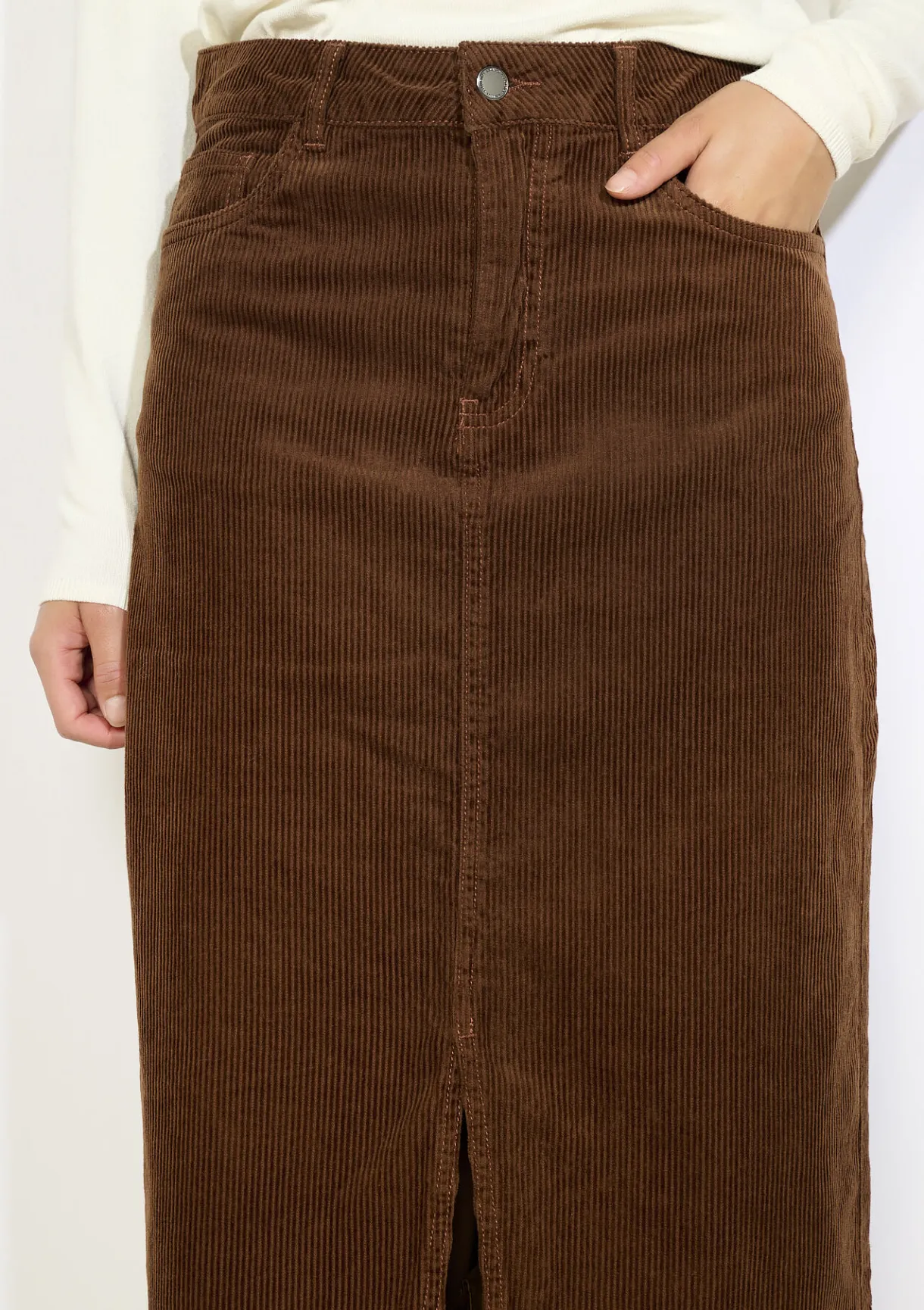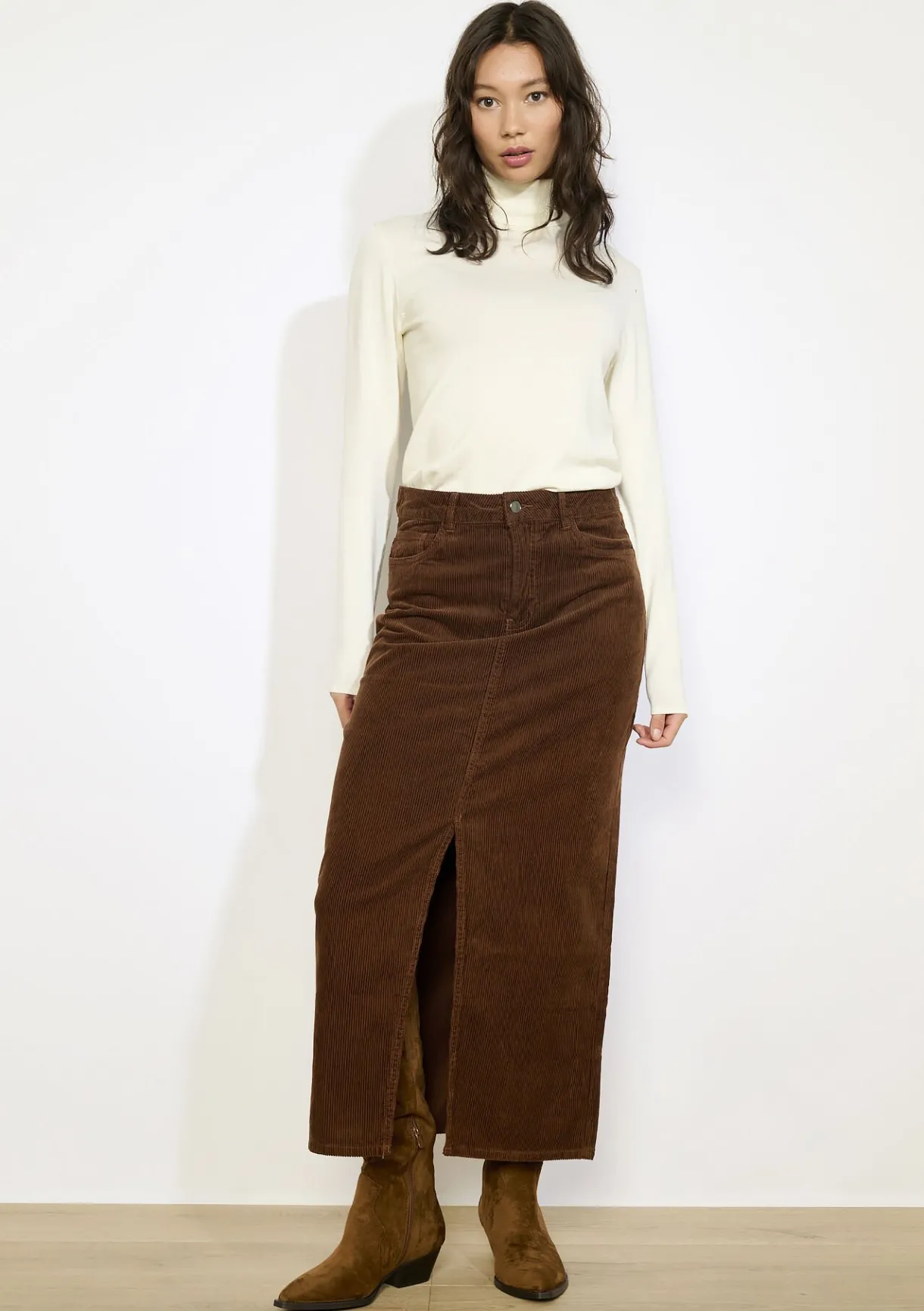 Deze lange ribfluwelen rok heeft een retro uitstraling met een moderne twist dankzij de split. Comfortabel en stijlvol.
