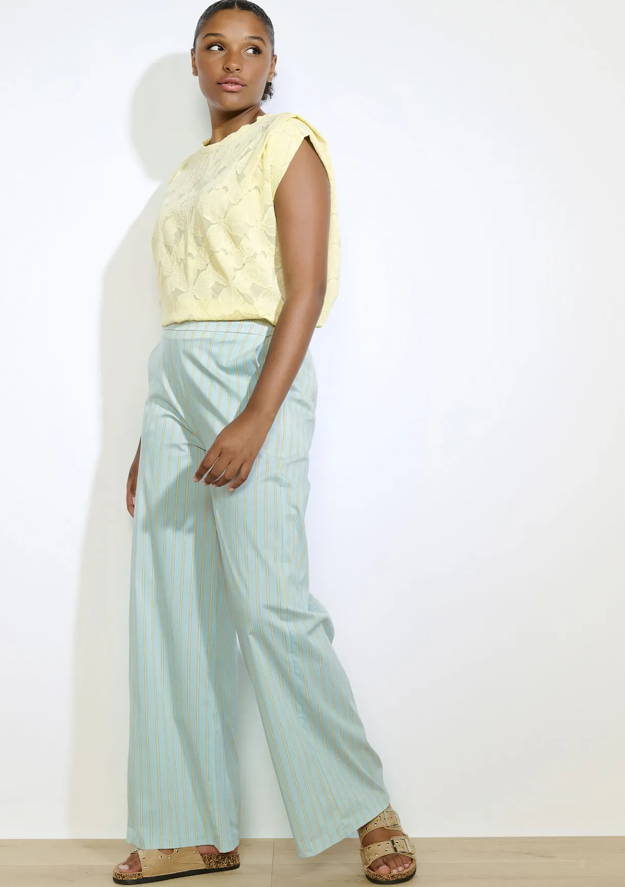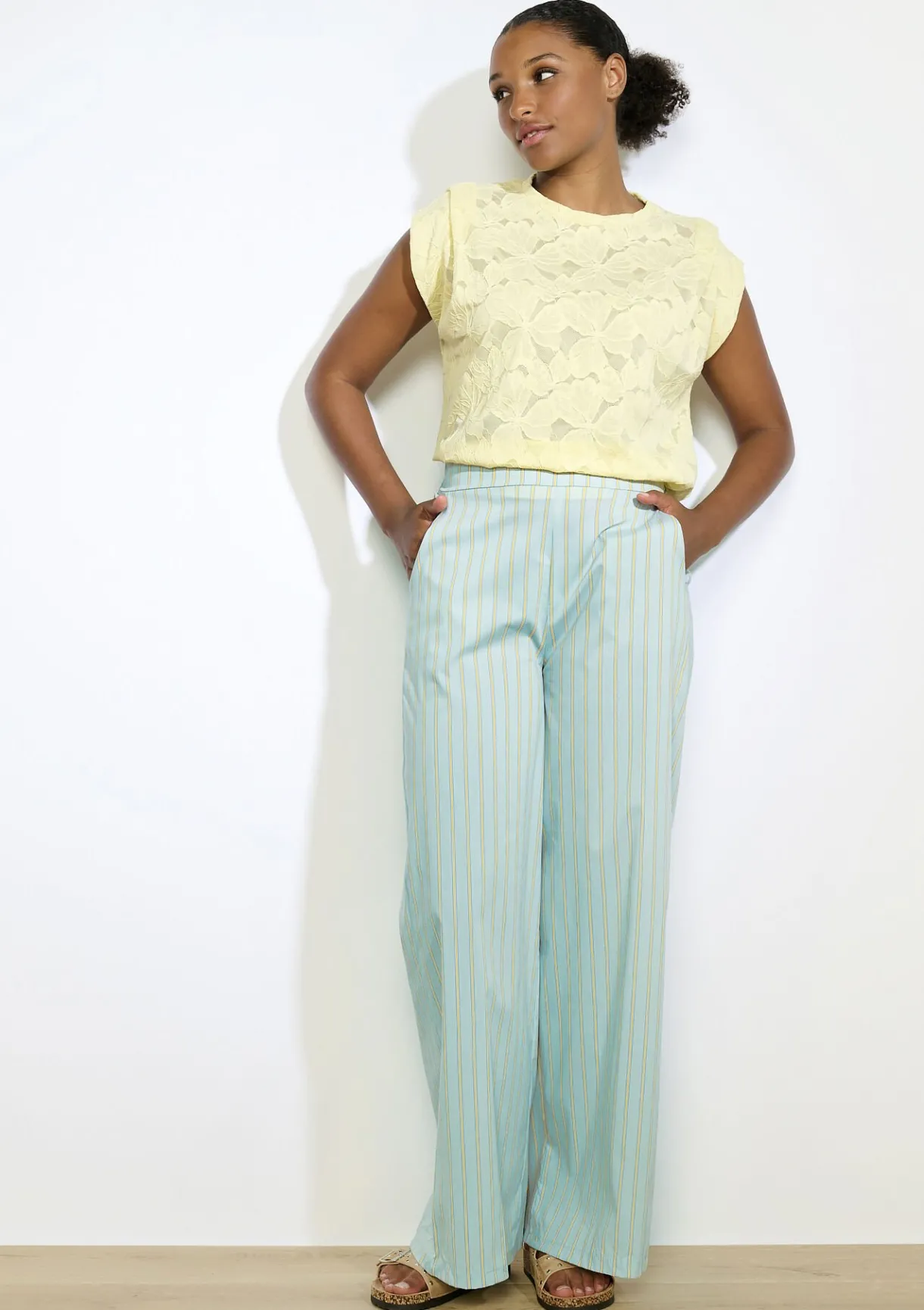 Wijde broek met subtiele pastelkleurige strepen. Luchtig materiaal voor een frisse, elegante look.