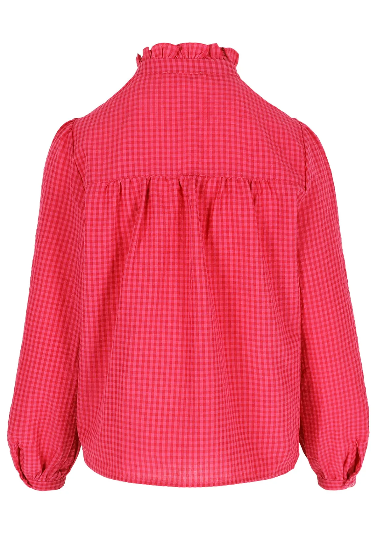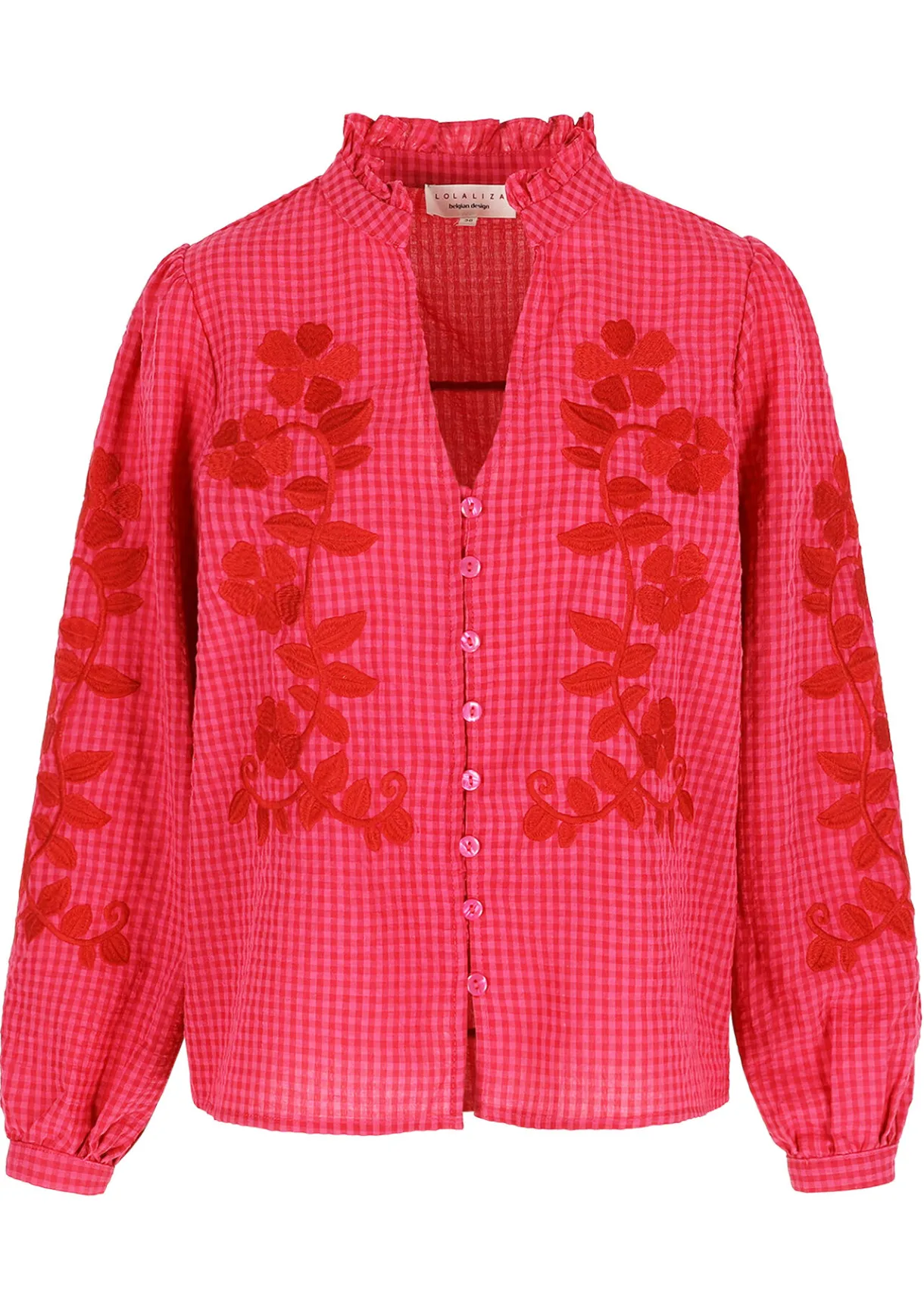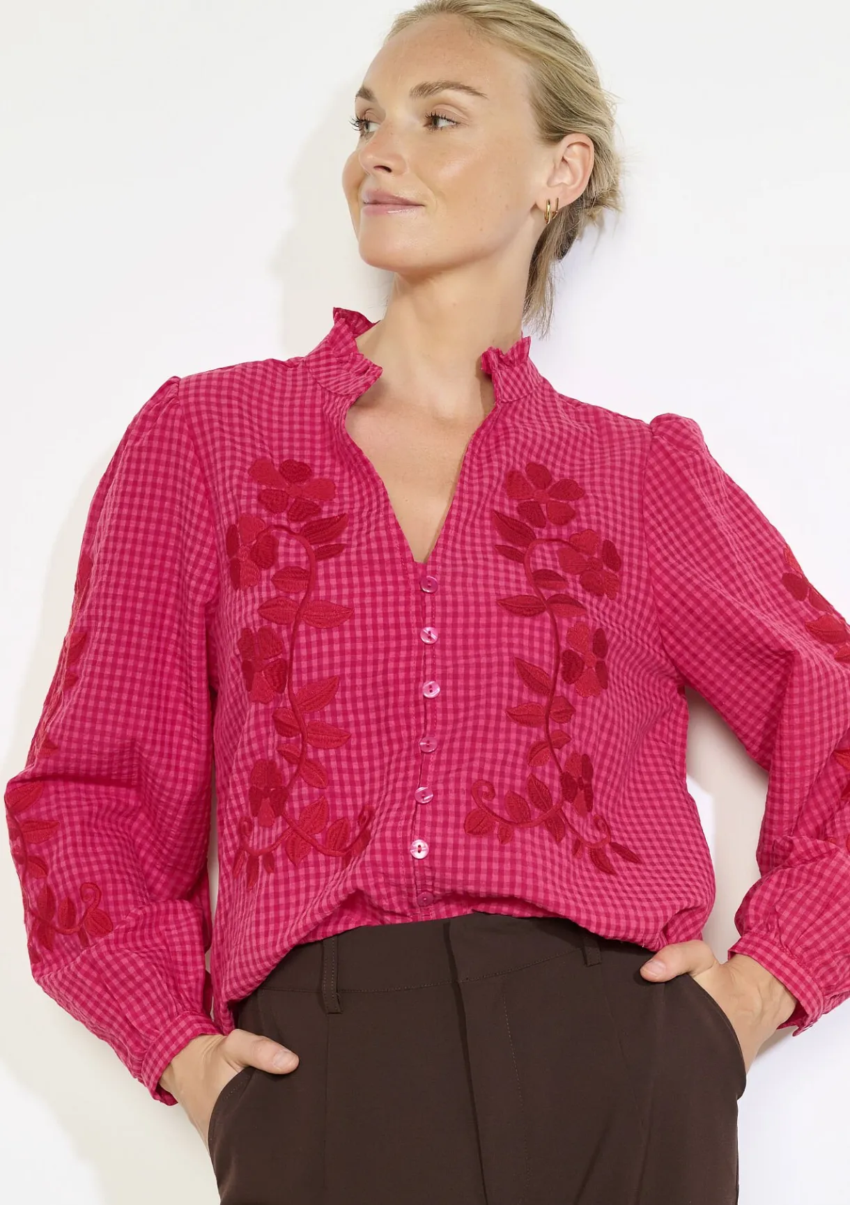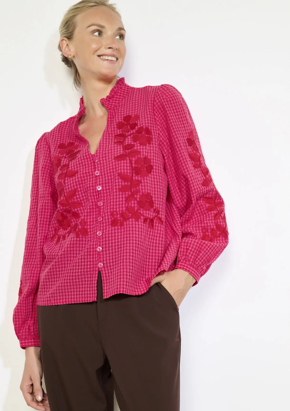 Een charmante blouse met vichyruit en bloemenborduursel op de borst. Bohemien, luchtig en vol karakter.