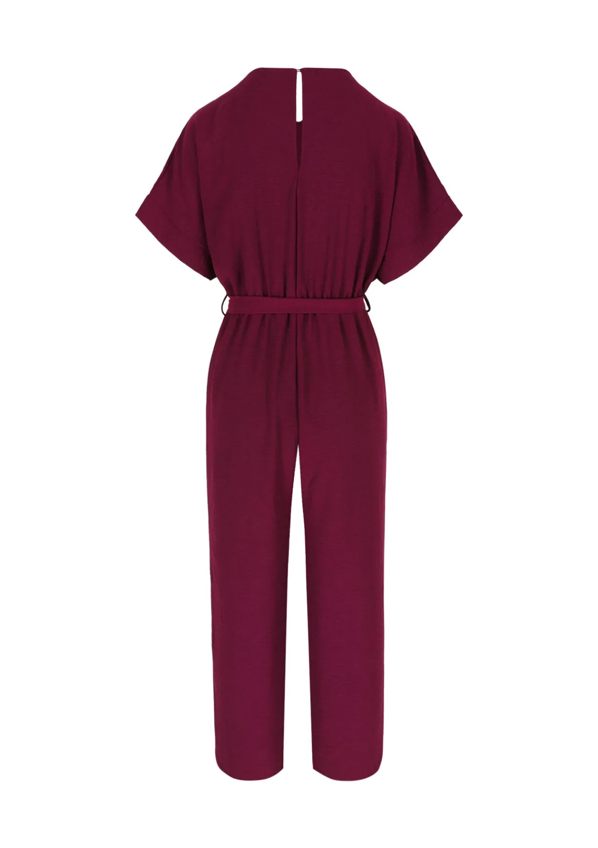 Een soepelvallende jumpsuit met wikkel-effect, strikceintuur en korte mouwen voor een nonchalante look.