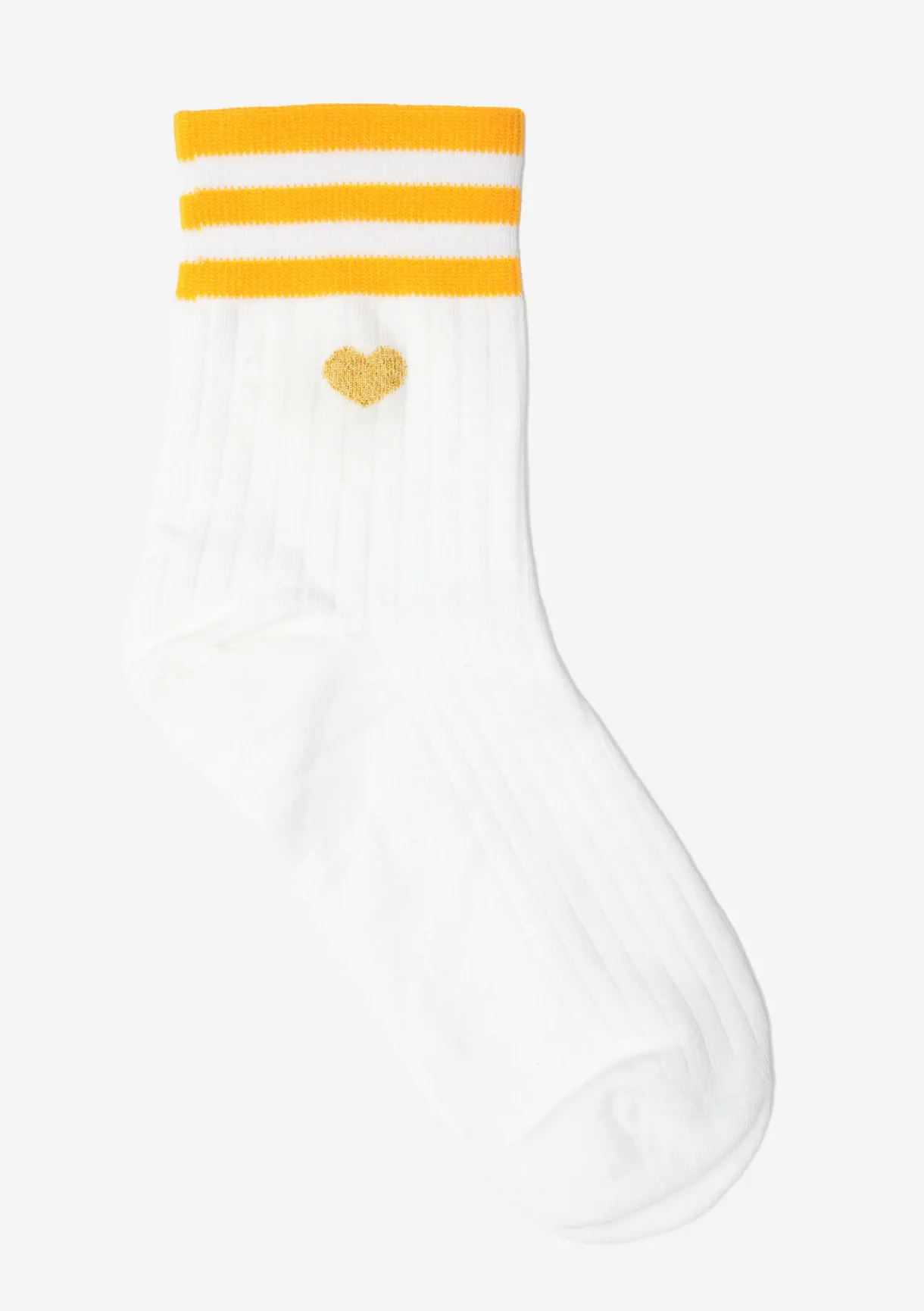Vintage flair met hartdetail en sportieve streepaccenten.