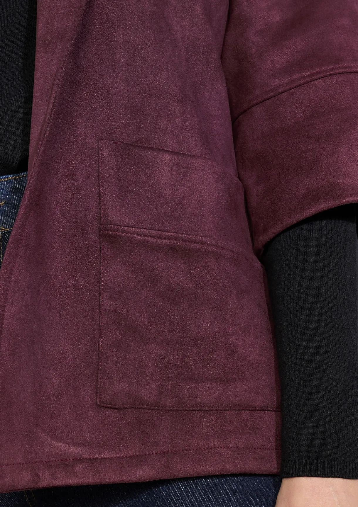 Losvallende blazer in suèdine met zakken vooraan en driekwartsmouwen, casual en elegant tegelijk.