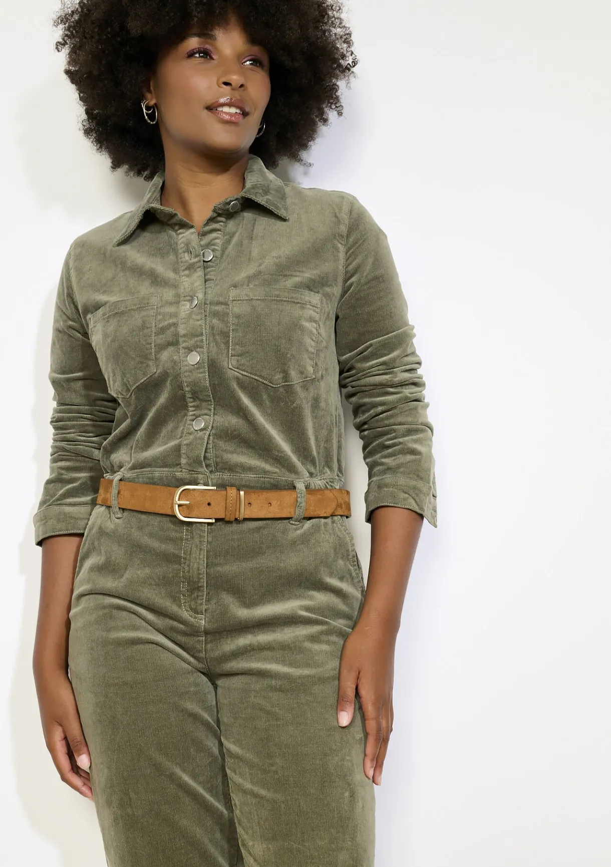 Zachte suèdine riem van 3,3 cm met gouden gesp. Binnenkant van splitleer. Ideale breedte om de taille elegant te accentueren bij jeans of jurken.