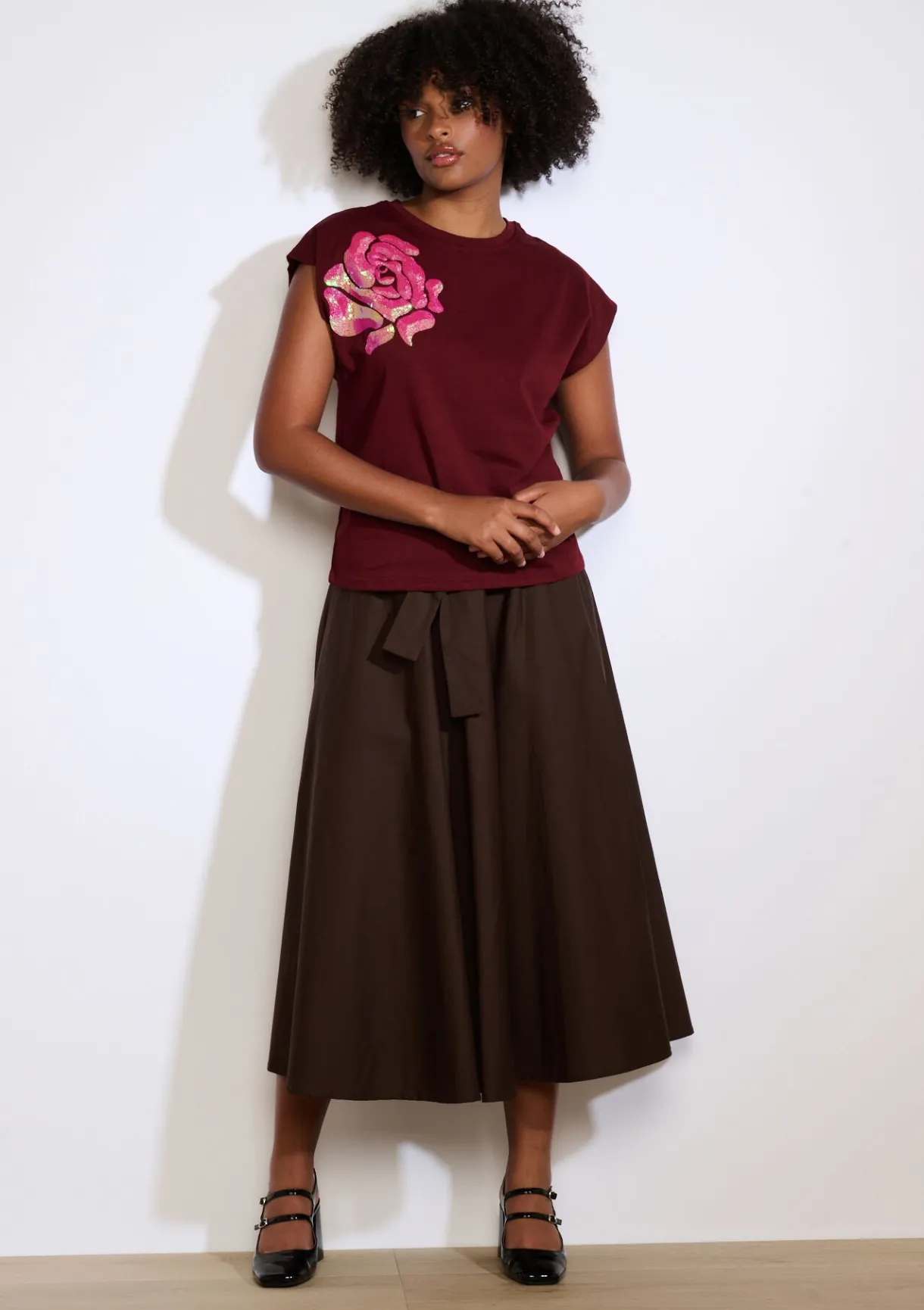 Deze top brengt een speelse glamour dankzij de sprankelende rozenapplicatie. Romantiek met een twist.