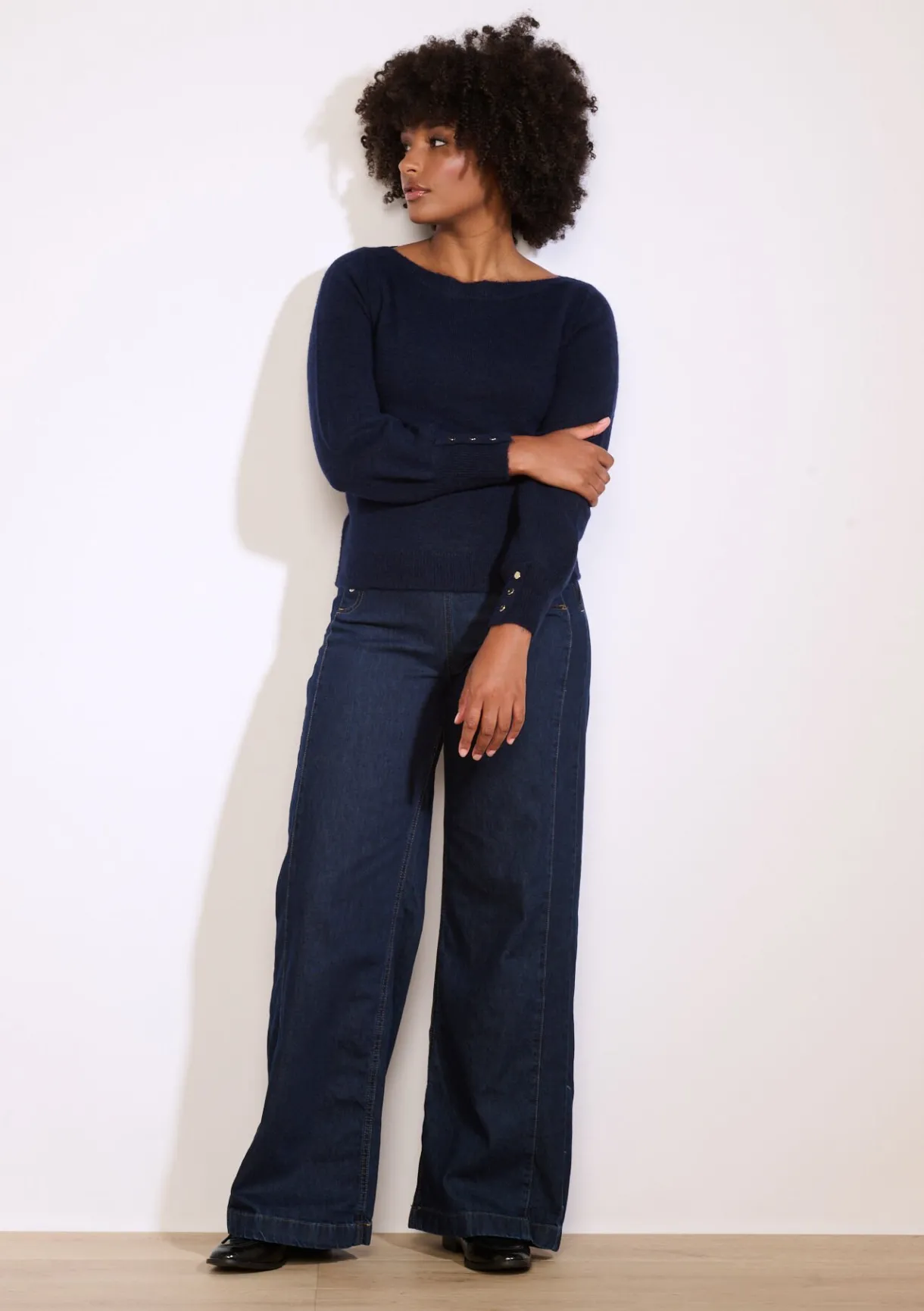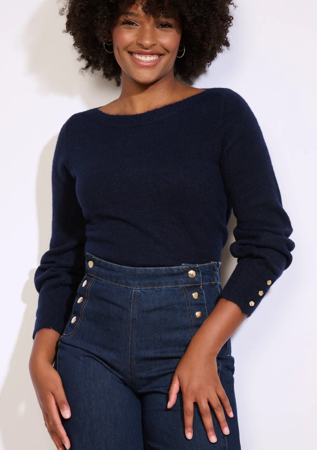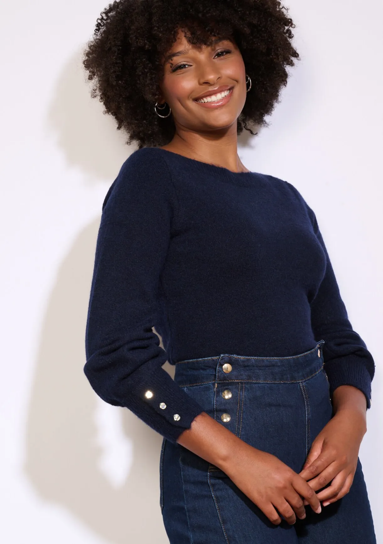 Elegante en zachte trui met licht gepofte mouwen en verfijnde knoopdetails voor een stijlvolle touch.