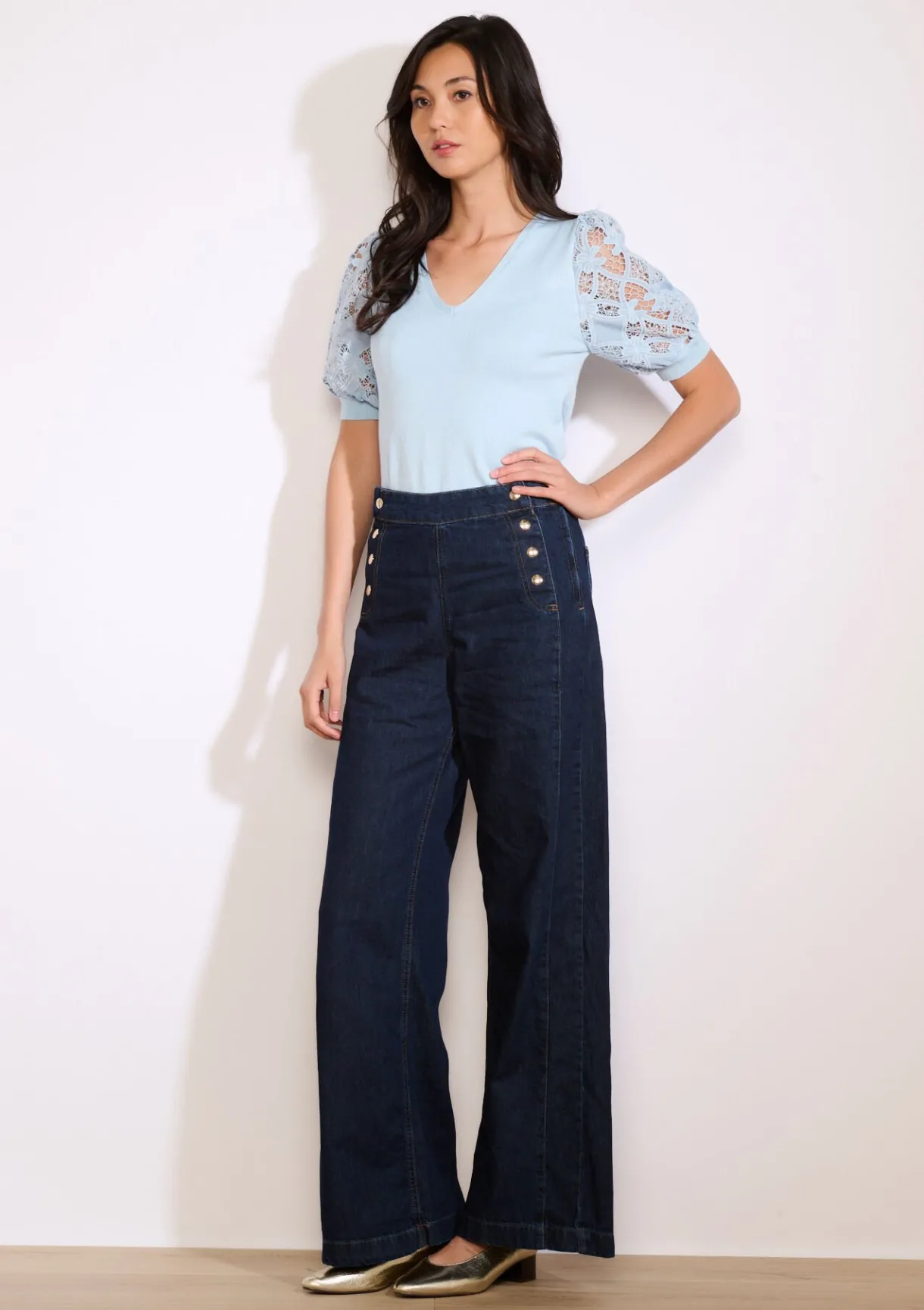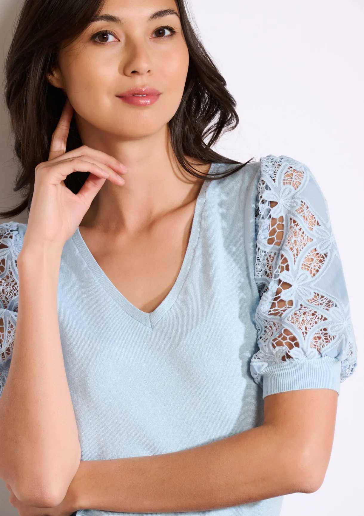 V-hals trui met korte kanten mouwen en verfijnde transparantie.