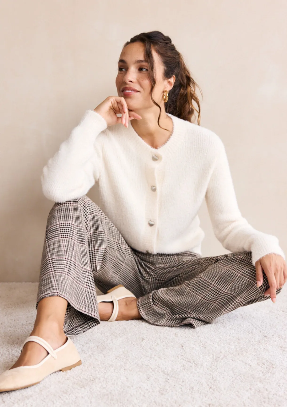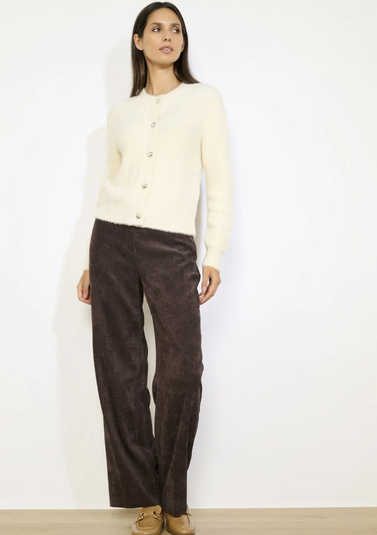 Zacht, pluizig vest met ronde hals en hartvormige knopen. Perfect voor een vrouwelijke, warme look.