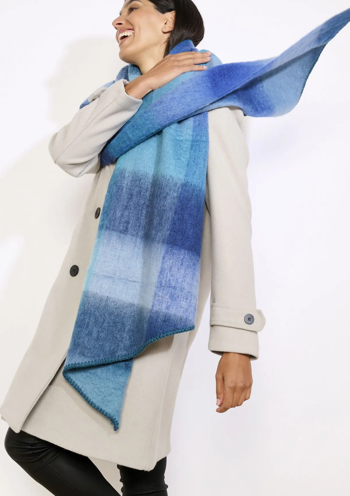 Zacht en speels met een grafisch ruitpatroon deze sjaal tilt je winterlagen moeiteloos naar een hoger niveau.