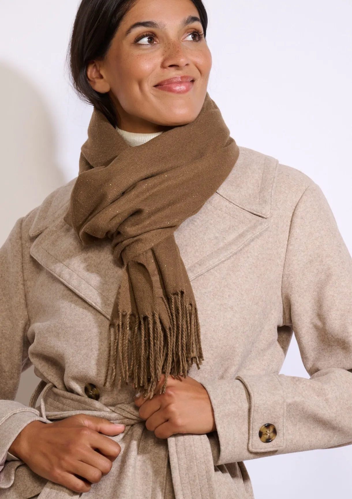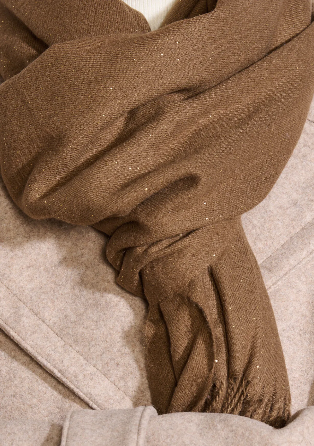 Licht en zacht met een vleugje glans. Deze sjaal met franjes brengt subtiele flair aan elke herfst- of winteroutfit.