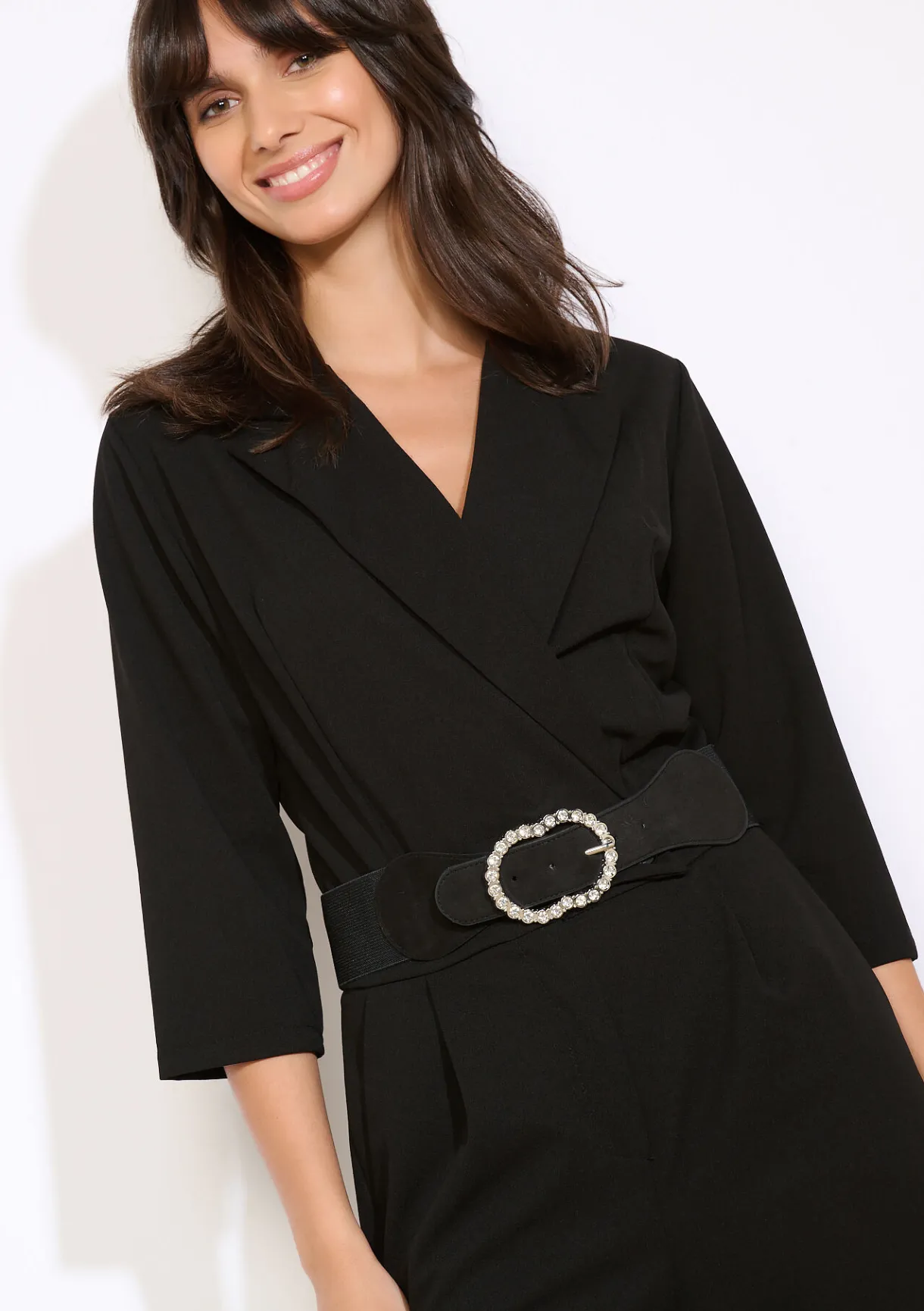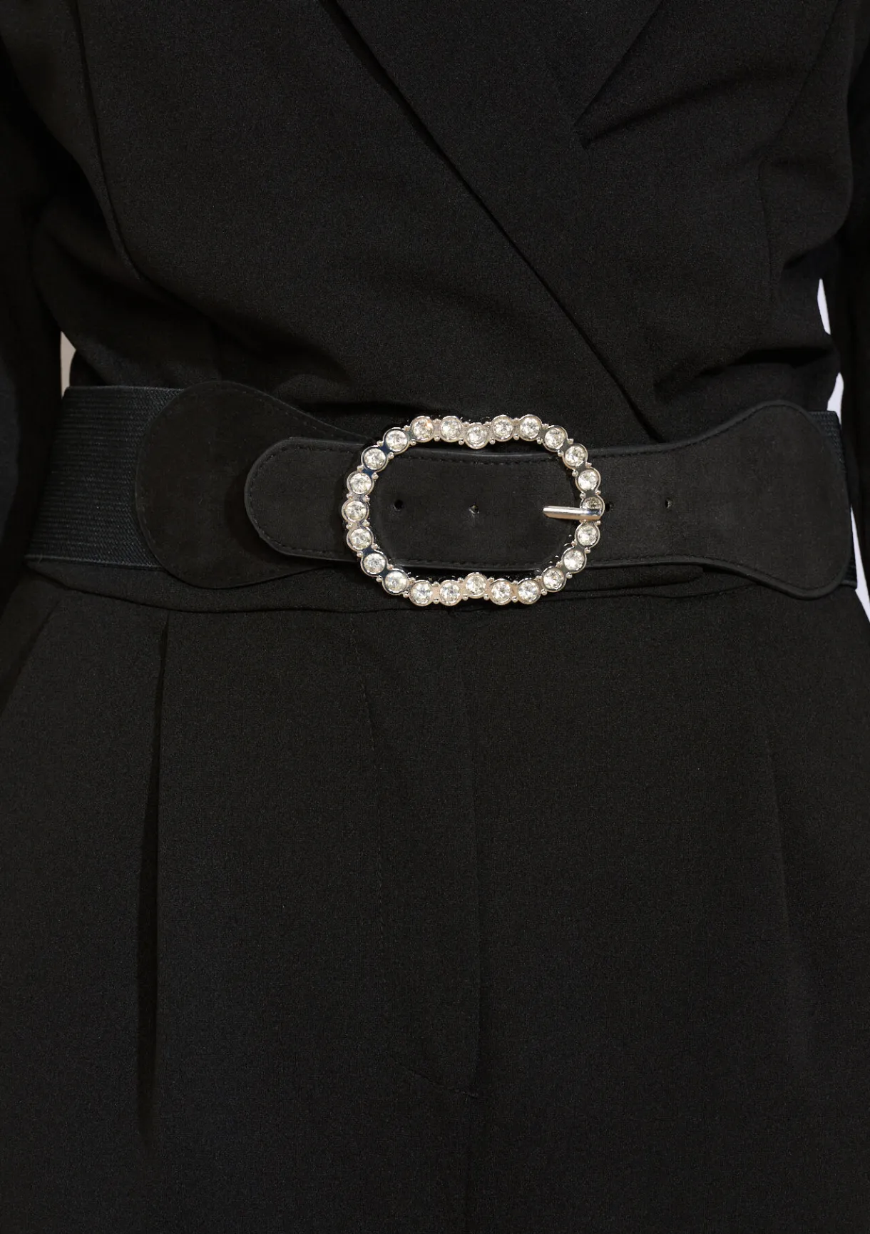 Een elastische ceintuur van 6?cm in suèdine, met een sierlijke gesp. Accentueert de taille op chique wijze.