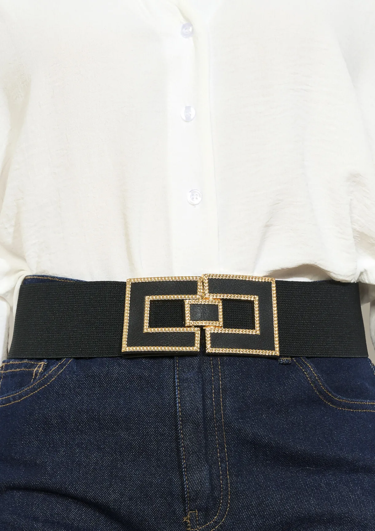 Elastische riem van 6?cm met gouden geometrische gesp. Een stijlvolle structuur voor elke look.