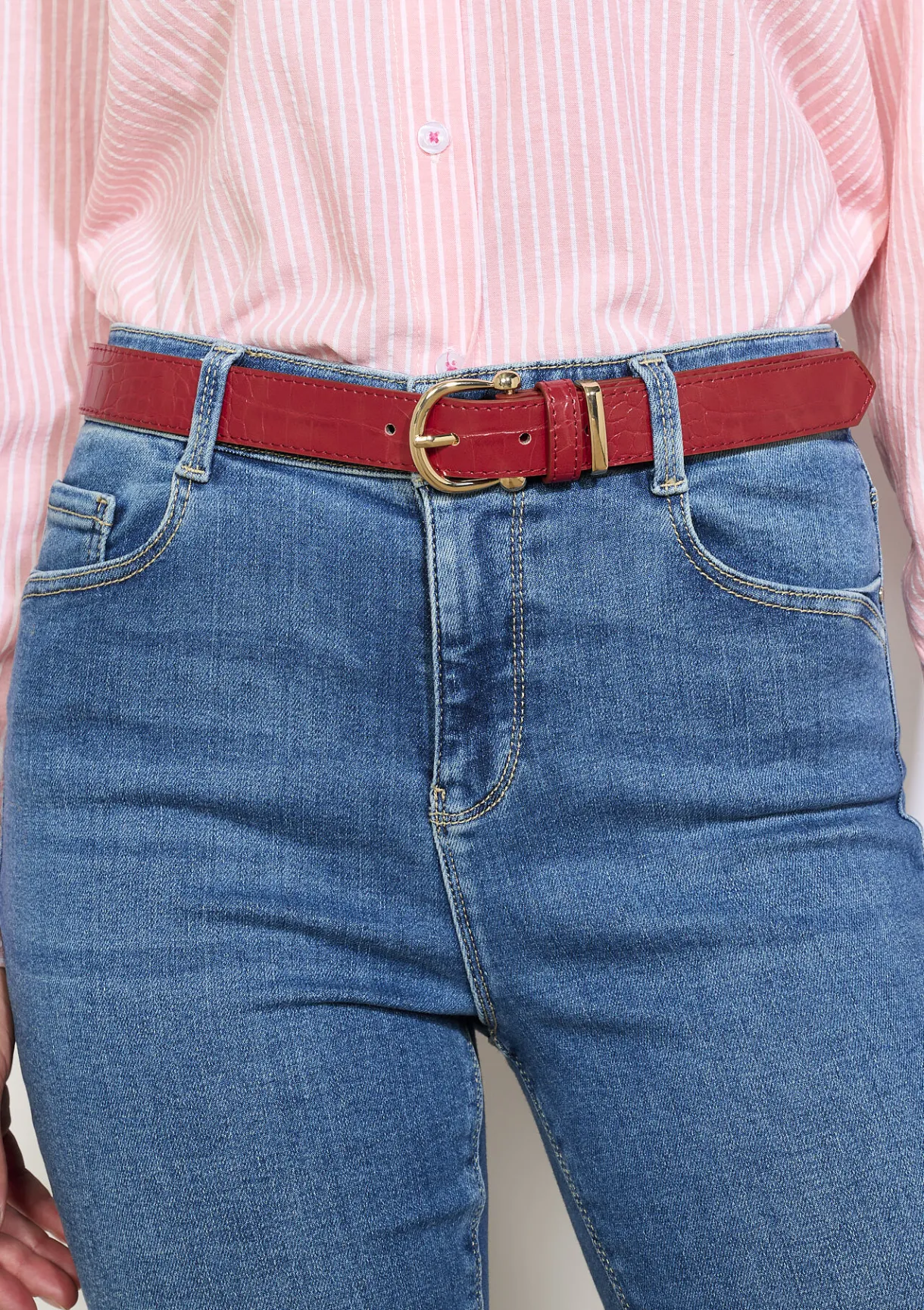 Fijne ceintuur van 2,8 cm met krokoprint en gouden gesp. Tijdloze stijl die zowel casual als elegant gedragen wordt.