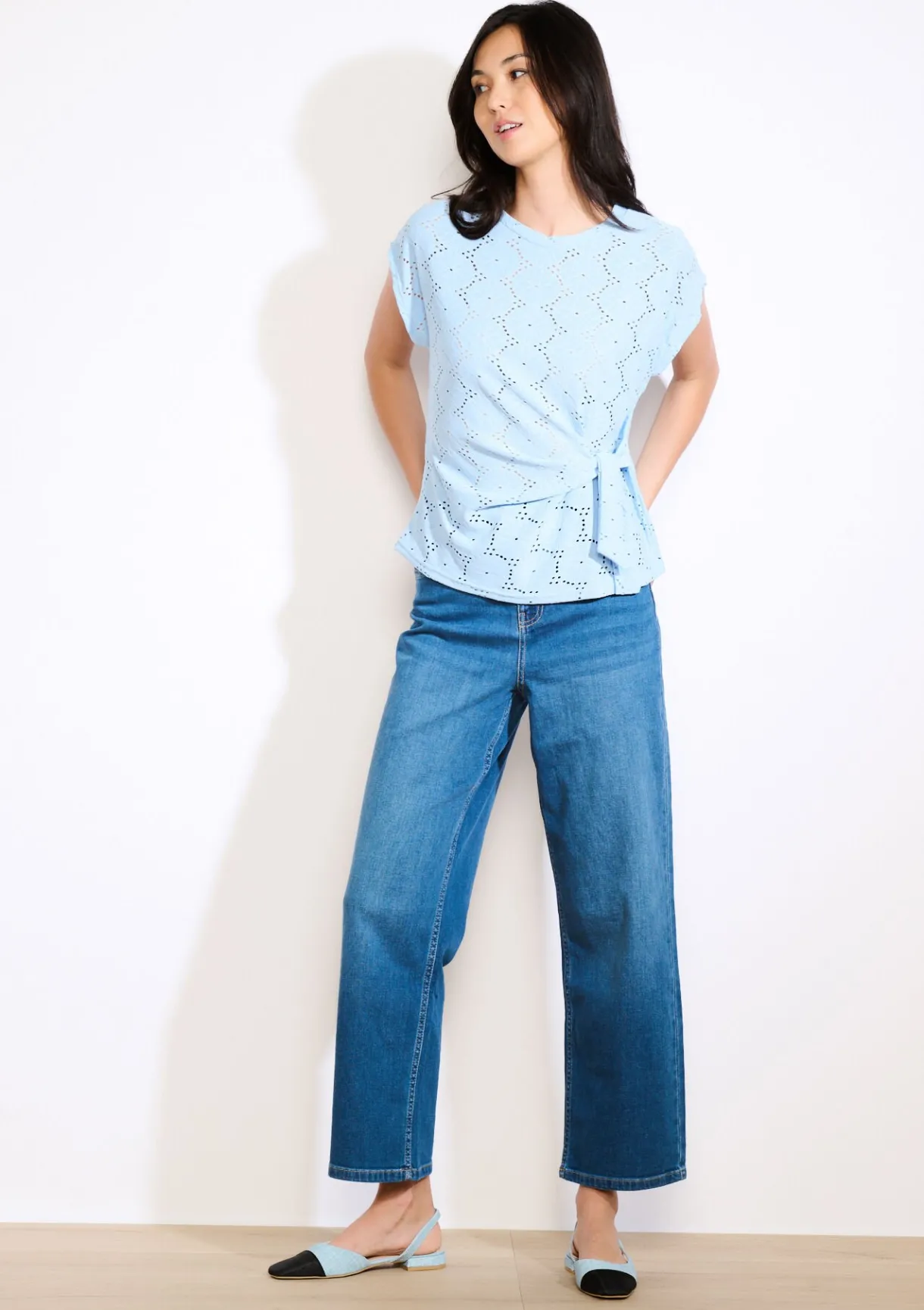 Luchtige geborduurde top met een knoopdetail opzij. Vrouwelijk en zomers.