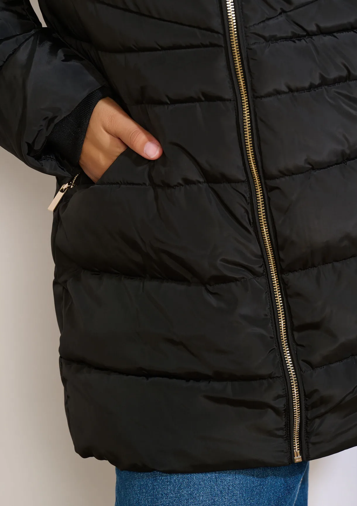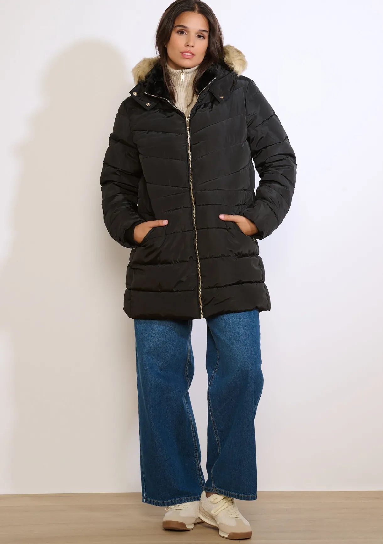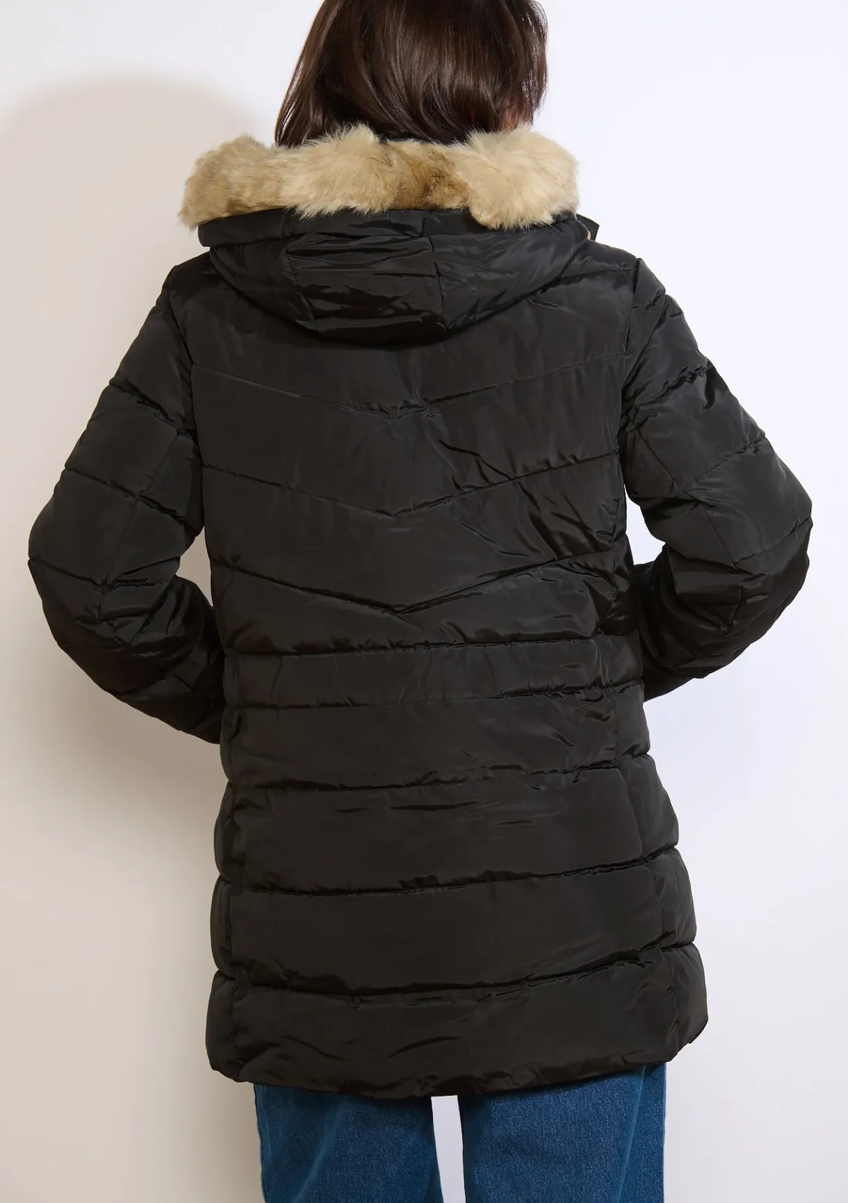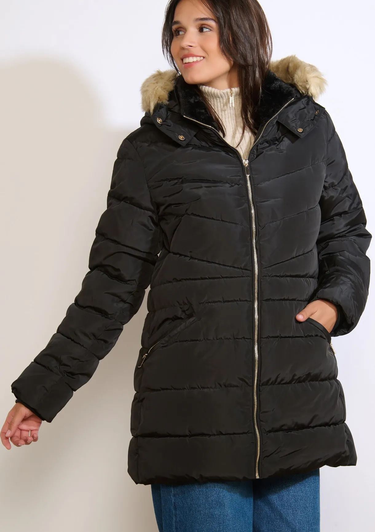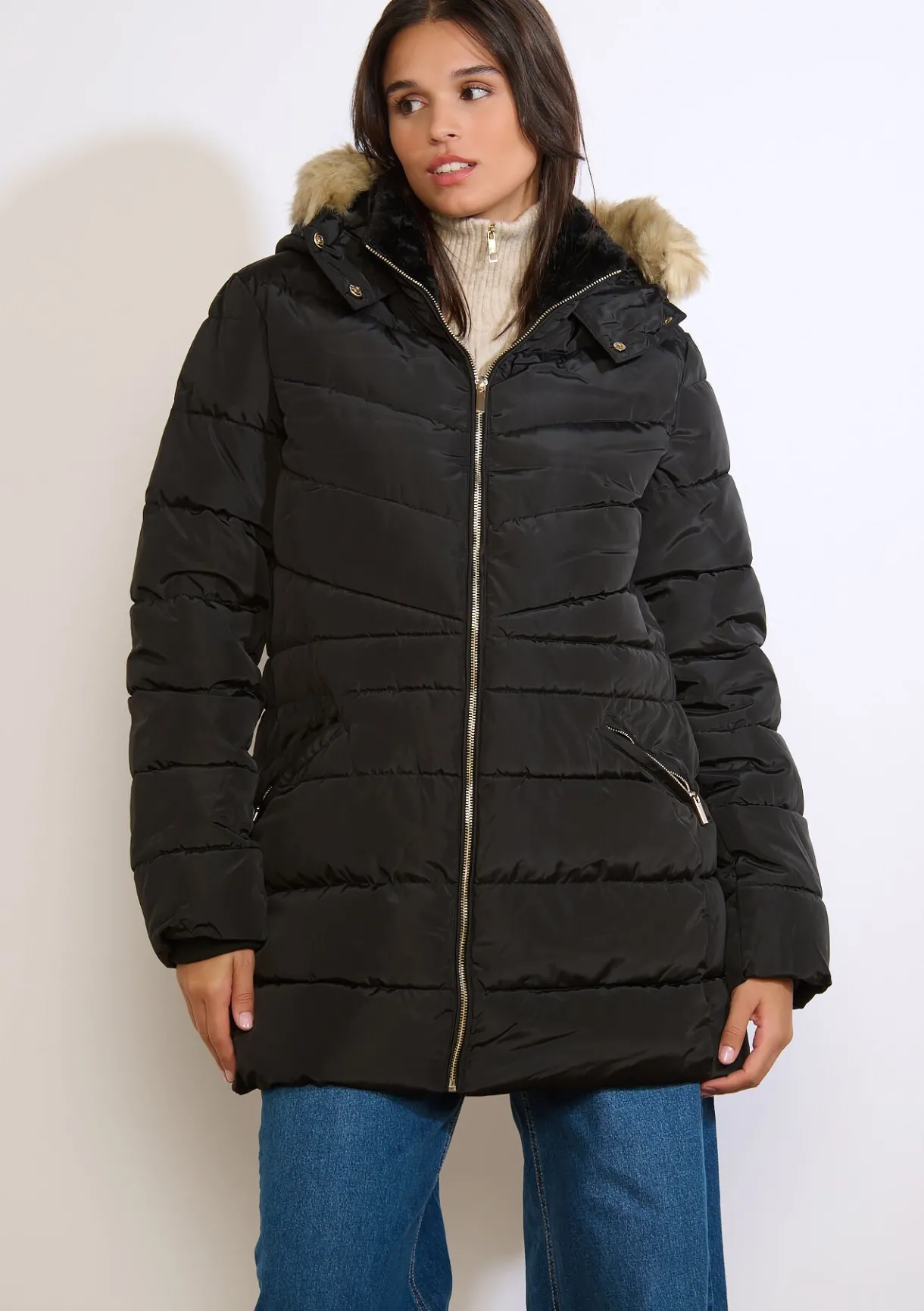 Een middellange puffer met vaste kap en zachte imitatiebont. Warm, stijlvol en perfect voor koude dagen in de stad.