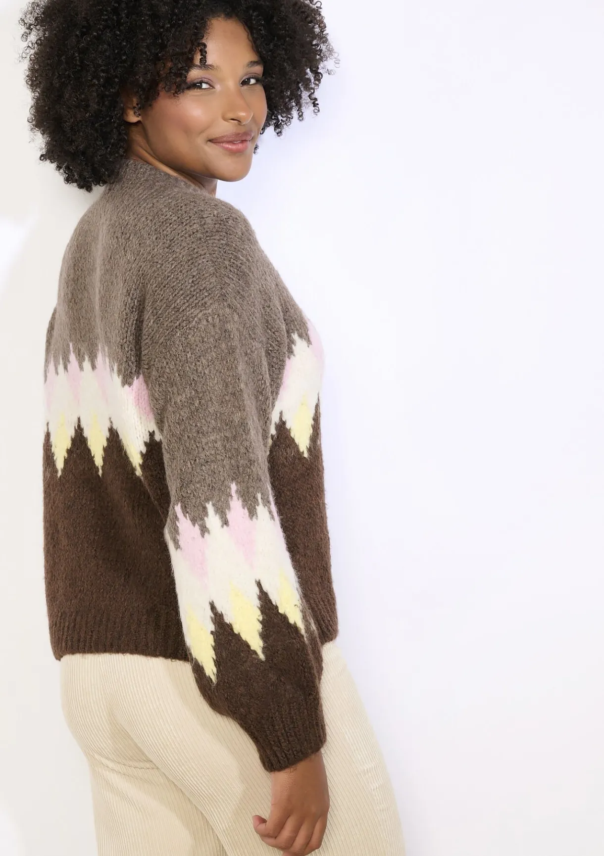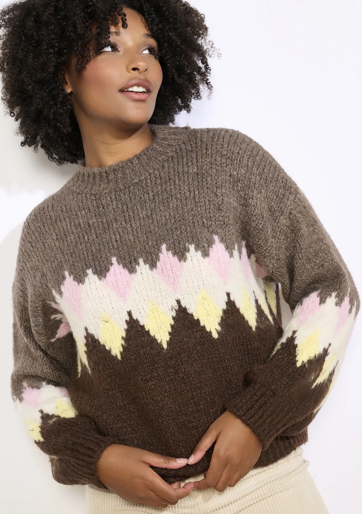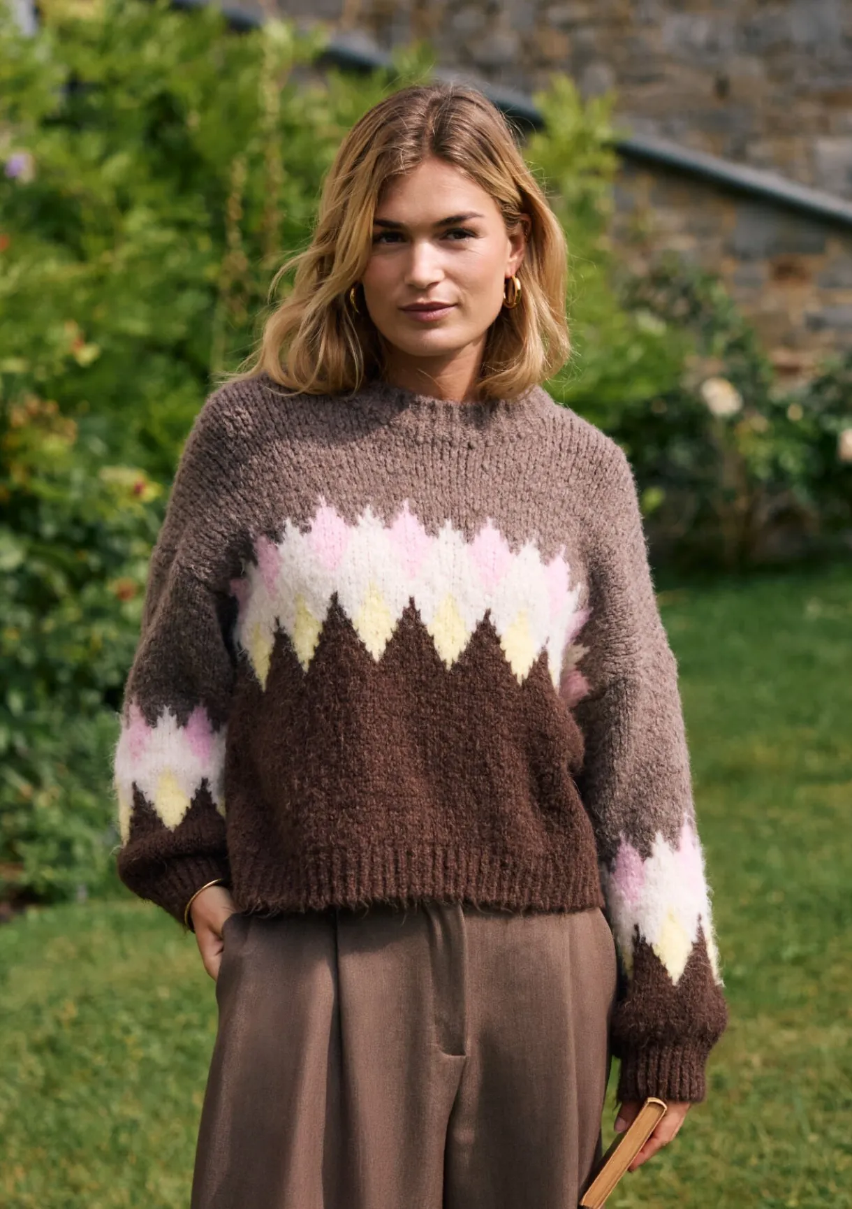Een warme jacquardtrui met speels ruitmotief. Een opvallend item dat stijl en comfort moeiteloos combineert.