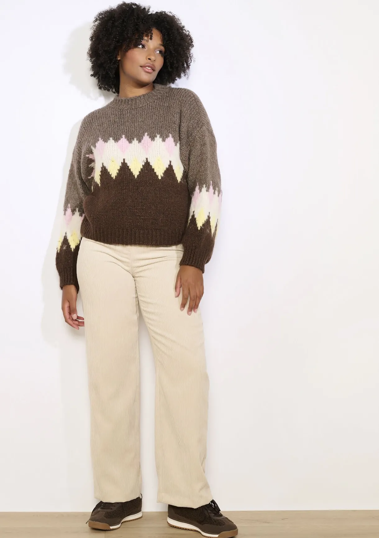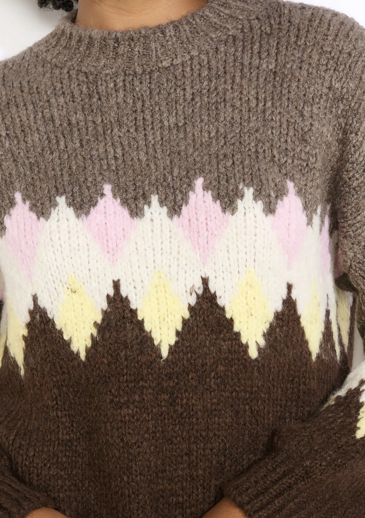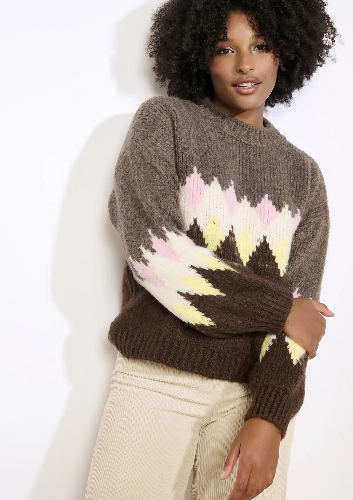 Een warme jacquardtrui met speels ruitmotief. Een opvallend item dat stijl en comfort moeiteloos combineert.