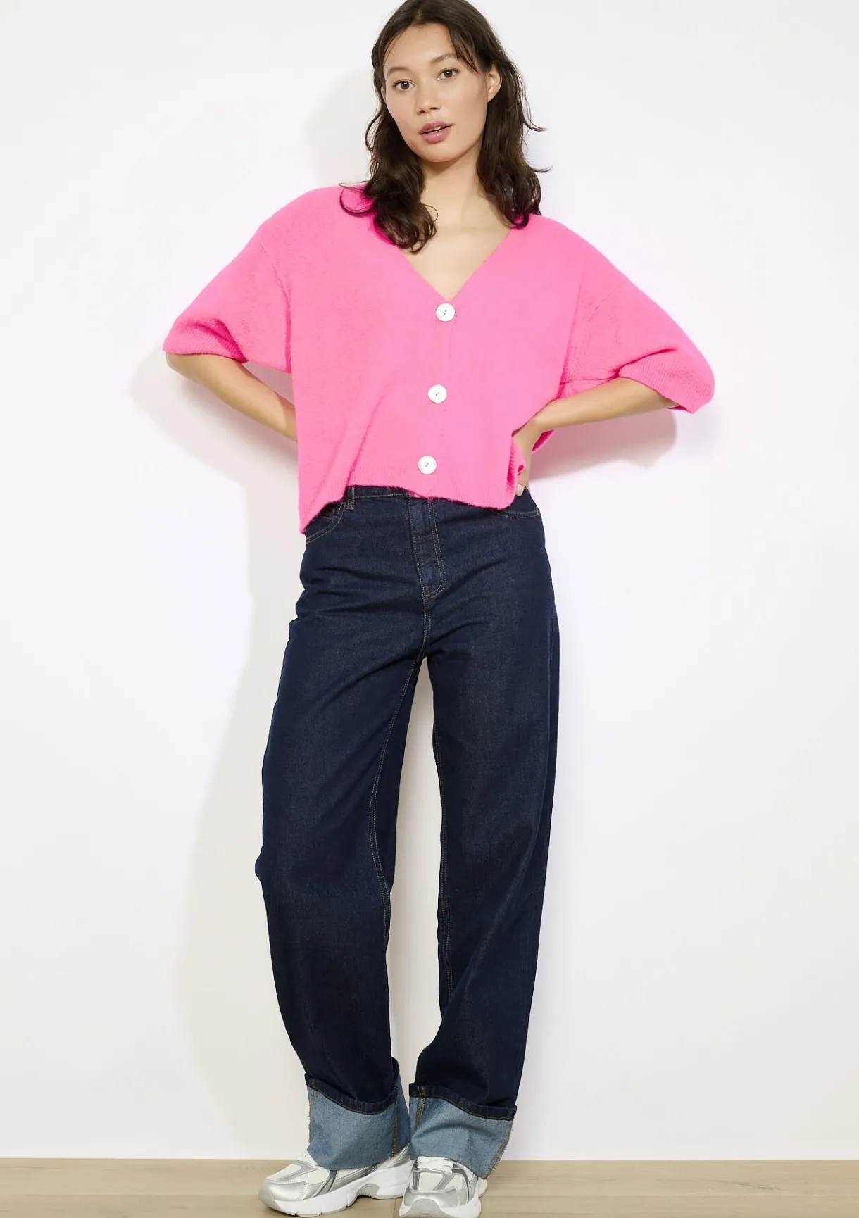 Een speels kort vest met grote knopen, modern en opvallend in één.