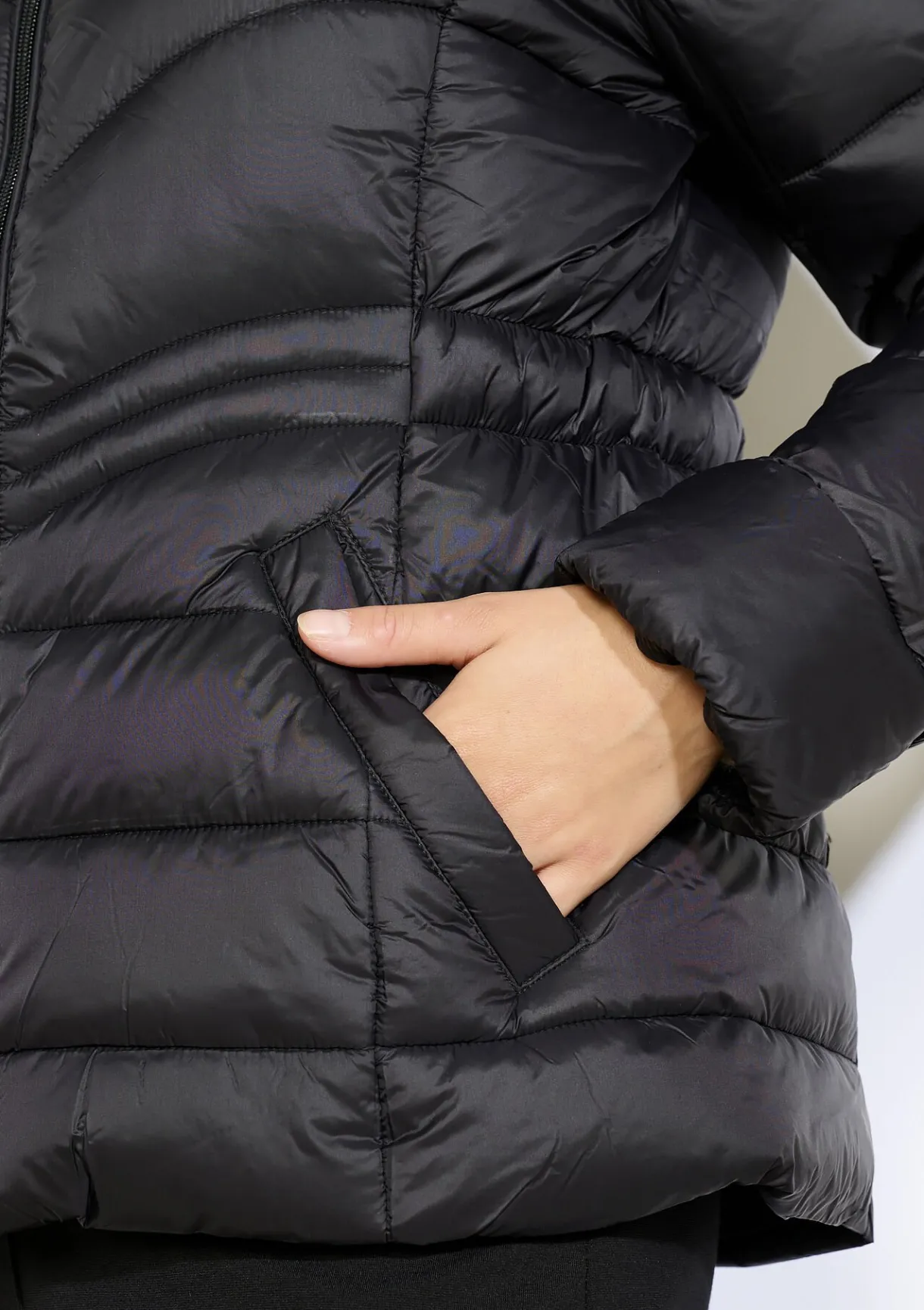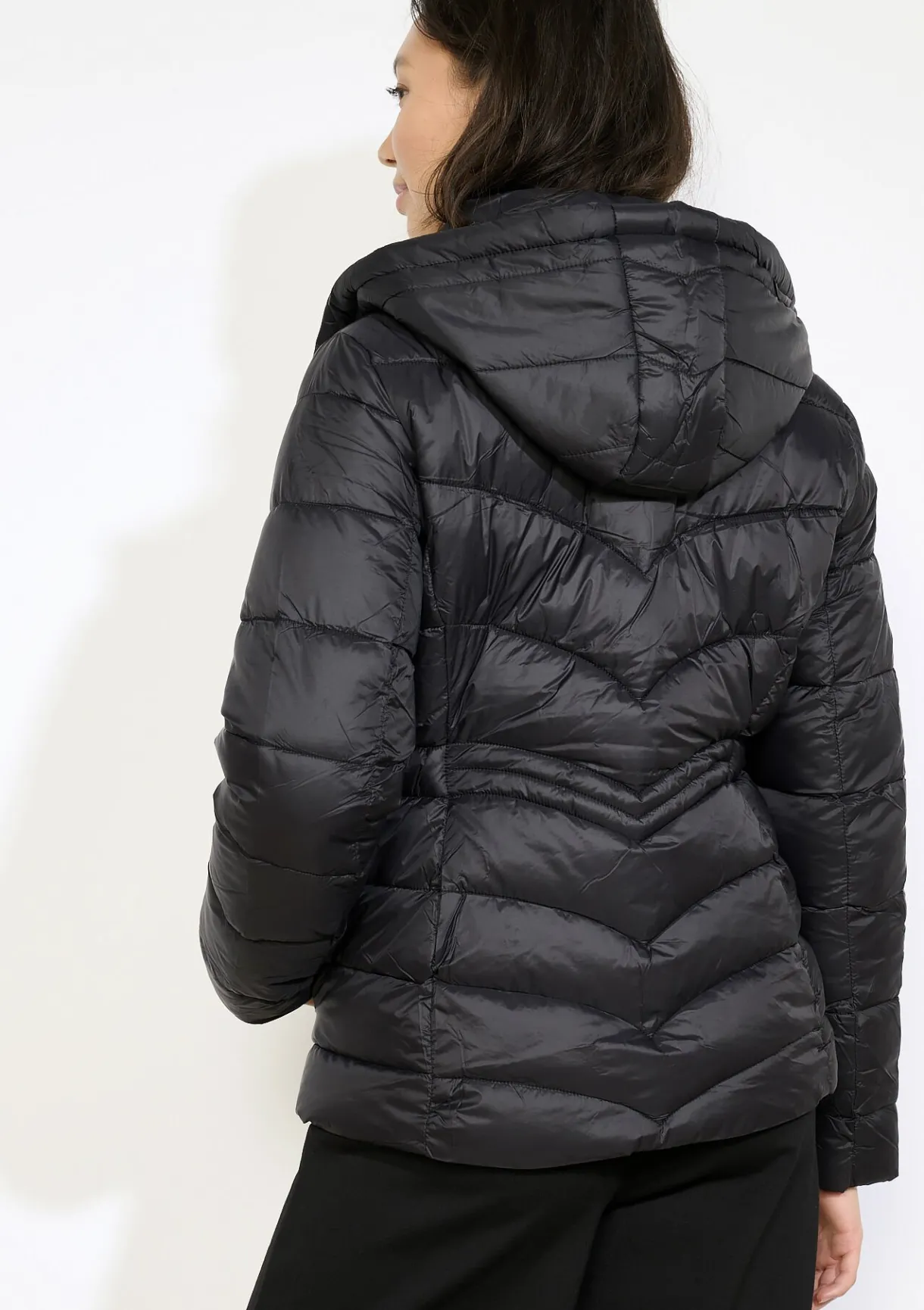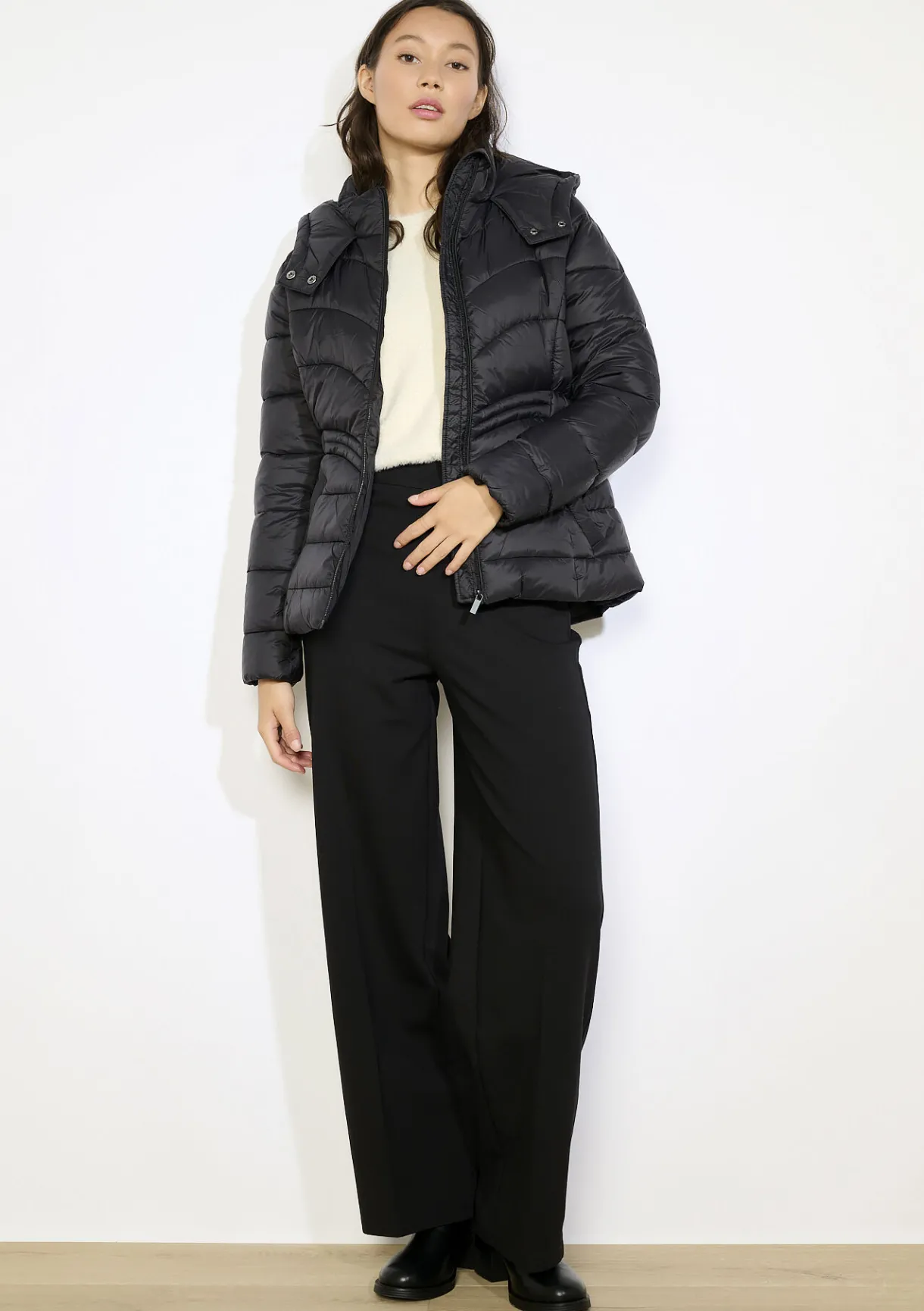 Korte gewatteerde jas met vaste capuchon en vrouwelijke pasvorm. Comfortabel en stijlvol voor elke winterdag.