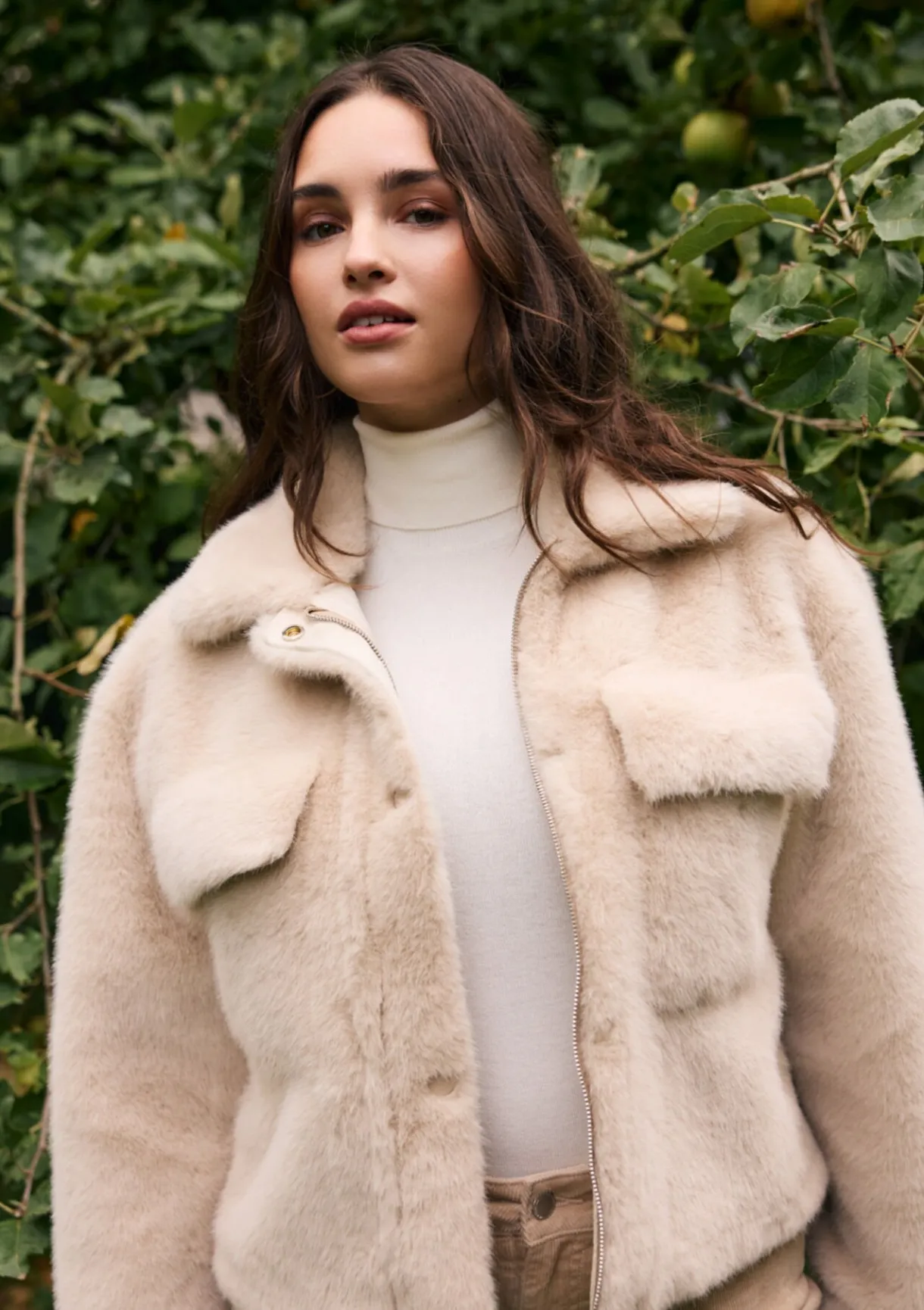 Deze korte jas van imitatiebont voelt luxueus aan. De strakke snit contrasteert prachtig met de aaibare textuur.