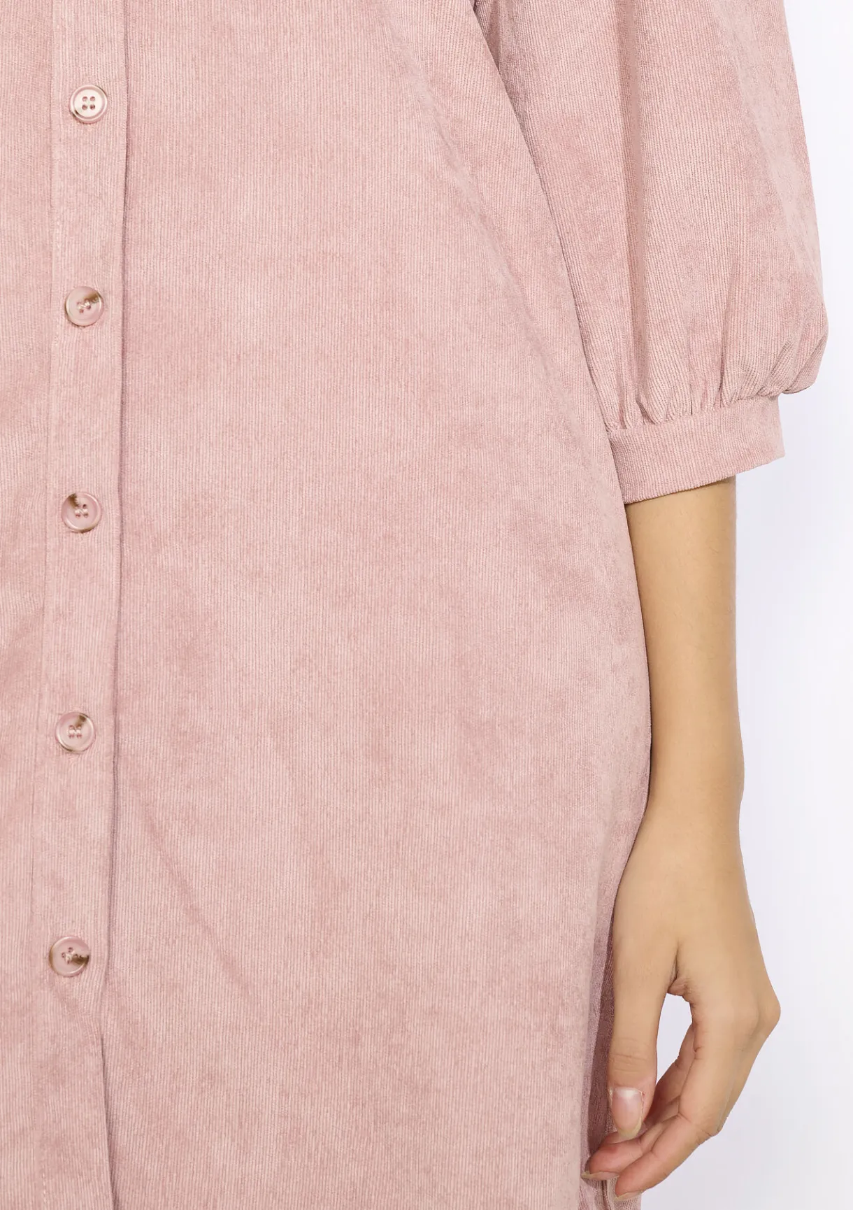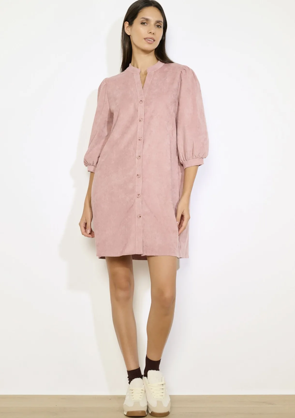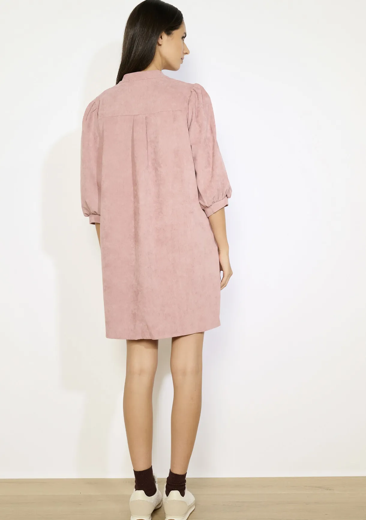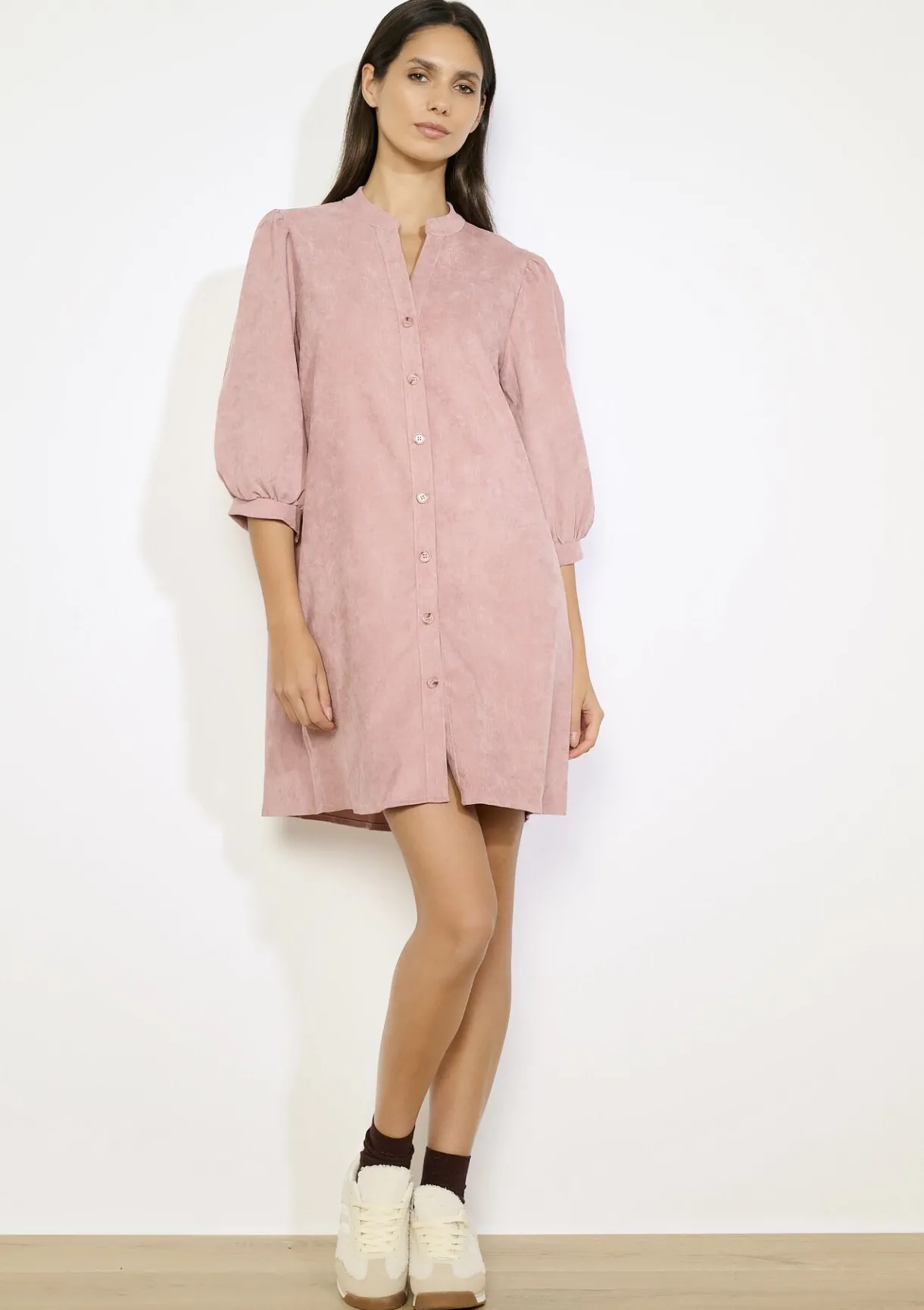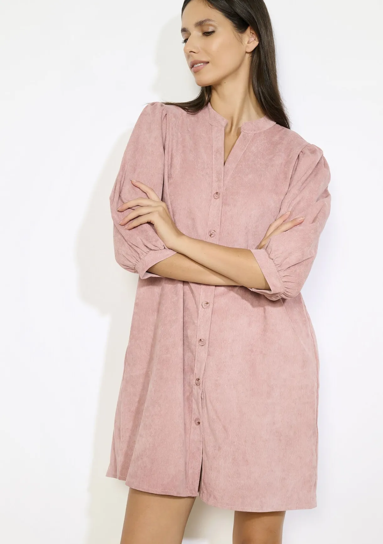 Deze ribfluwelen jurk met Tunesische kraag straalt subtiele elegantie uit.
