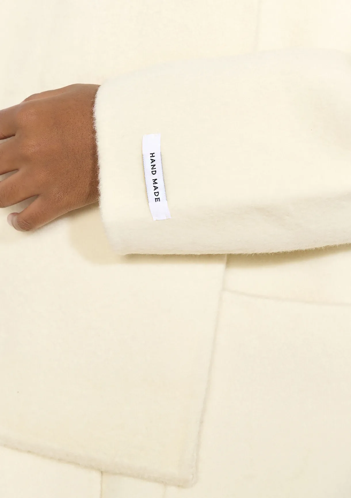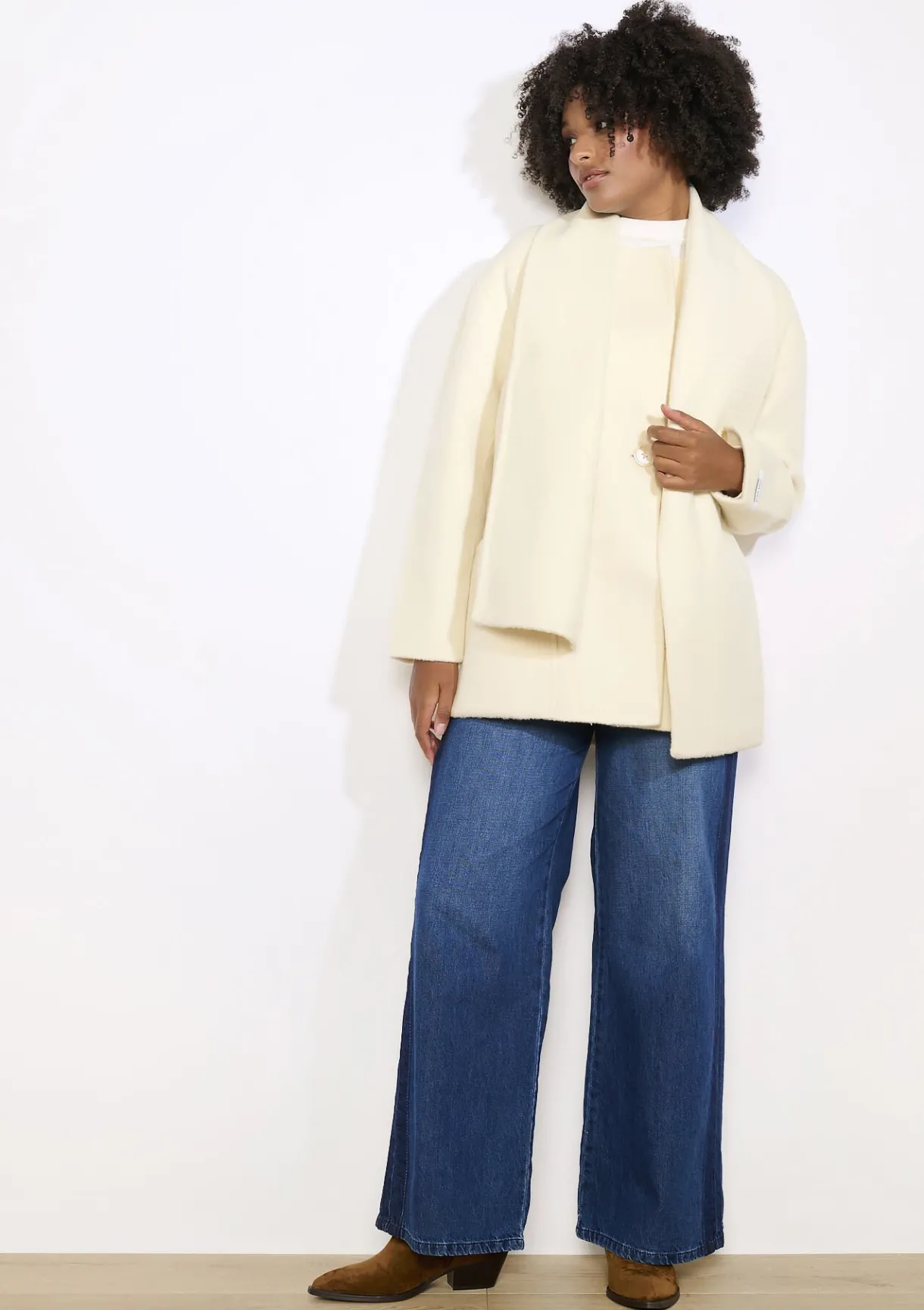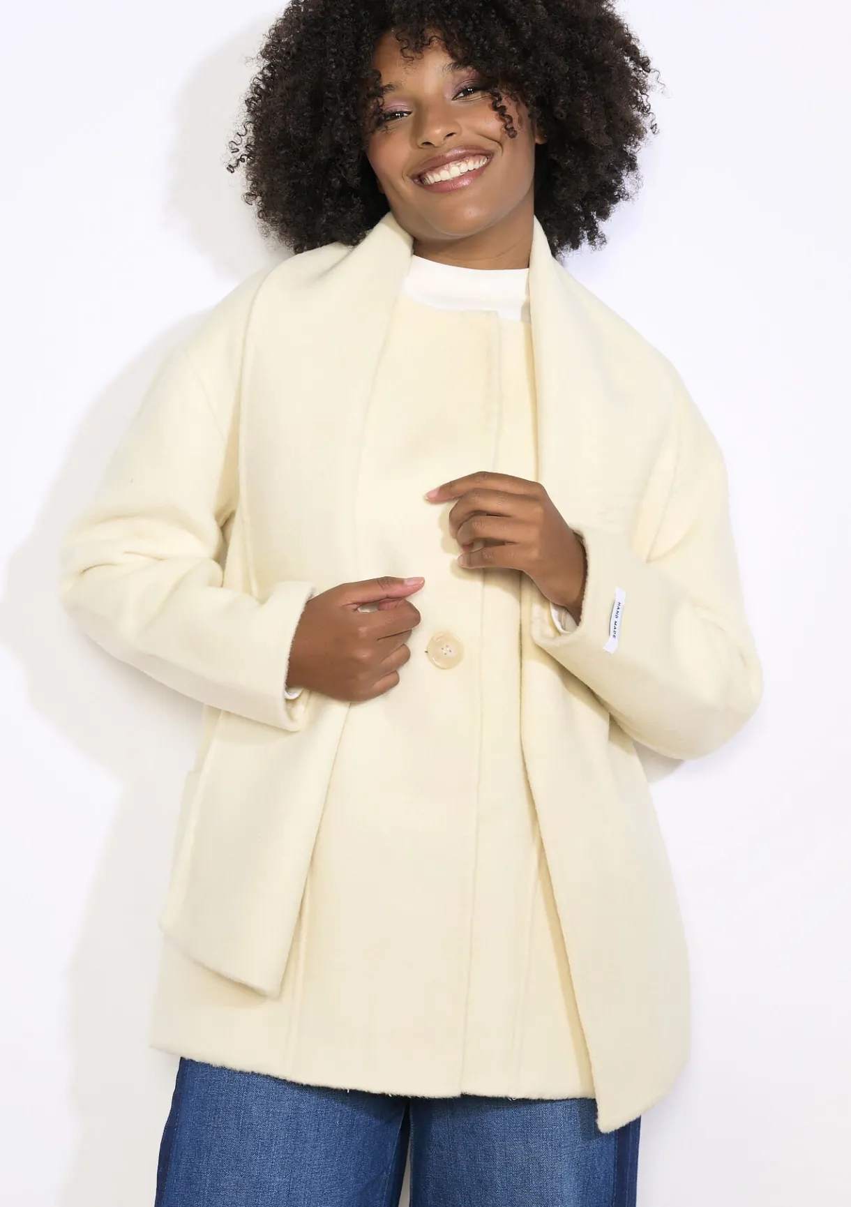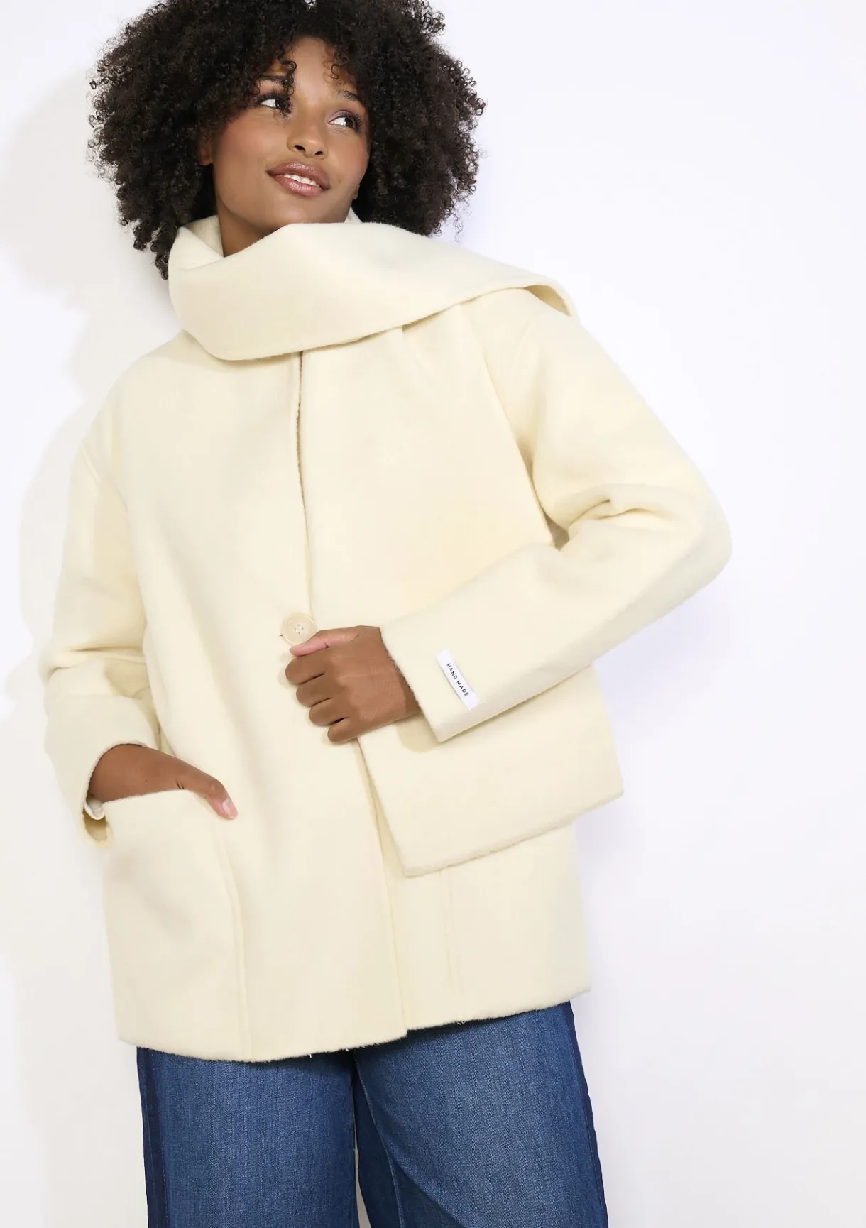 Deze korte jas met geïntegreerde sjaal combineert gestructureerde elegantie met een zachte, hedendaagse uitstraling.