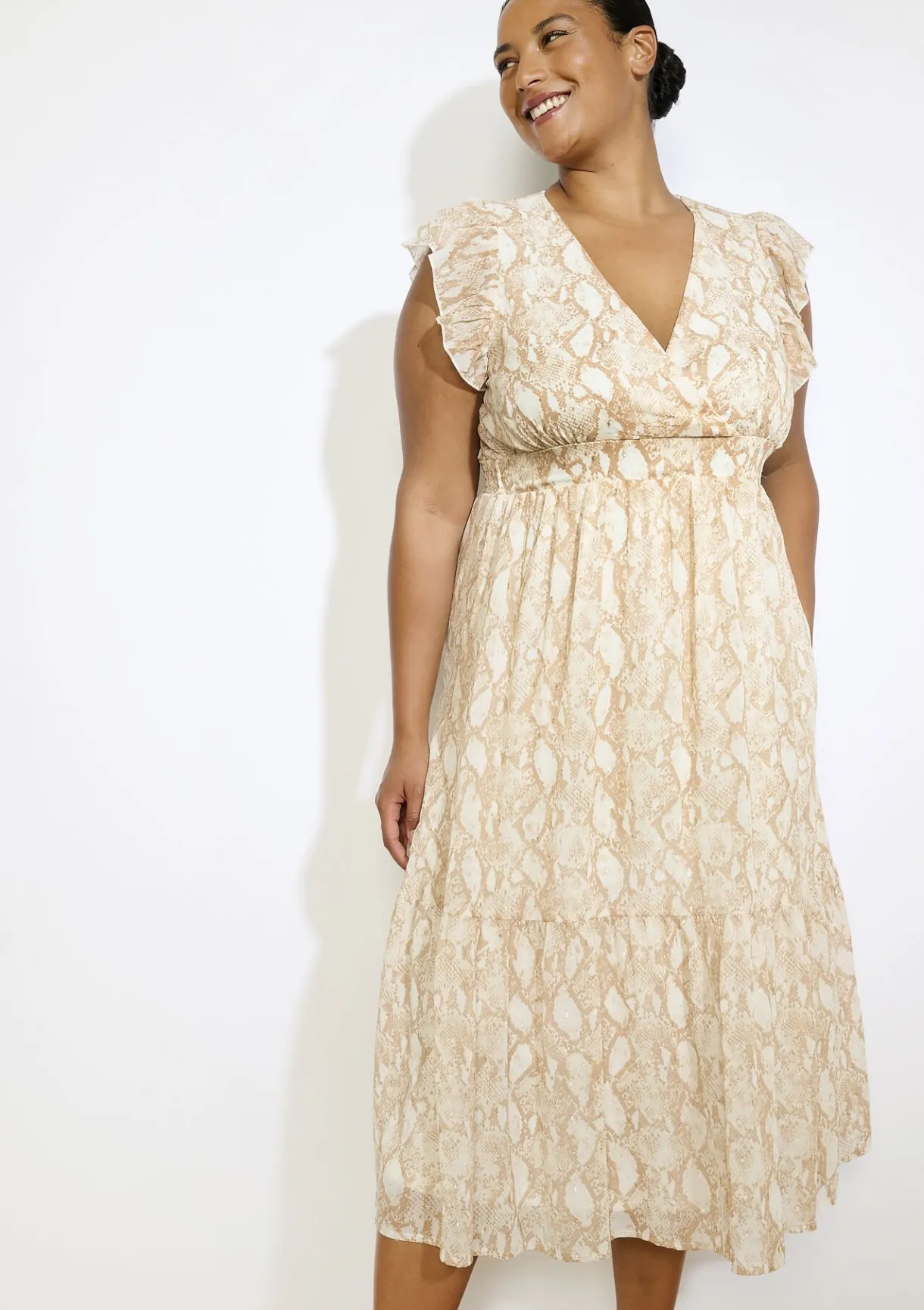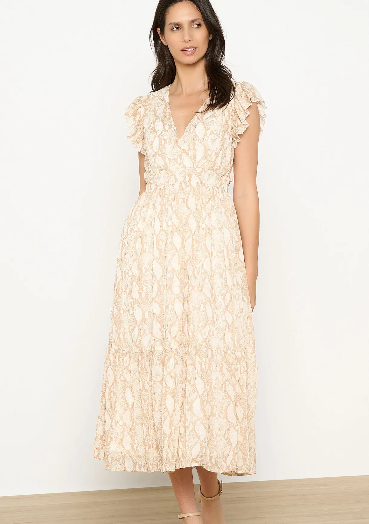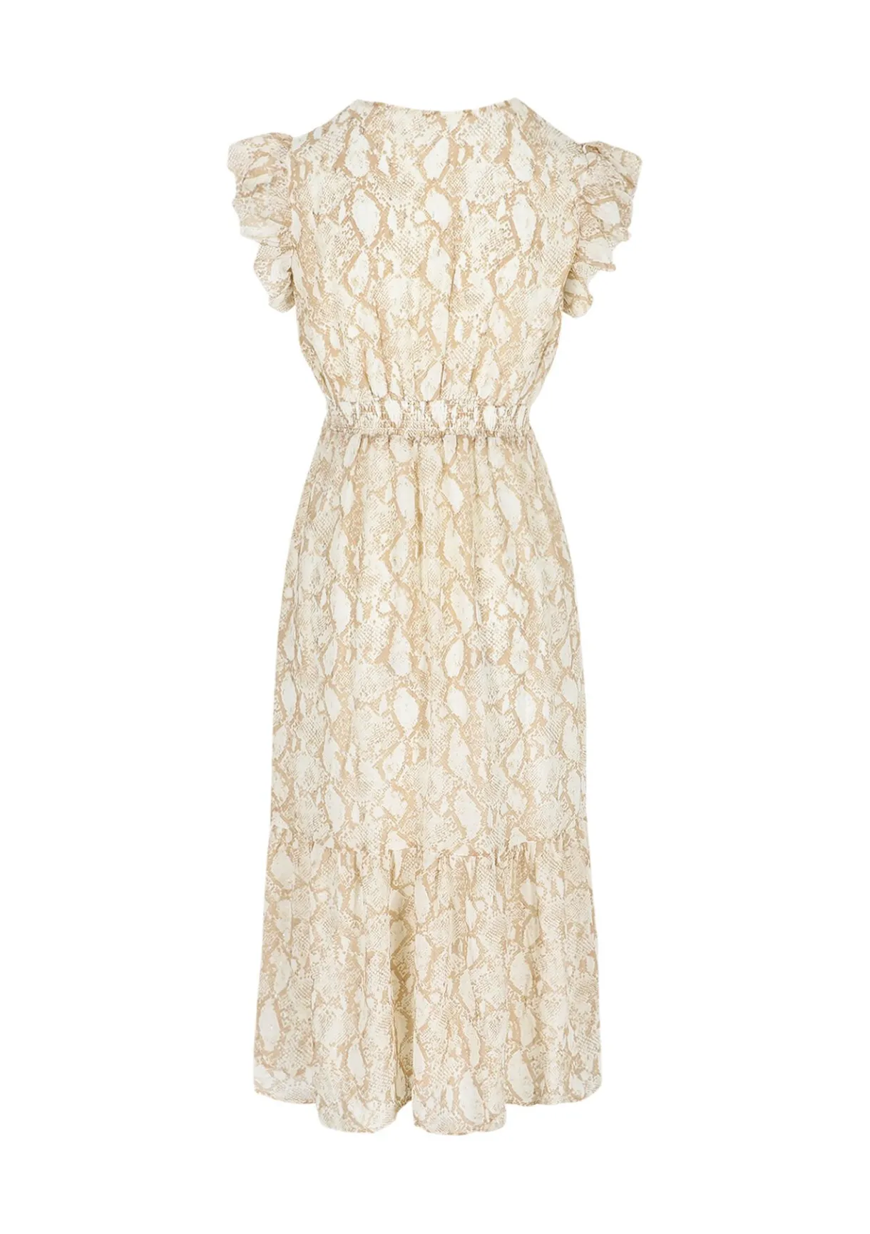 Een romantische lange jurk met een subtiele slangenprint. De V-halslijn, ruches en uitlopende snit geven een elegante uitstraling. Perfect voor een vrouwelijke en dromerige look.