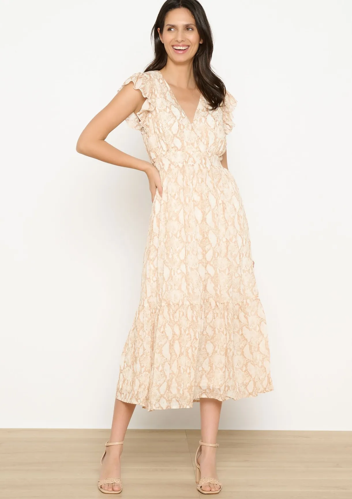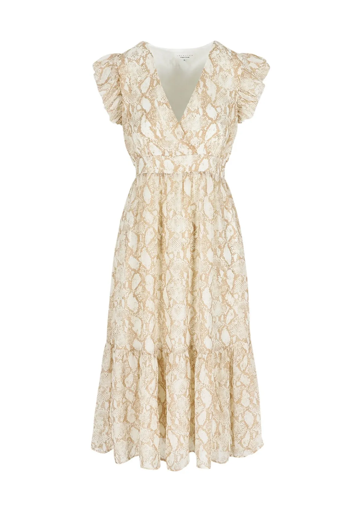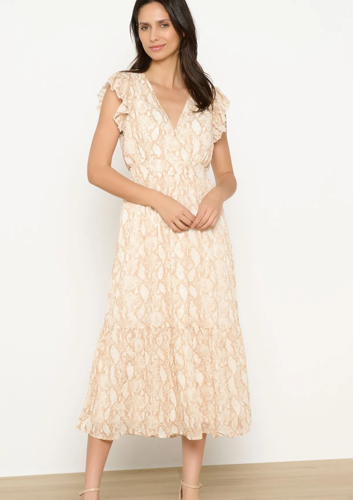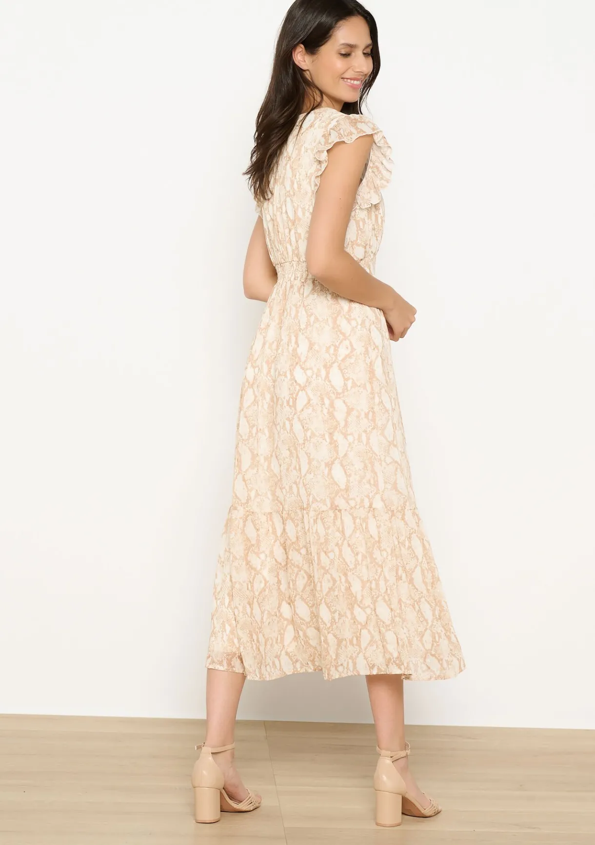 Een romantische lange jurk met een subtiele slangenprint. De V-halslijn, ruches en uitlopende snit geven een elegante uitstraling. Perfect voor een vrouwelijke en dromerige look.