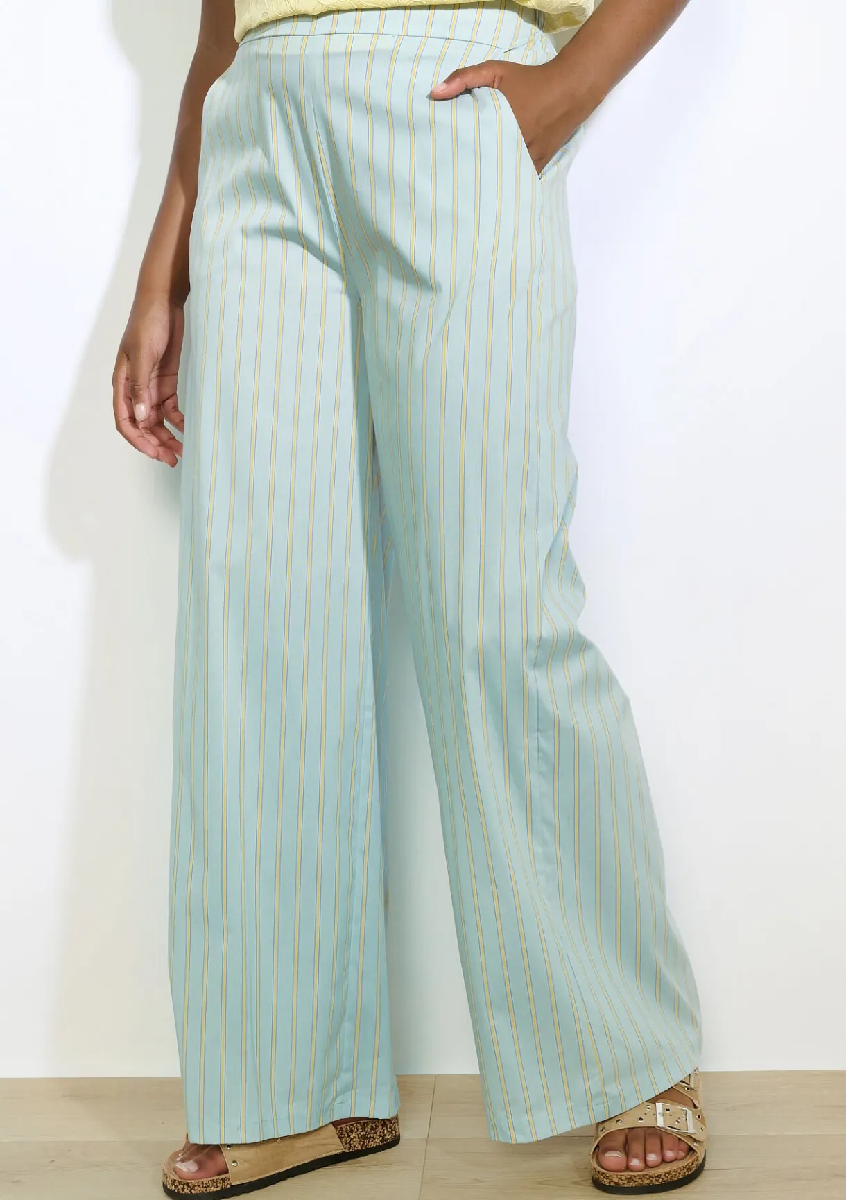 Wijde broek met subtiele pastelkleurige strepen. Luchtig materiaal voor een frisse, elegante look.