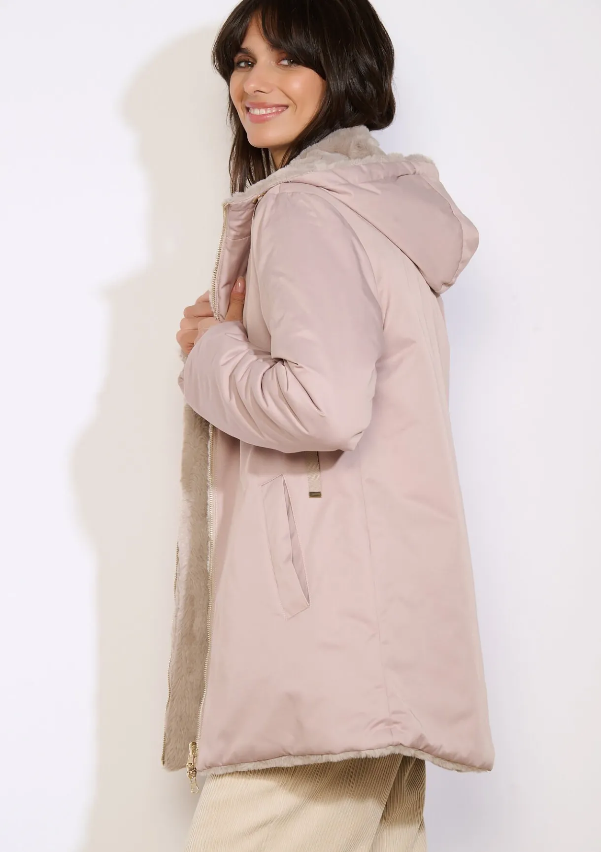 Deze gewatteerde parka met rits, capuchon en zachte imitatiebontvoering biedt comfort én stijl voor de koudste dagen van het seizoen.