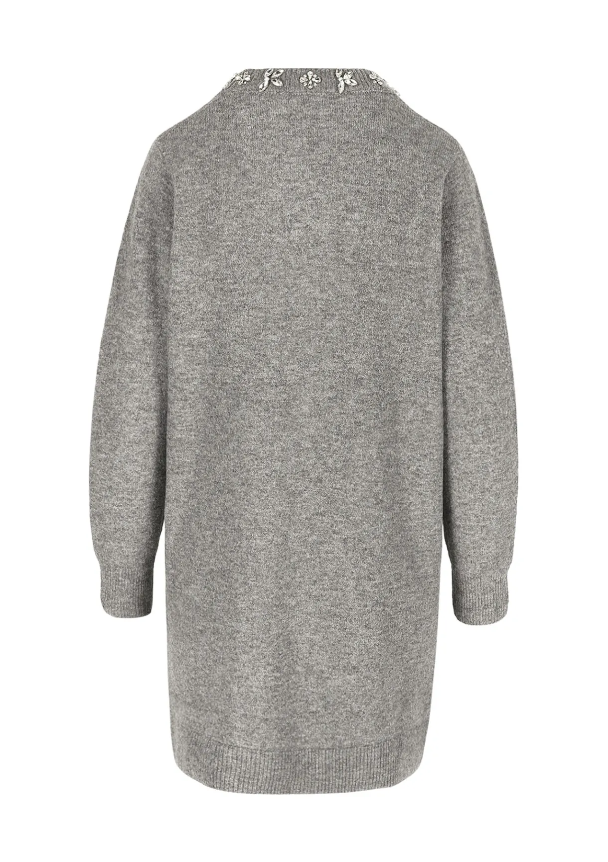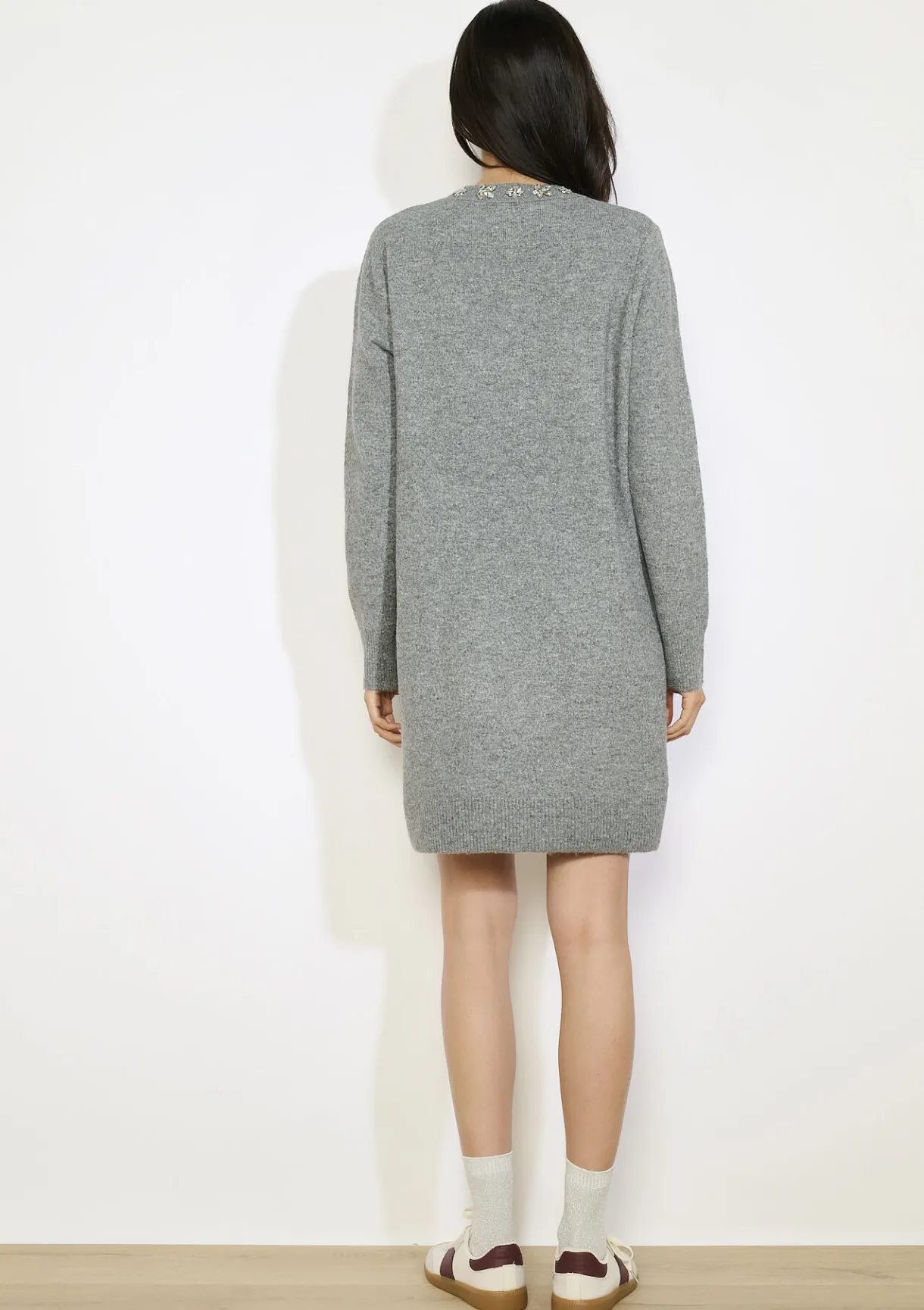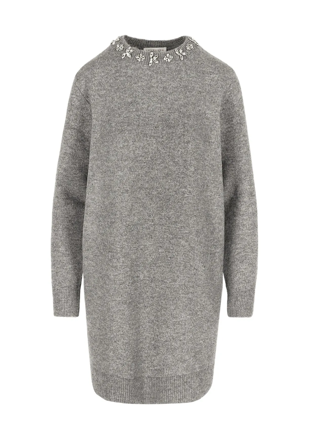 Een zachte rechte trui-jurk met sprankelende décolleté. Comfort en elegantie in één, perfect voor een moeiteloze chique look.