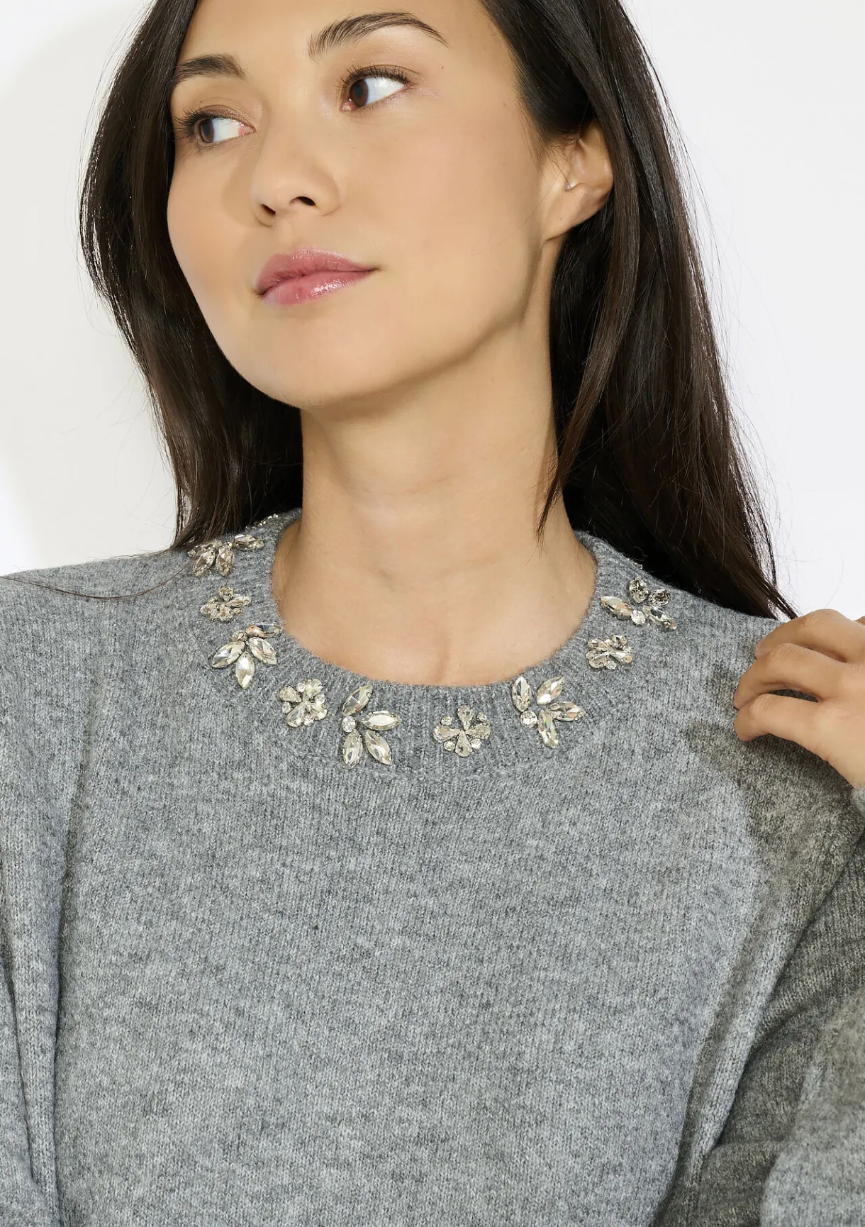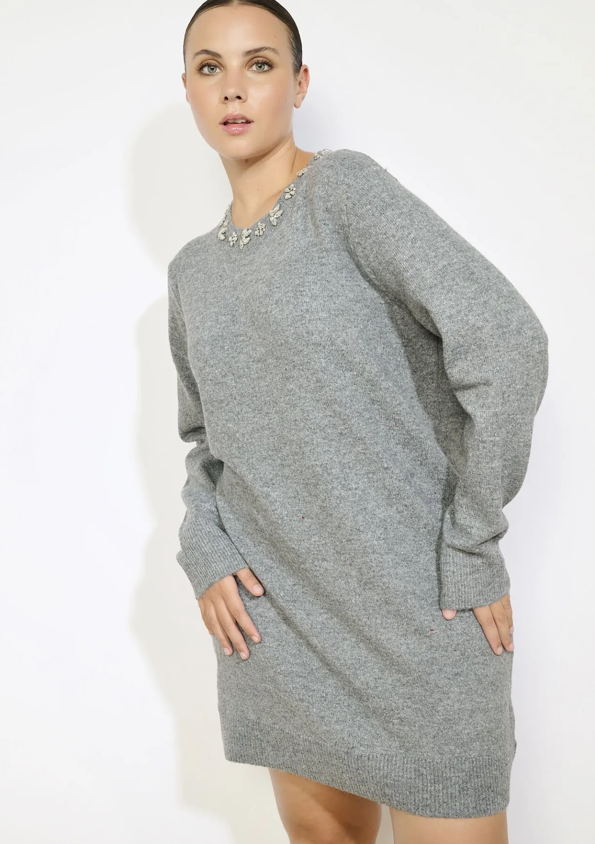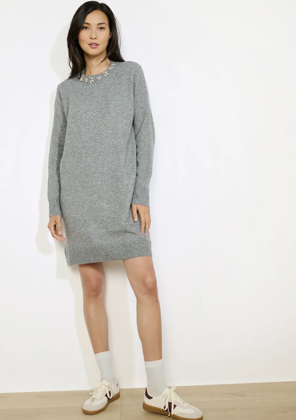 Een zachte rechte trui-jurk met sprankelende décolleté. Comfort en elegantie in één, perfect voor een moeiteloze chique look.