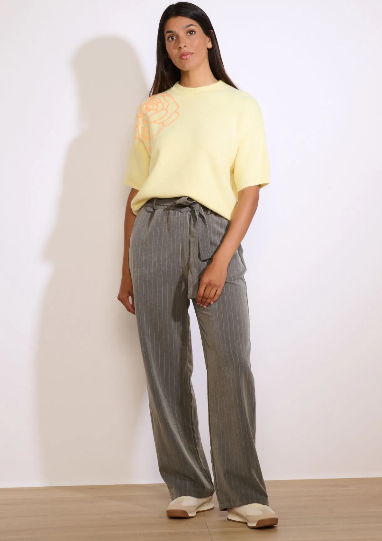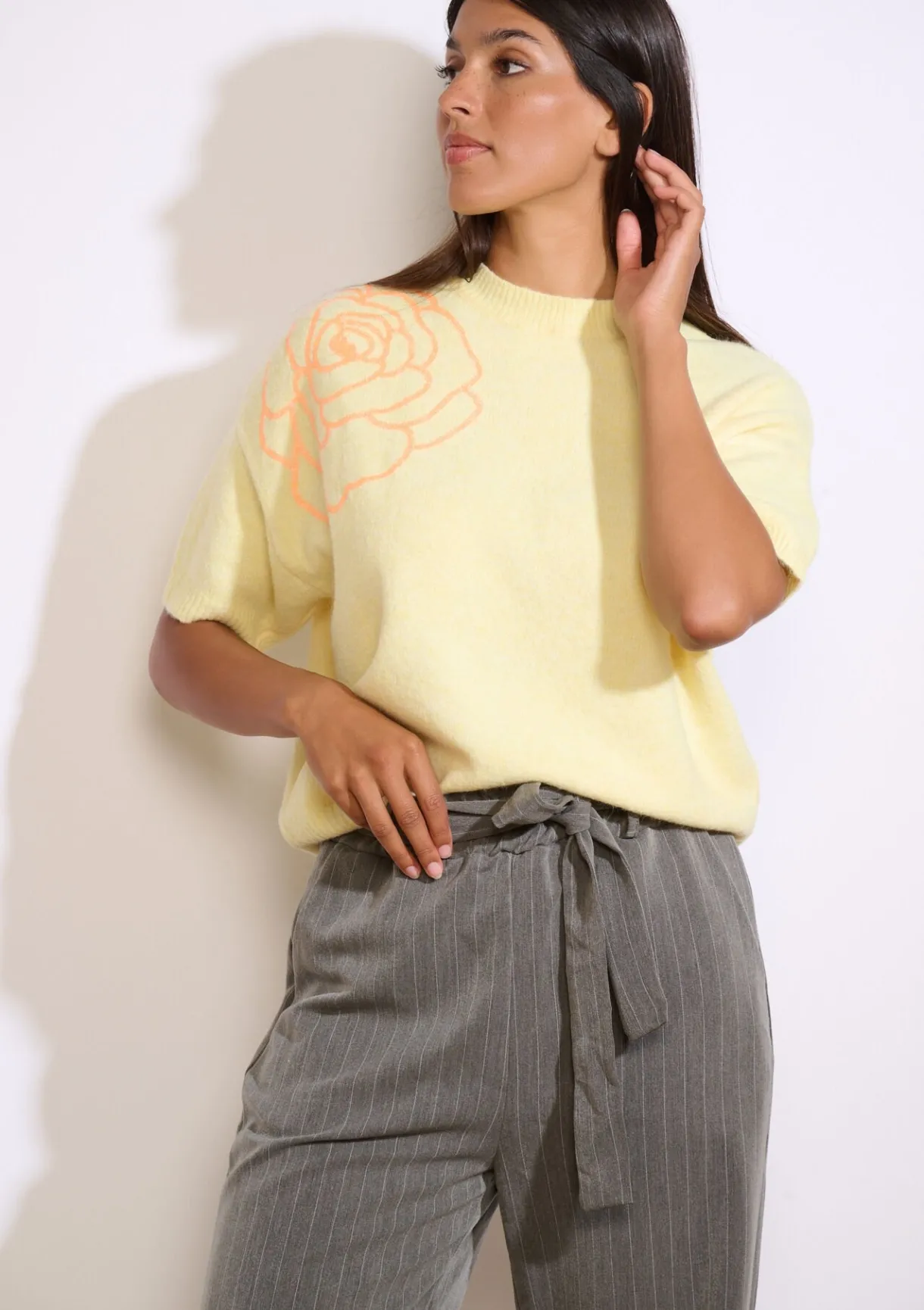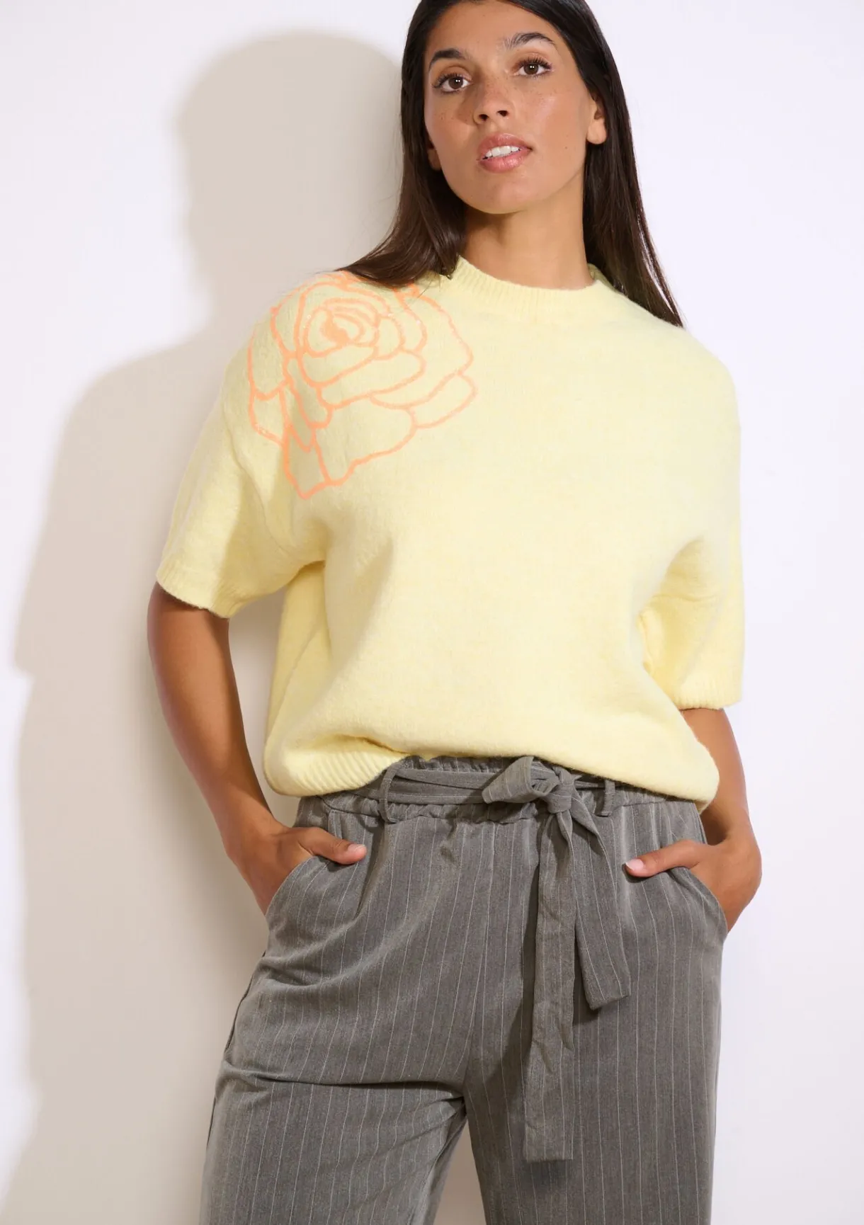 Zachte trui met korte mouwen en opvallend bloemenmotief. Een poëtisch accent voor je dagelijkse looks.