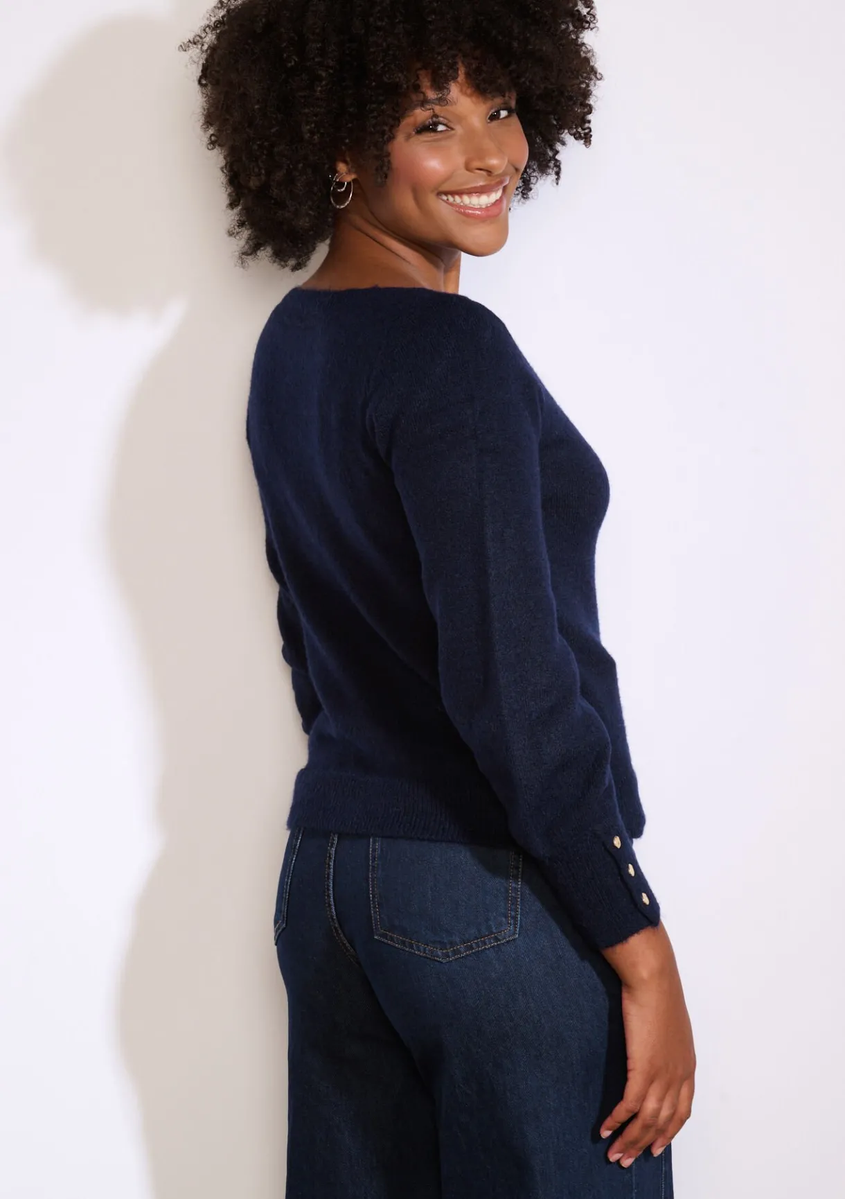 Elegante en zachte trui met licht gepofte mouwen en verfijnde knoopdetails voor een stijlvolle touch.