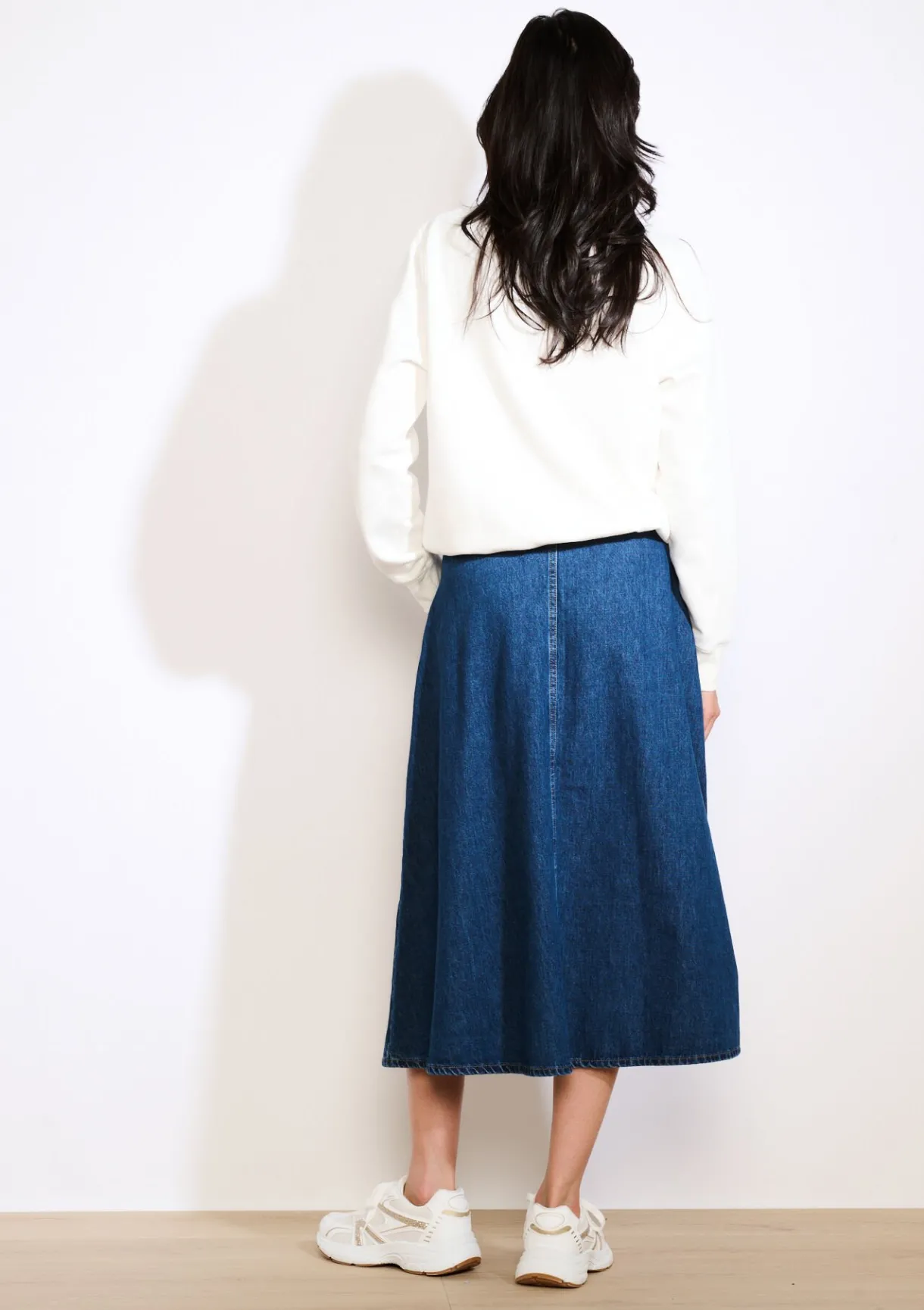 Een denim midi-rok met uitlopende snit ? moeiteloos te combineren met sneakers of laarsjes voor een moderne, relaxte look.